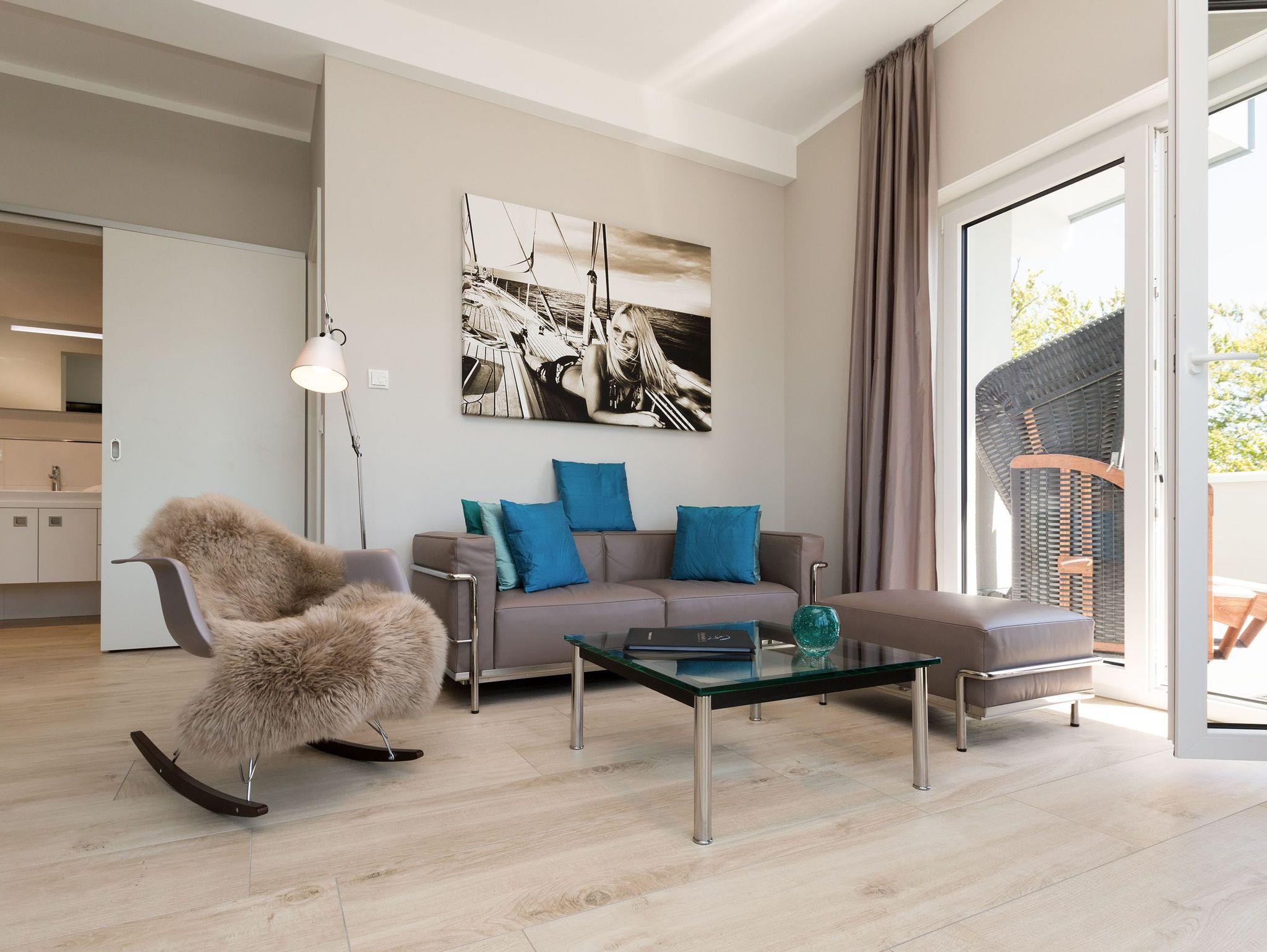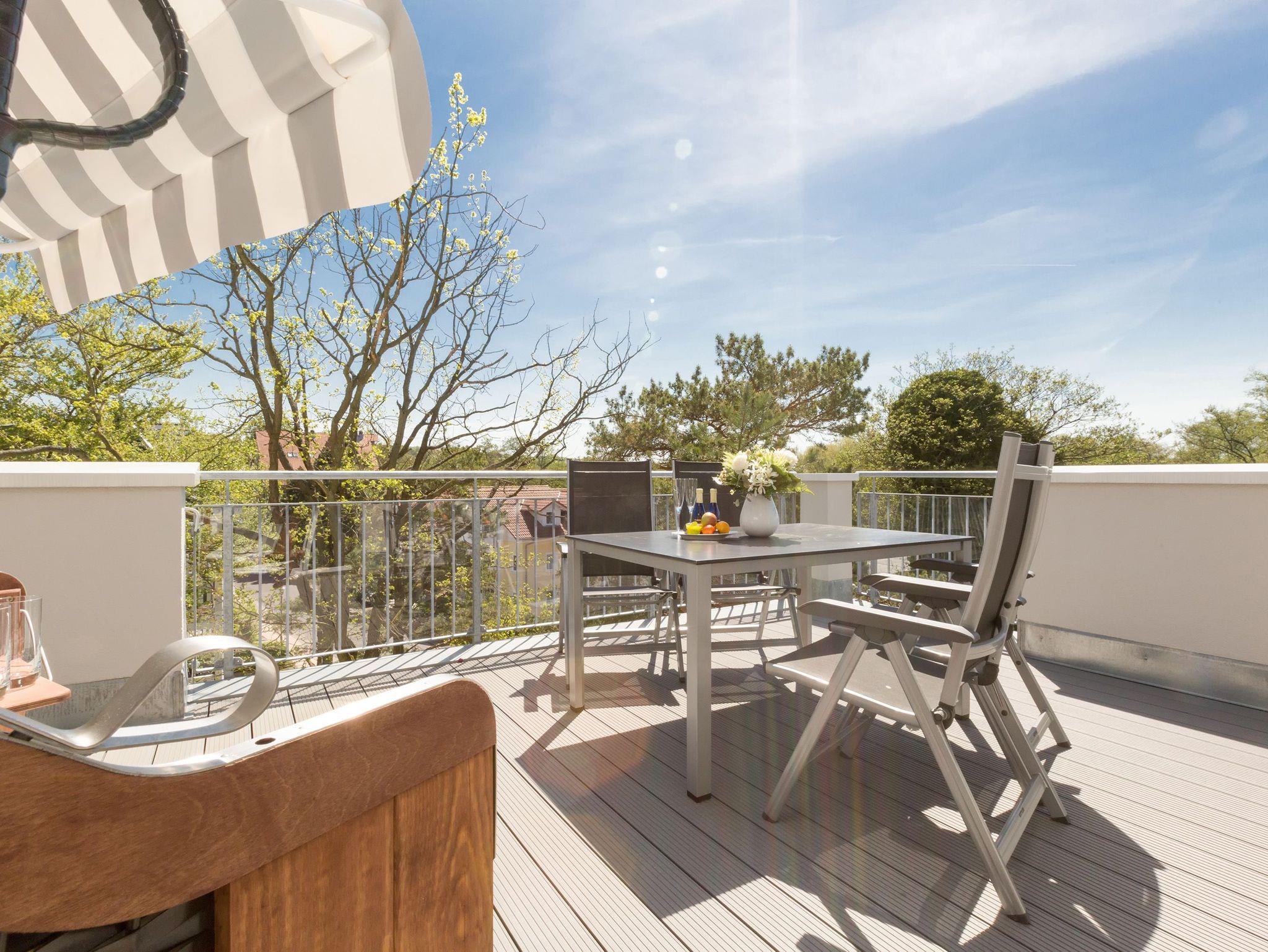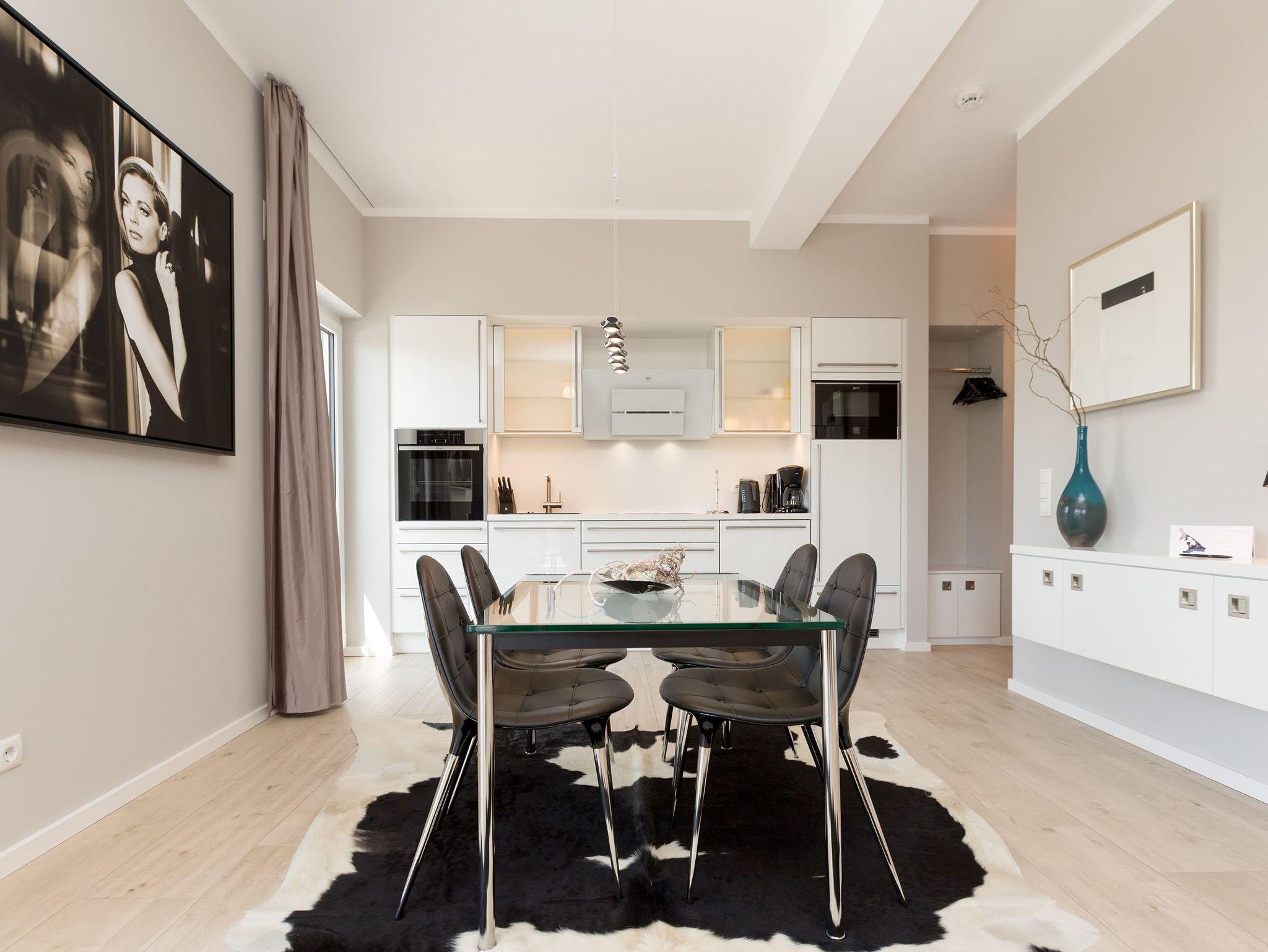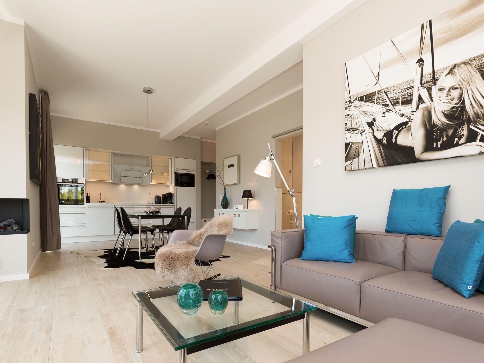 Design at it´s best! Im Appartement 21 genießen Sie Ihren Urlaub auf hohem Niveau. In dieser lichtdurchfluteten, luxuriösen 2-Raum-Ferienwohnung (64 qm) verstehen sich stylische Wohnelemente und wertiges Design von selbst. Abgestimmte Farben und Stoffe, ausgewählte Designermöbel von Cassina und die wunderschönen Fotocollagen sorgen für ein harmonisches Wohnerlebnis für 2 Personen und ein Kleinkind (im Babyreisebett). Der Eingangsbereich mit Garderobe öffnet sich und die offene, komplett ausgestattete Küche schließt sich an. Hier ist alles vorhanden, was ein Hobbykoch sich wünscht. Der schöne Essplatz ist der Mittelpunkt der Wohnung, hier lässt es sich besonders schön zusammen sitzen. Der Wohnbereich mit stylischer Couch und Flat-TV, Blue-Ray-Player und eine Hifi-Anlage mit ipod-Dock lädt zum Relaxen ein. Der moderne Elektrokamin schafft per Knopfdruck den perfekten Rahmen für einen kuschligen Abend. Das Schlafzimmer mit exklusivem Treca interiors Paris Doppelboxspringbett (1,80 x 2,00m), Flat-TV und wertigem Einbauschrank und ein Bad mit großer Dusche und WC ergänzt die Wohnung. Ein besonderes Highlight ihres Urlaubsdomizils ist die großzügige Ost-Süd-Dachterrasse. Mit Gartenmöbeln und gemütlichem Strandkorb ausgestattet, bietet sie schöne Ausblicke auf die Umgebung der Maxim-Gorki-Straße. Auch die Ostsee schimmert durch die Kiefern der Dünen. Erholung garantiert. Für Ihren Komfort sind die Betten bei der Anreise bezogen und Handtücher liegen bereit. Für kleine Gäste kann ein Kinderreisebett und ein Kinderhochstuhl (gegen Gebühr) bestellt werden. Ein Pkw-Stellplatz steht in der Tiefgarage zur Verfügung (max. Einfahrtshöhe 1,85 m).