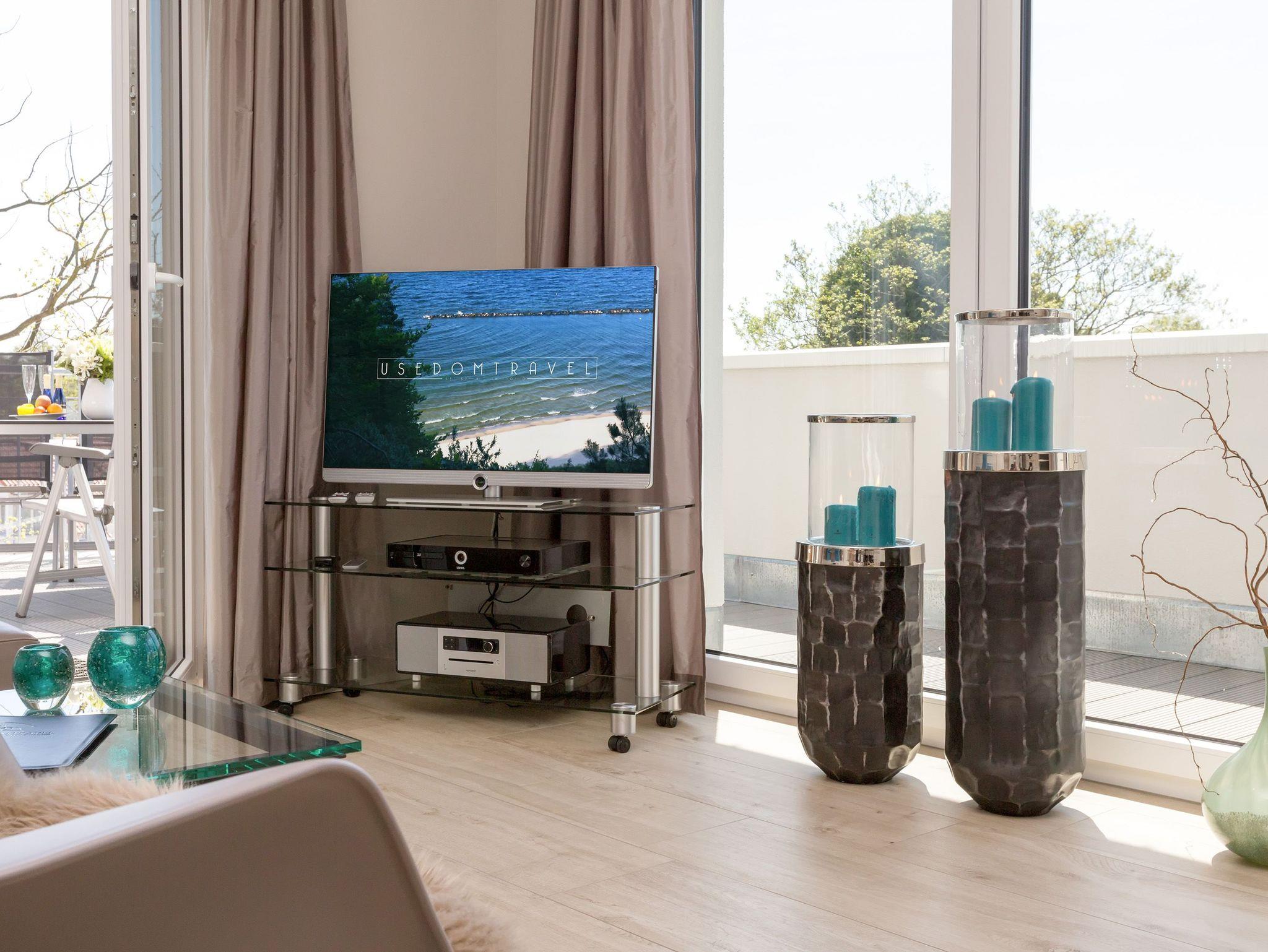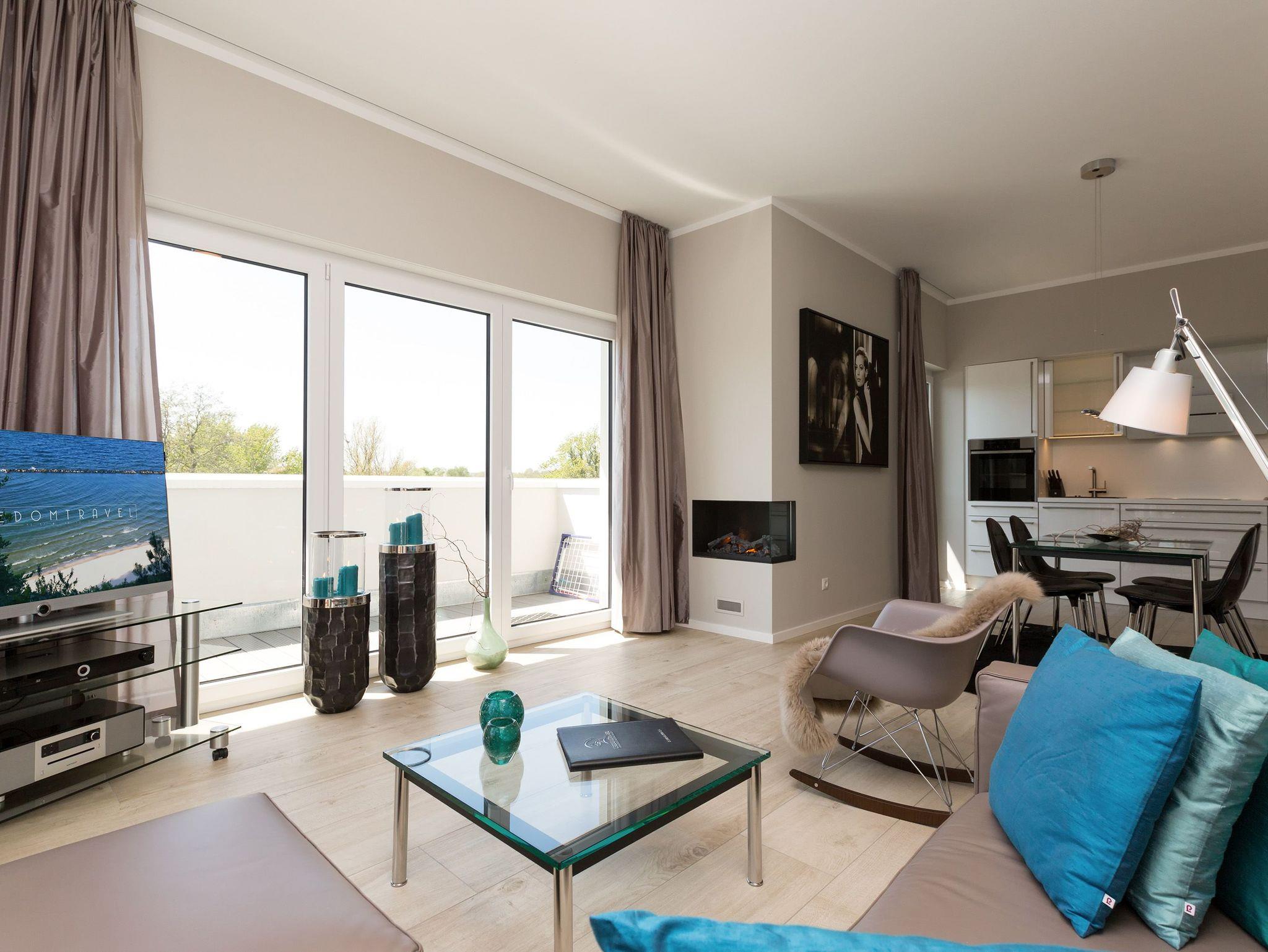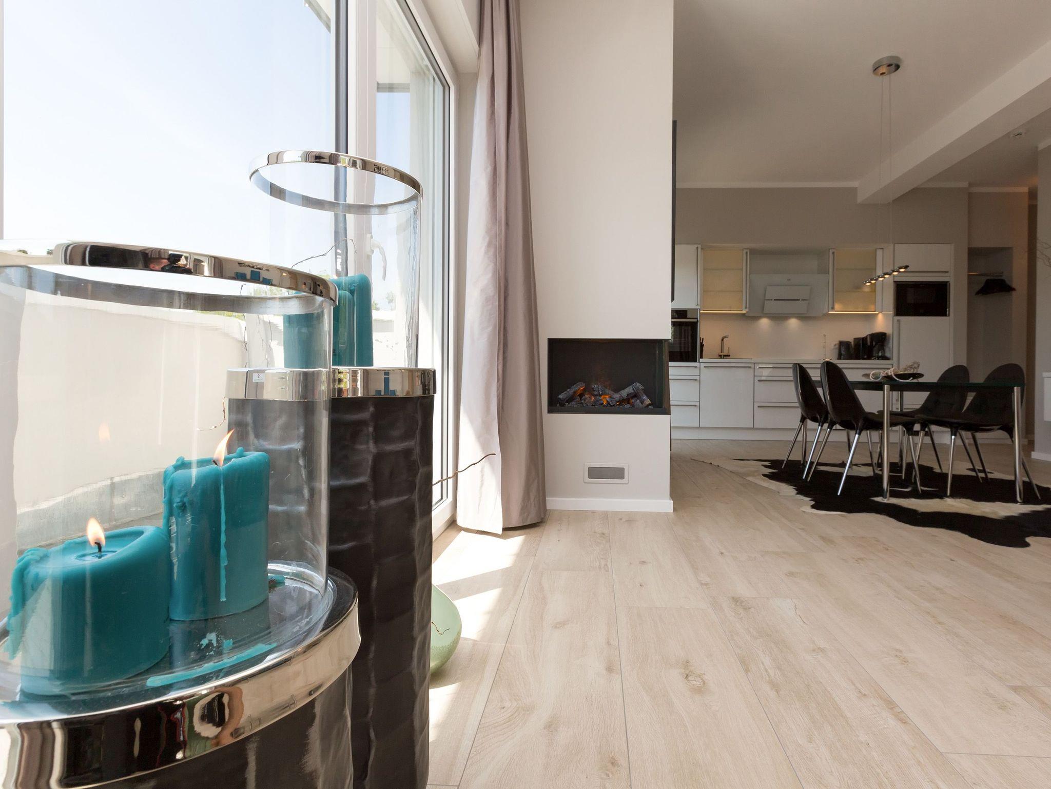 Design at it´s best! Im Appartement 21 genießen Sie Ihren Urlaub auf hohem Niveau. In dieser lichtdurchfluteten, luxuriösen 2-Raum-Ferienwohnung (64 qm) verstehen sich stylische Wohnelemente und wertiges Design von selbst. Abgestimmte Farben und Stoffe, ausgewählte Designermöbel von Cassina und die wunderschönen Fotocollagen sorgen für ein harmonisches Wohnerlebnis für 2 Personen und ein Kleinkind (im Babyreisebett). Der Eingangsbereich mit Garderobe öffnet sich und die offene, komplett ausgestattete Küche schließt sich an. Hier ist alles vorhanden, was ein Hobbykoch sich wünscht. Der schöne Essplatz ist der Mittelpunkt der Wohnung, hier lässt es sich besonders schön zusammen sitzen. Der Wohnbereich mit stylischer Couch und Flat-TV, Blue-Ray-Player und eine Hifi-Anlage mit ipod-Dock lädt zum Relaxen ein. Der moderne Elektrokamin schafft per Knopfdruck den perfekten Rahmen für einen kuschligen Abend. Das Schlafzimmer mit exklusivem Treca interiors Paris Doppelboxspringbett (1,80 x 2,00m), Flat-TV und wertigem Einbauschrank und ein Bad mit großer Dusche und WC ergänzt die Wohnung. Ein besonderes Highlight ihres Urlaubsdomizils ist die großzügige Ost-Süd-Dachterrasse. Mit Gartenmöbeln und gemütlichem Strandkorb ausgestattet, bietet sie schöne Ausblicke auf die Umgebung der Maxim-Gorki-Straße. Auch die Ostsee schimmert durch die Kiefern der Dünen. Erholung garantiert. Für Ihren Komfort sind die Betten bei der Anreise bezogen und Handtücher liegen bereit. Für kleine Gäste kann ein Kinderreisebett und ein Kinderhochstuhl (gegen Gebühr) bestellt werden. Ein Pkw-Stellplatz steht in der Tiefgarage zur Verfügung (max. Einfahrtshöhe 1,85 m).