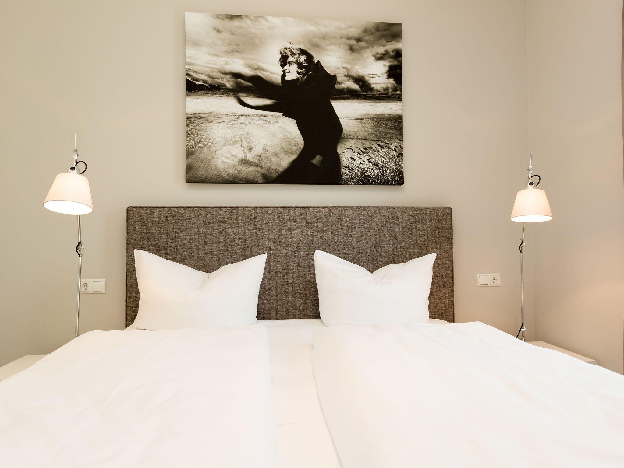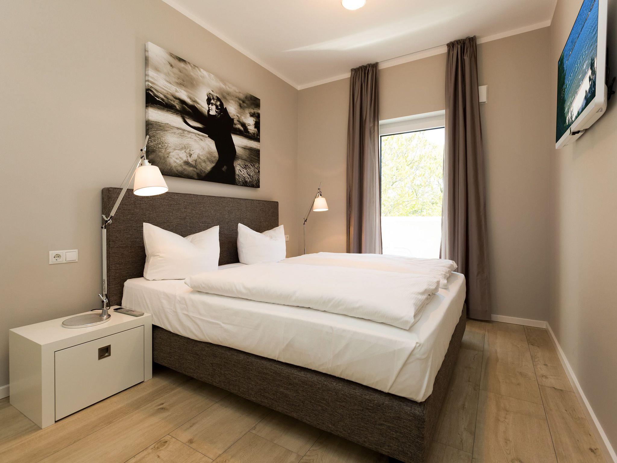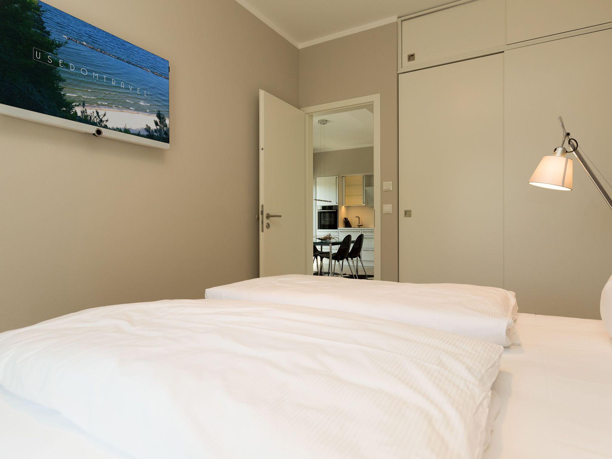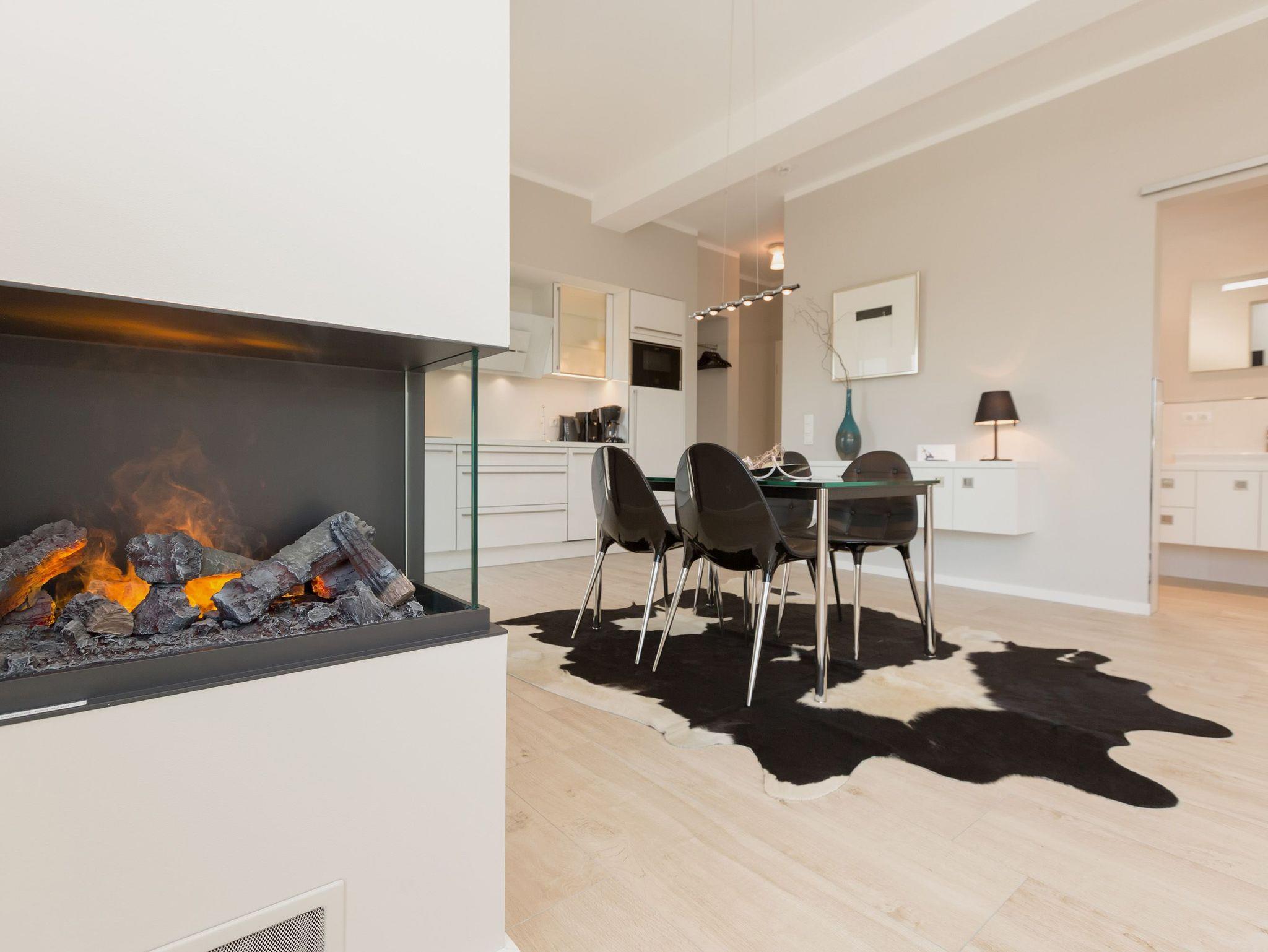 Design at it´s best! Im Appartement 21 genießen Sie Ihren Urlaub auf hohem Niveau. In dieser lichtdurchfluteten, luxuriösen 2-Raum-Ferienwohnung (64 qm) verstehen sich stylische Wohnelemente und wertiges Design von selbst. Abgestimmte Farben und Stoffe, ausgewählte Designermöbel von Cassina und die wunderschönen Fotocollagen sorgen für ein harmonisches Wohnerlebnis für 2 Personen und ein Kleinkind (im Babyreisebett). Der Eingangsbereich mit Garderobe öffnet sich und die offene, komplett ausgestattete Küche schließt sich an. Hier ist alles vorhanden, was ein Hobbykoch sich wünscht. Der schöne Essplatz ist der Mittelpunkt der Wohnung, hier lässt es sich besonders schön zusammen sitzen. Der Wohnbereich mit stylischer Couch und Flat-TV, Blue-Ray-Player und eine Hifi-Anlage mit ipod-Dock lädt zum Relaxen ein. Der moderne Elektrokamin schafft per Knopfdruck den perfekten Rahmen für einen kuschligen Abend. Das Schlafzimmer mit exklusivem Treca interiors Paris Doppelboxspringbett (1,80 x 2,00m), Flat-TV und wertigem Einbauschrank und ein Bad mit großer Dusche und WC ergänzt die Wohnung. Ein besonderes Highlight ihres Urlaubsdomizils ist die großzügige Ost-Süd-Dachterrasse. Mit Gartenmöbeln und gemütlichem Strandkorb ausgestattet, bietet sie schöne Ausblicke auf die Umgebung der Maxim-Gorki-Straße. Auch die Ostsee schimmert durch die Kiefern der Dünen. Erholung garantiert. Für Ihren Komfort sind die Betten bei der Anreise bezogen und Handtücher liegen bereit. Für kleine Gäste kann ein Kinderreisebett und ein Kinderhochstuhl (gegen Gebühr) bestellt werden. Ein Pkw-Stellplatz steht in der Tiefgarage zur Verfügung (max. Einfahrtshöhe 1,85 m).