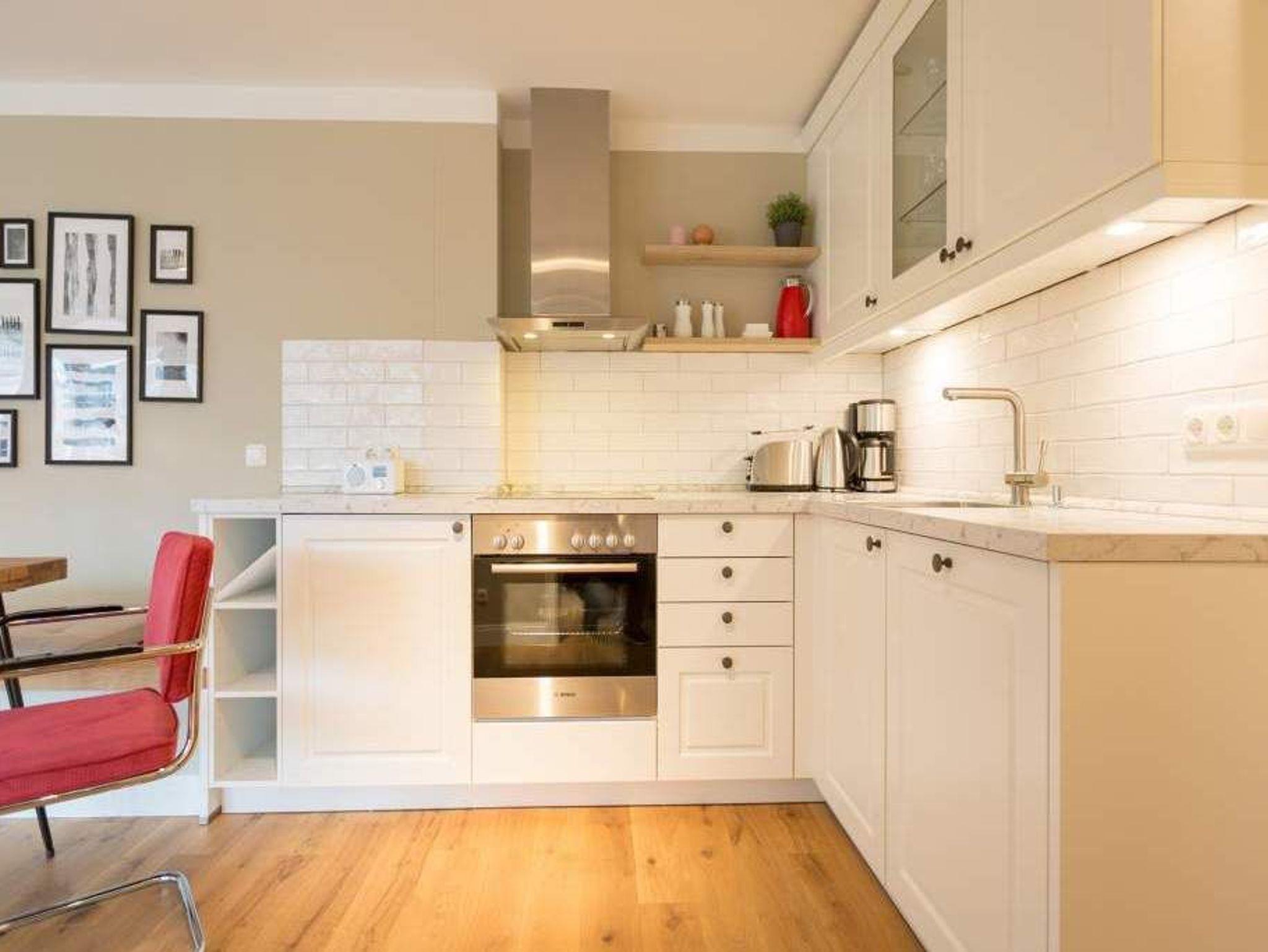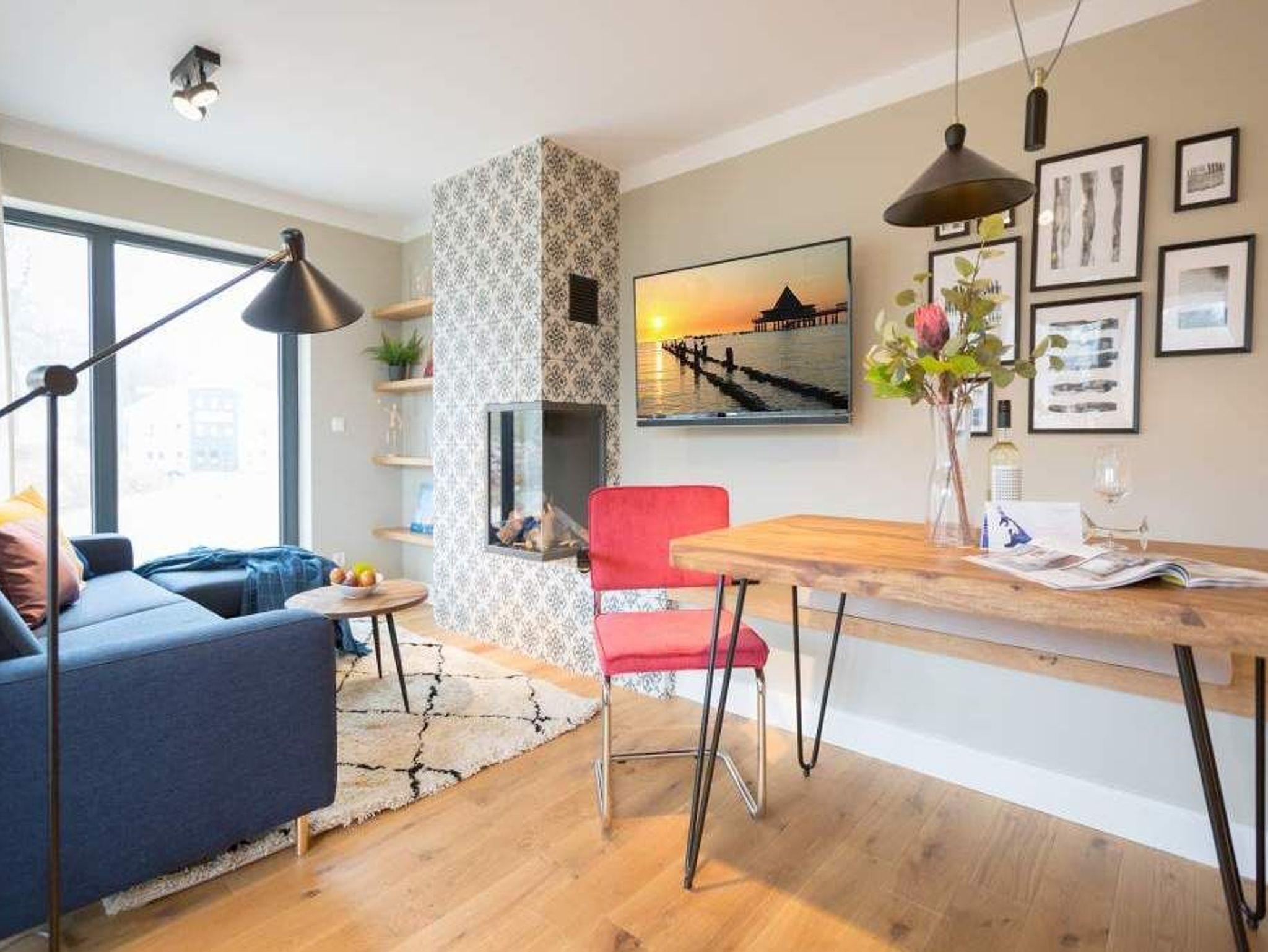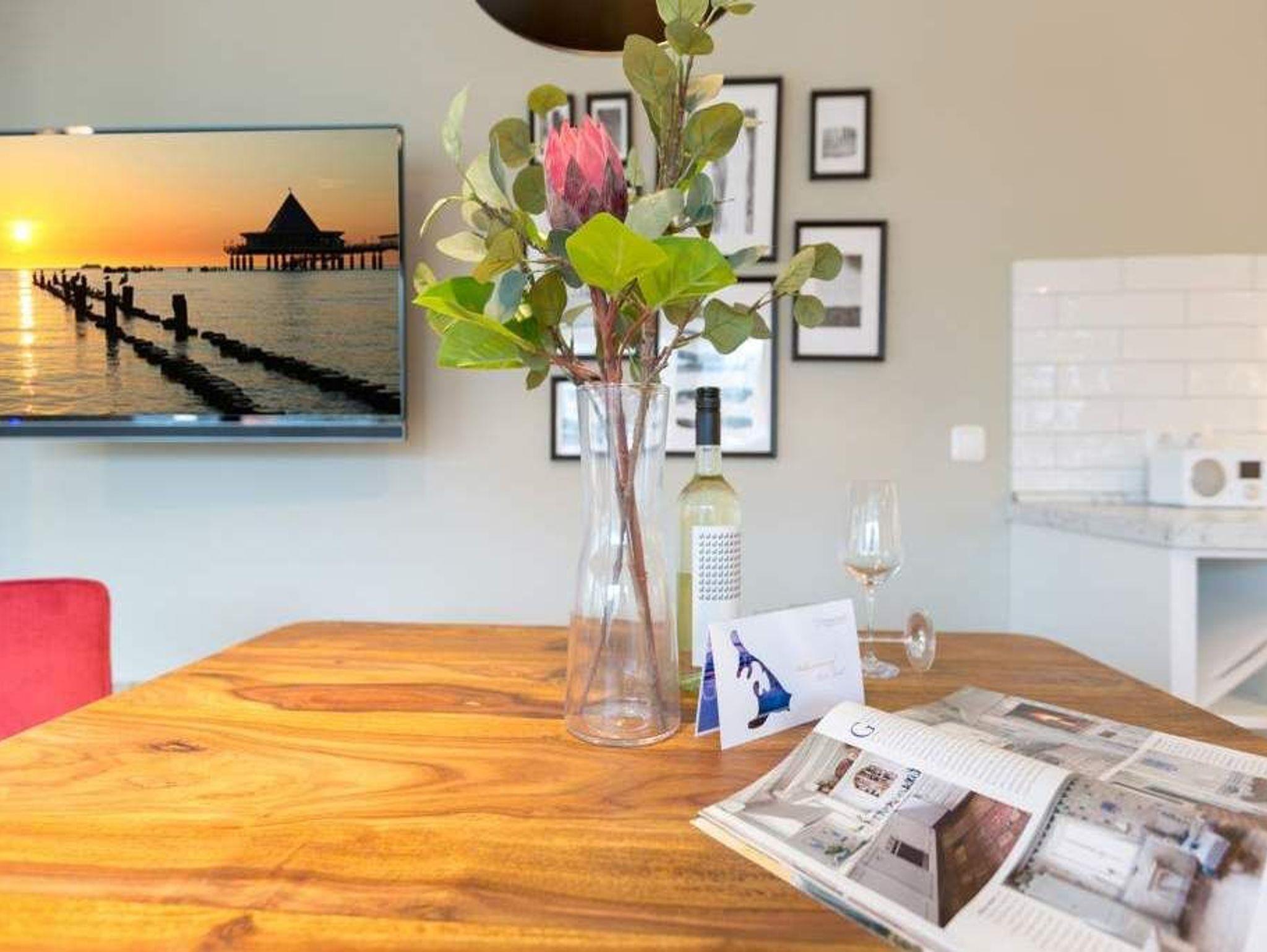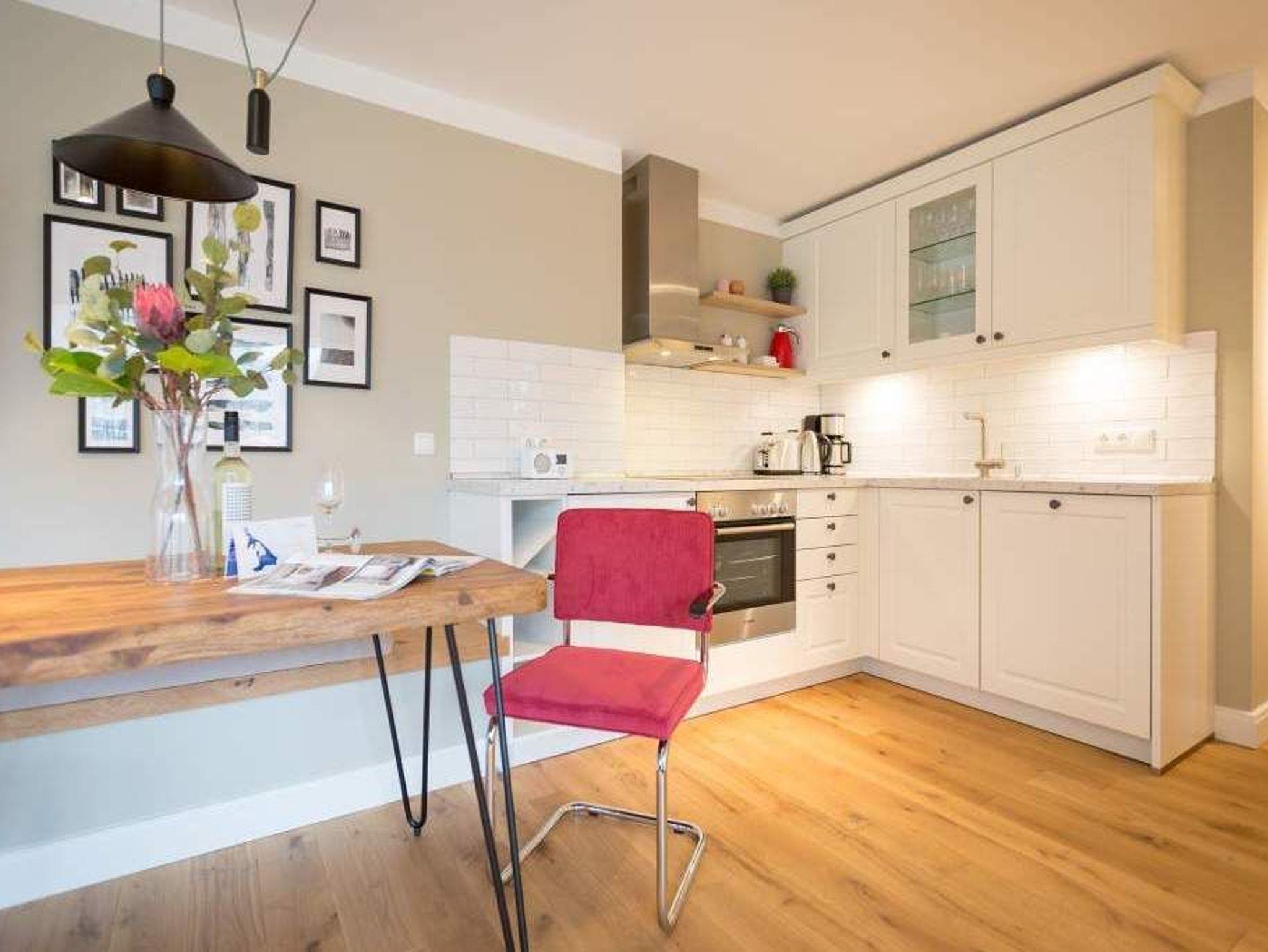Endlich einmal wieder Zeit zu zweit oder einfach nur für sich ? dieses kleine und kuschelige Urlaubsparadies im Dachgeschoss der Villa Bellevue ist der ideale Ort, auszuspannen und sich zu erholen. Das Zwei-Zimmer-Appartement bietet mit seinen 50 Quadratmetern Platz für zwei Personen. Hell und stilvoll von einer Innenarchitektin konzipiert, sind der Stress und die Hektik des Alltags binnen kurzer Zeit vergessen. Vom ausgewogenen Farbkonzept bis zu den Design-Möbeln ist alles harmonisch aufeinander abgestimmt. Der offene Wohn-Essbereich lädt mit einer gemütlichen Sofalandschaft zum Loslassen ein. Ein wunderschöner Gas-Kamin mit Vintage-Fliesenoptik spendet an kühlen Abenden und stürmischen Tagen Wärme und Geborgenheit. Ganze 42 Zoll misst der Flat-TV. Vom Wohnzimmer aus haben Sie Zugang zum Balkon. Was gibt es schöneres als unter freiem Himmel in der Morgensonne zu frühstücken. Zum Essen können Sie sich natürlich an den schönen Echtholztisch mit den trendig roten Freischwingern setzen. Die Küche ist mit allem ausgestattet, was Sie zur Zubereitung eines genussvollen Menü benötigen könnten ? inklusive elegantem Geschirr. Vergnügen bereitet das große und komfortable Boxspringdoppelbett (1,80 m x 2,00 m) im Schlafzimmer. Viel Platz für die Urlaubsgarderobe bietet hier der hochwertige Einbauschrank. Das Badezimmer verfügt über eine geräumige Dusche, einen Waschtisch und ein WC. Die Handtücher liegen bei der Anreise bereit und die Betten sind bezogen. Das WLAN ist kostenfrei. Für Ihr Auto gibt es am Haus einen Stellplatz.