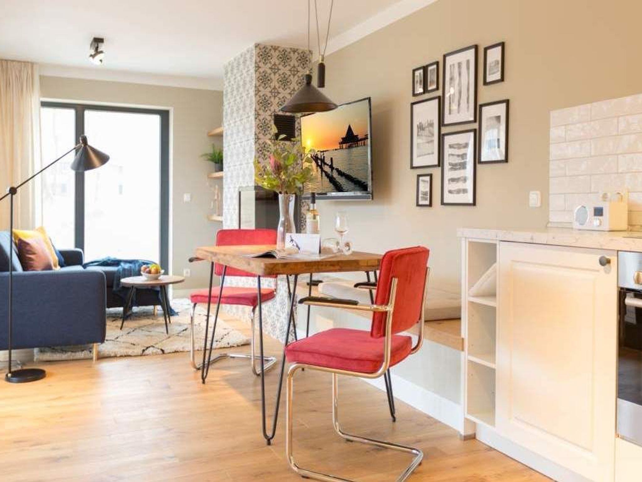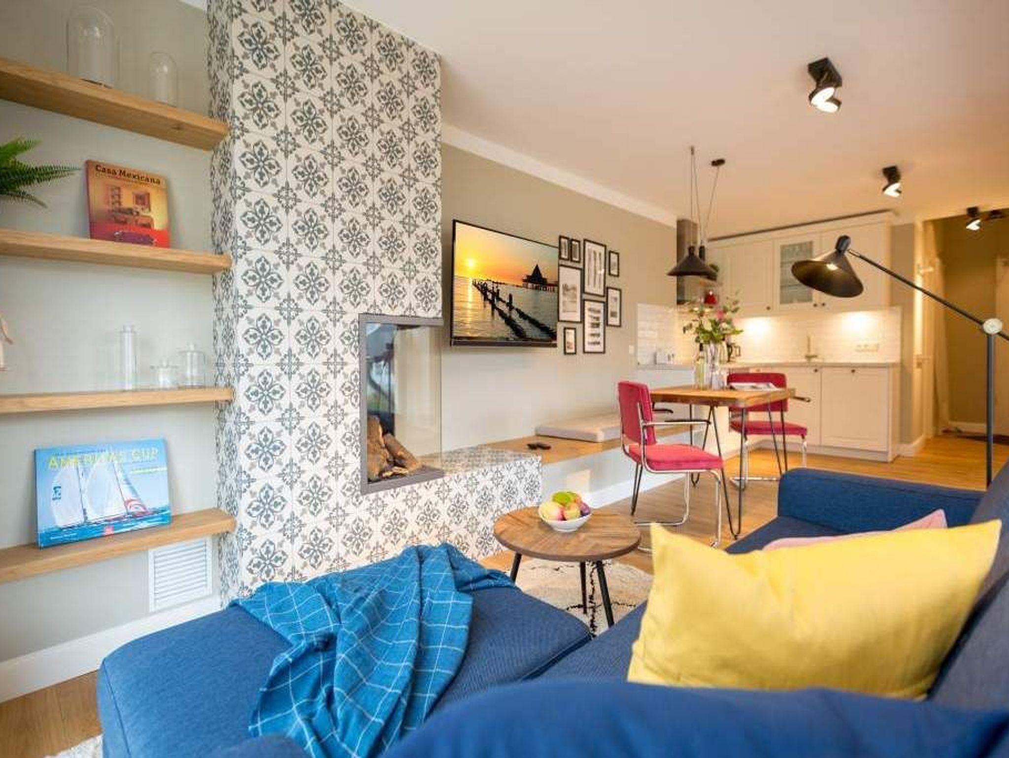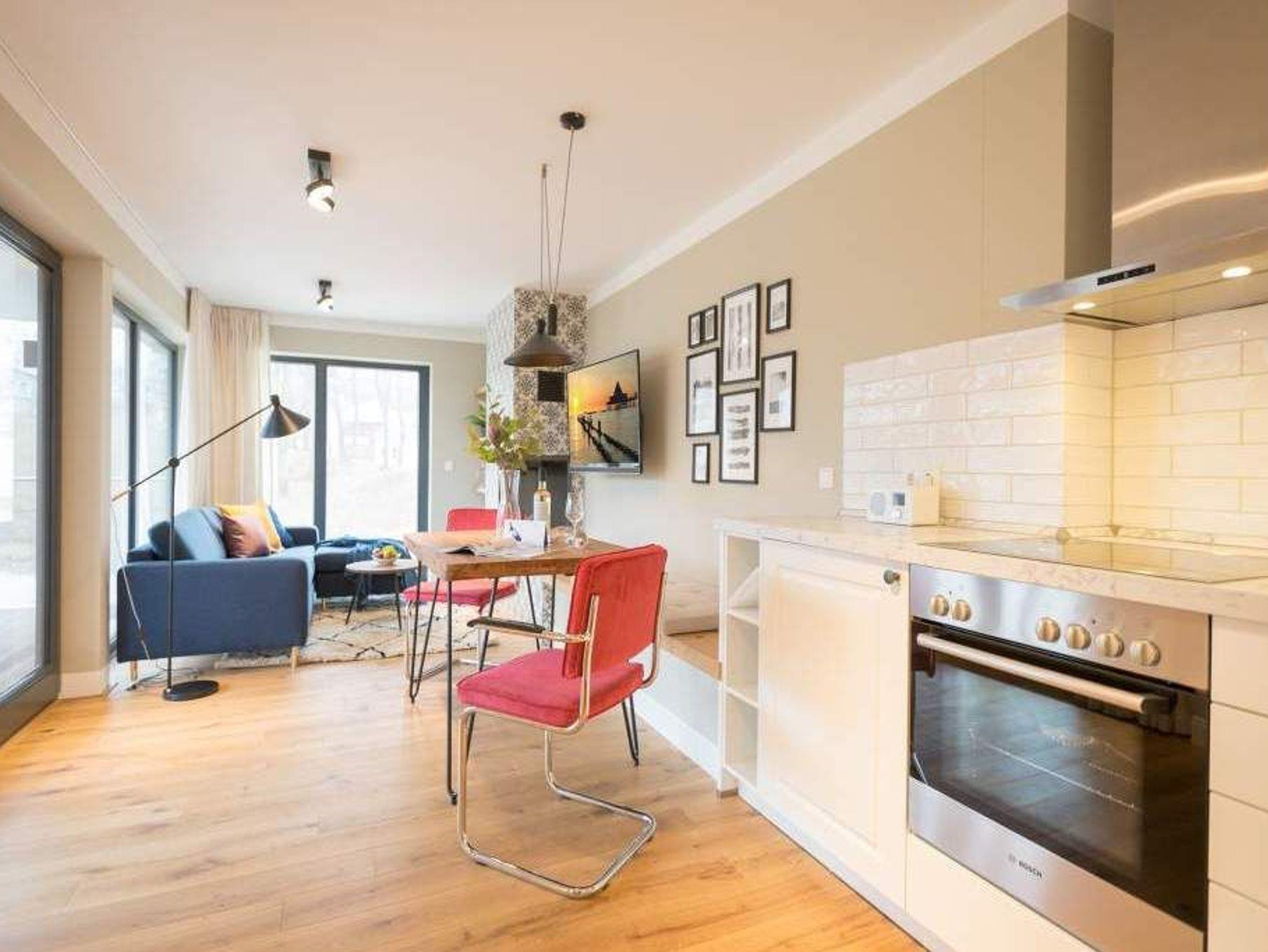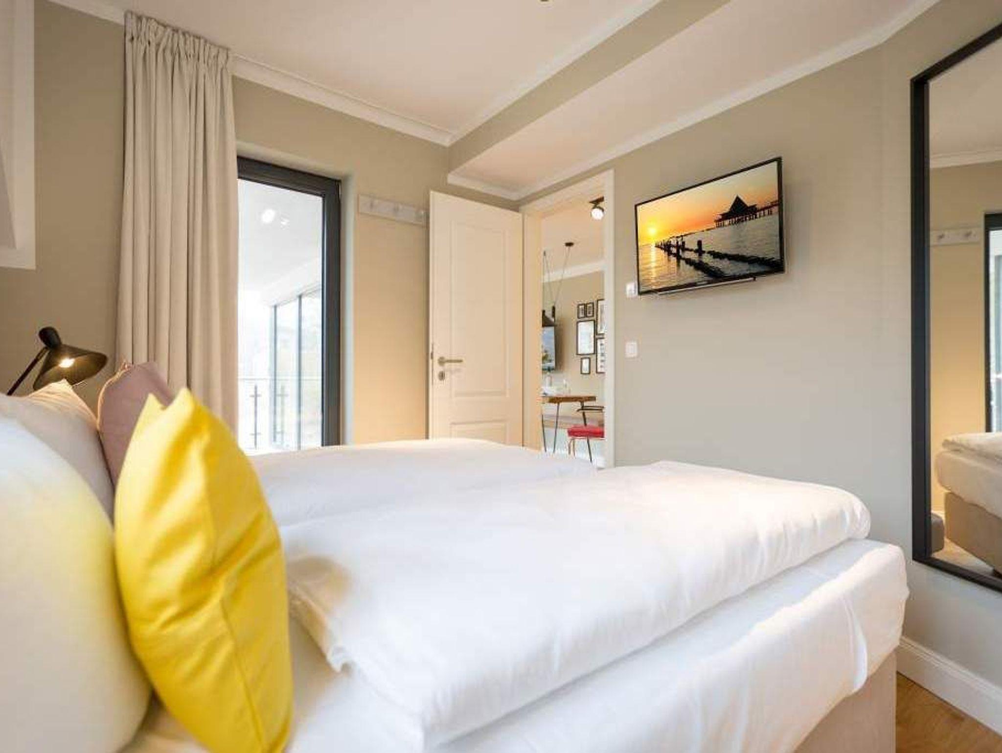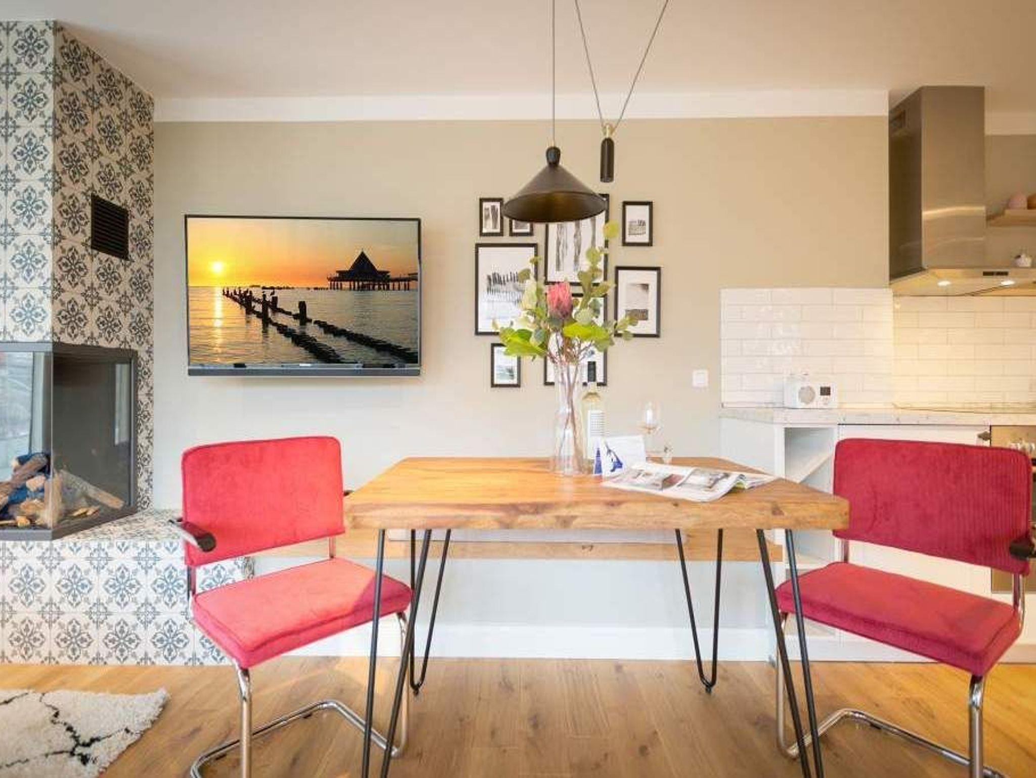 Endlich einmal wieder Zeit zu zweit oder einfach nur für sich ? dieses kleine und kuschelige Urlaubsparadies im Dachgeschoss der Villa Bellevue ist der ideale Ort, auszuspannen und sich zu erholen. Das Zwei-Zimmer-Appartement bietet mit seinen 50 Quadratmetern Platz für zwei Personen. Hell und stilvoll von einer Innenarchitektin konzipiert, sind der Stress und die Hektik des Alltags binnen kurzer Zeit vergessen. Vom ausgewogenen Farbkonzept bis zu den Design-Möbeln ist alles harmonisch aufeinander abgestimmt. Der offene Wohn-Essbereich lädt mit einer gemütlichen Sofalandschaft zum Loslassen ein. Ein wunderschöner Gas-Kamin mit Vintage-Fliesenoptik spendet an kühlen Abenden und stürmischen Tagen Wärme und Geborgenheit. Ganze 42 Zoll misst der Flat-TV. Vom Wohnzimmer aus haben Sie Zugang zum Balkon. Was gibt es schöneres als unter freiem Himmel in der Morgensonne zu frühstücken. Zum Essen können Sie sich natürlich an den schönen Echtholztisch mit den trendig roten Freischwingern setzen. Die Küche ist mit allem ausgestattet, was Sie zur Zubereitung eines genussvollen Menü benötigen könnten ? inklusive elegantem Geschirr. Vergnügen bereitet das große und komfortable Boxspringdoppelbett (1,80 m x 2,00 m) im Schlafzimmer. Viel Platz für die Urlaubsgarderobe bietet hier der hochwertige Einbauschrank. Das Badezimmer verfügt über eine geräumige Dusche, einen Waschtisch und ein WC. Die Handtücher liegen bei der Anreise bereit und die Betten sind bezogen. Das WLAN ist kostenfrei. Für Ihr Auto gibt es am Haus einen Stellplatz.