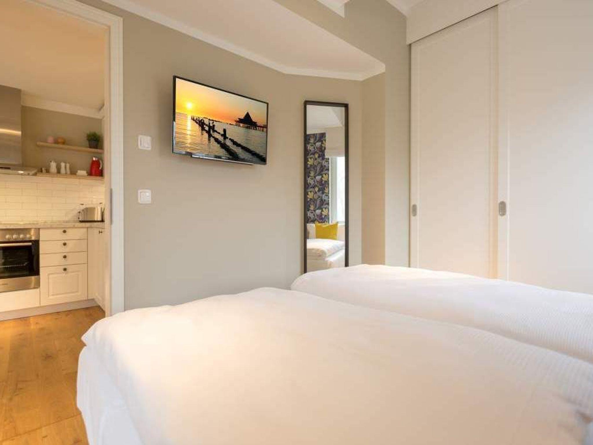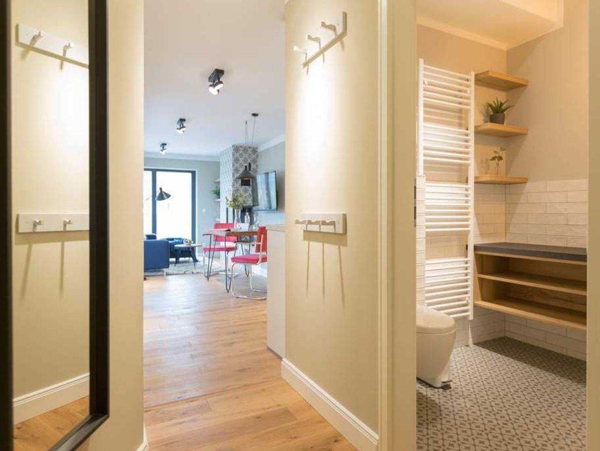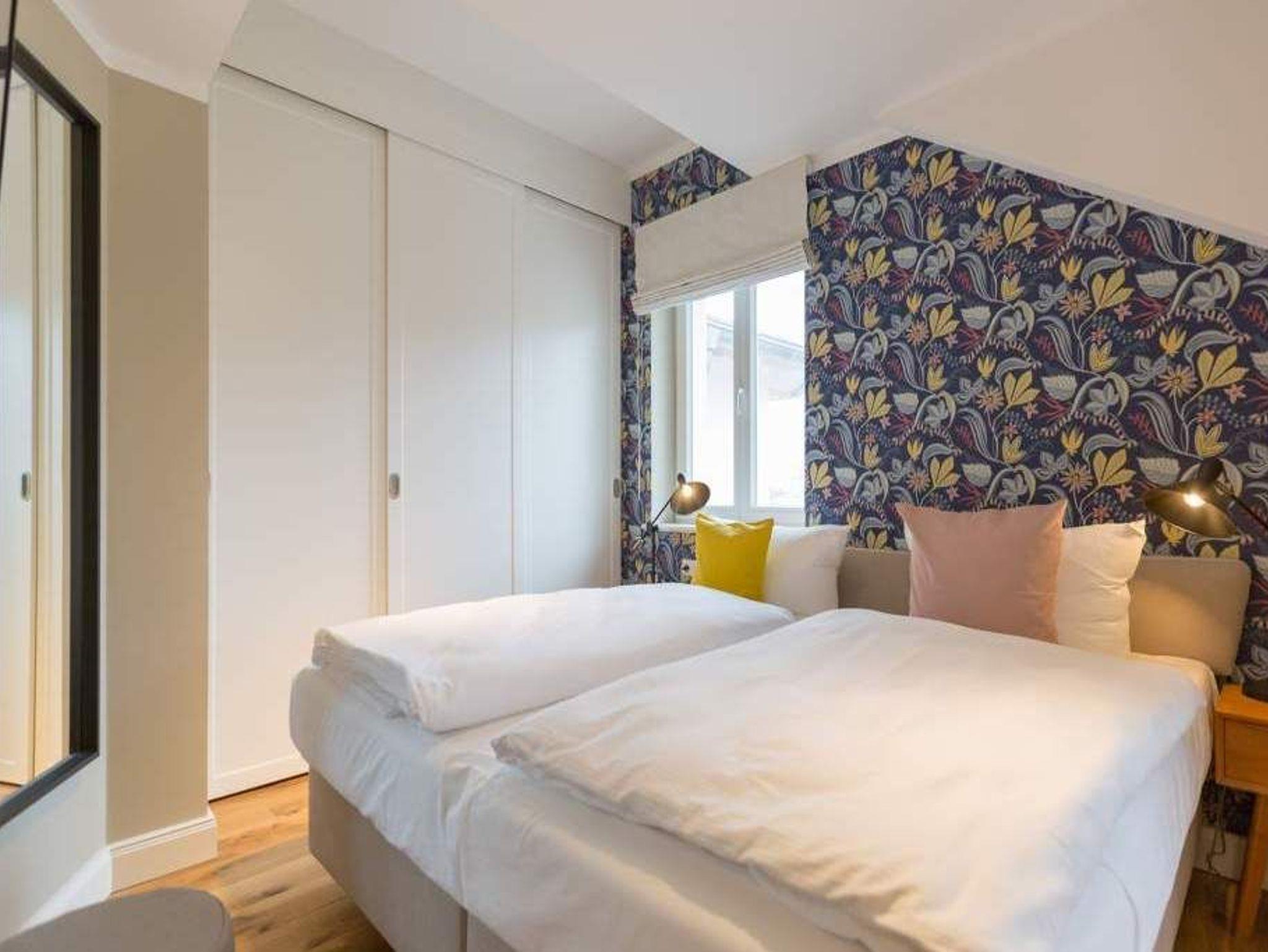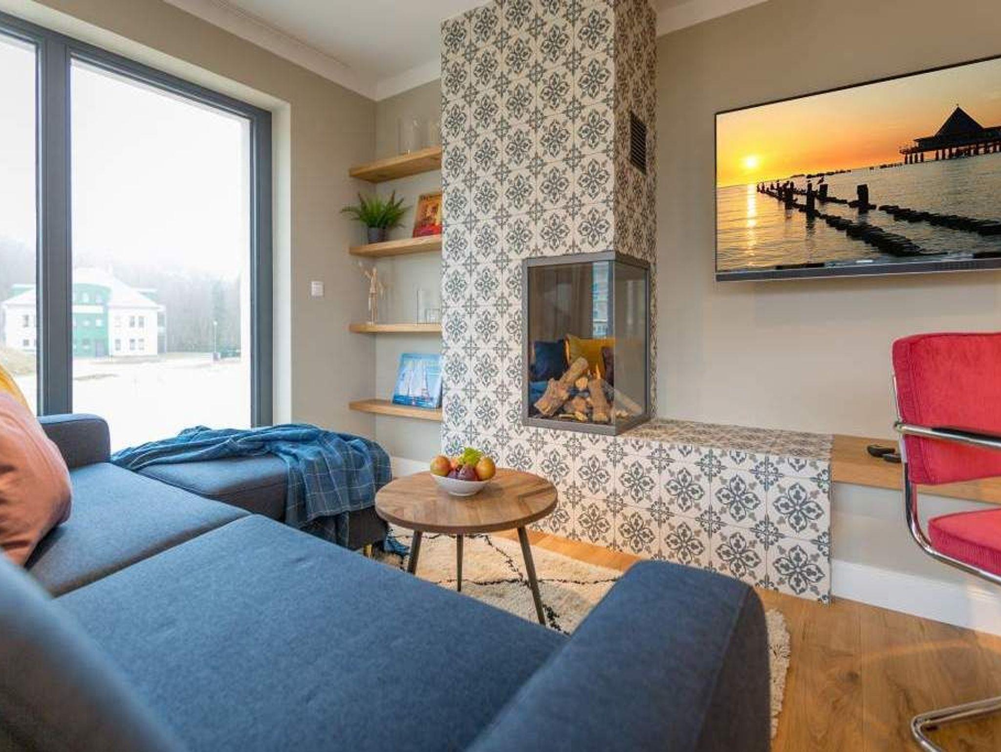 Endlich einmal wieder Zeit zu zweit oder einfach nur für sich ? dieses kleine und kuschelige Urlaubsparadies im Dachgeschoss der Villa Bellevue ist der ideale Ort, auszuspannen und sich zu erholen. Das Zwei-Zimmer-Appartement bietet mit seinen 50 Quadratmetern Platz für zwei Personen. Hell und stilvoll von einer Innenarchitektin konzipiert, sind der Stress und die Hektik des Alltags binnen kurzer Zeit vergessen. Vom ausgewogenen Farbkonzept bis zu den Design-Möbeln ist alles harmonisch aufeinander abgestimmt. Der offene Wohn-Essbereich lädt mit einer gemütlichen Sofalandschaft zum Loslassen ein. Ein wunderschöner Gas-Kamin mit Vintage-Fliesenoptik spendet an kühlen Abenden und stürmischen Tagen Wärme und Geborgenheit. Ganze 42 Zoll misst der Flat-TV. Vom Wohnzimmer aus haben Sie Zugang zum Balkon. Was gibt es schöneres als unter freiem Himmel in der Morgensonne zu frühstücken. Zum Essen können Sie sich natürlich an den schönen Echtholztisch mit den trendig roten Freischwingern setzen. Die Küche ist mit allem ausgestattet, was Sie zur Zubereitung eines genussvollen Menü benötigen könnten ? inklusive elegantem Geschirr. Vergnügen bereitet das große und komfortable Boxspringdoppelbett (1,80 m x 2,00 m) im Schlafzimmer. Viel Platz für die Urlaubsgarderobe bietet hier der hochwertige Einbauschrank. Das Badezimmer verfügt über eine geräumige Dusche, einen Waschtisch und ein WC. Die Handtücher liegen bei der Anreise bereit und die Betten sind bezogen. Das WLAN ist kostenfrei. Für Ihr Auto gibt es am Haus einen Stellplatz.
