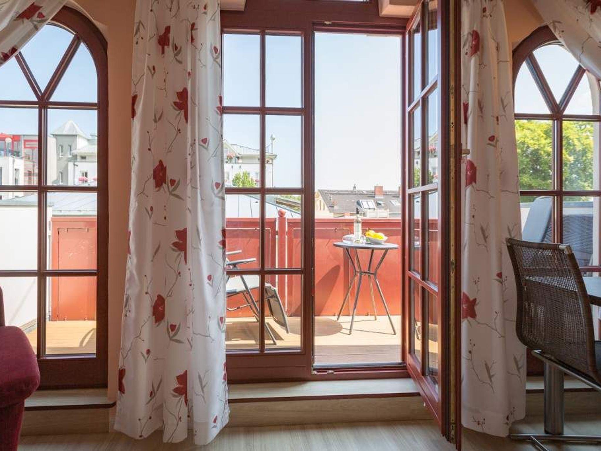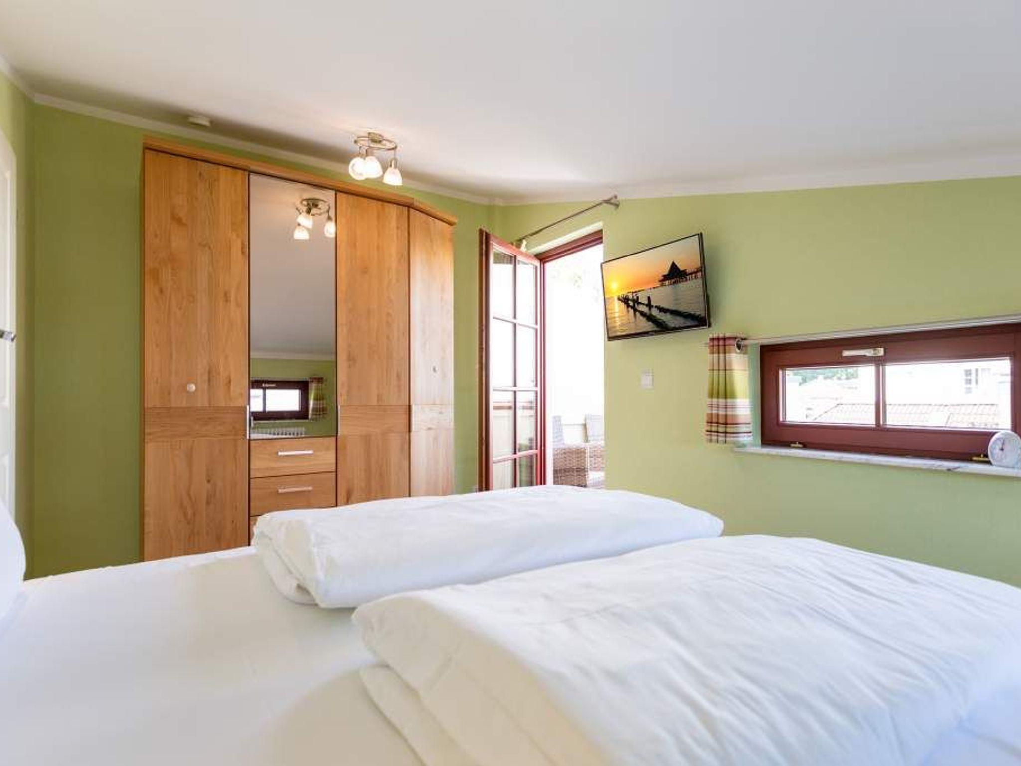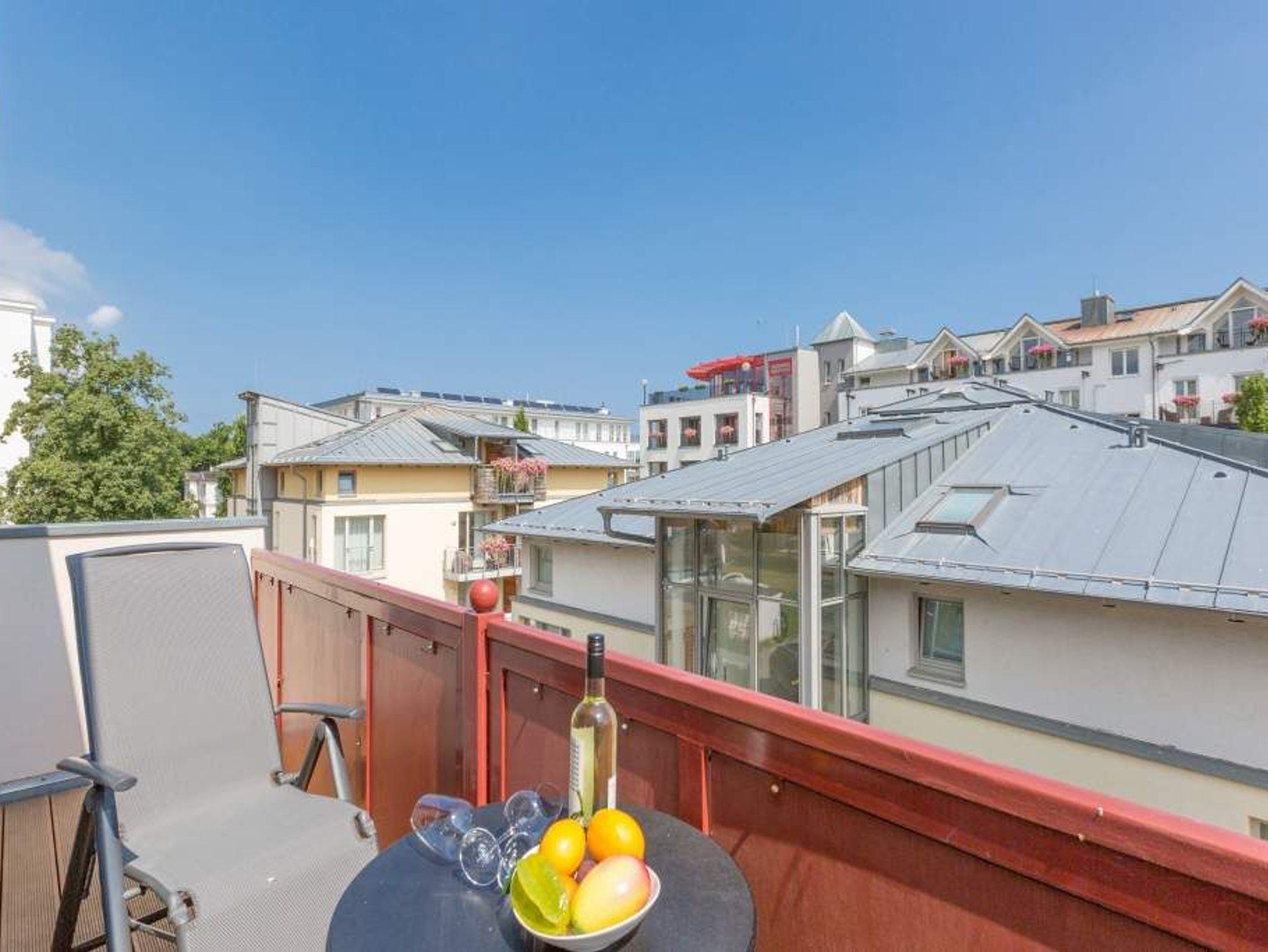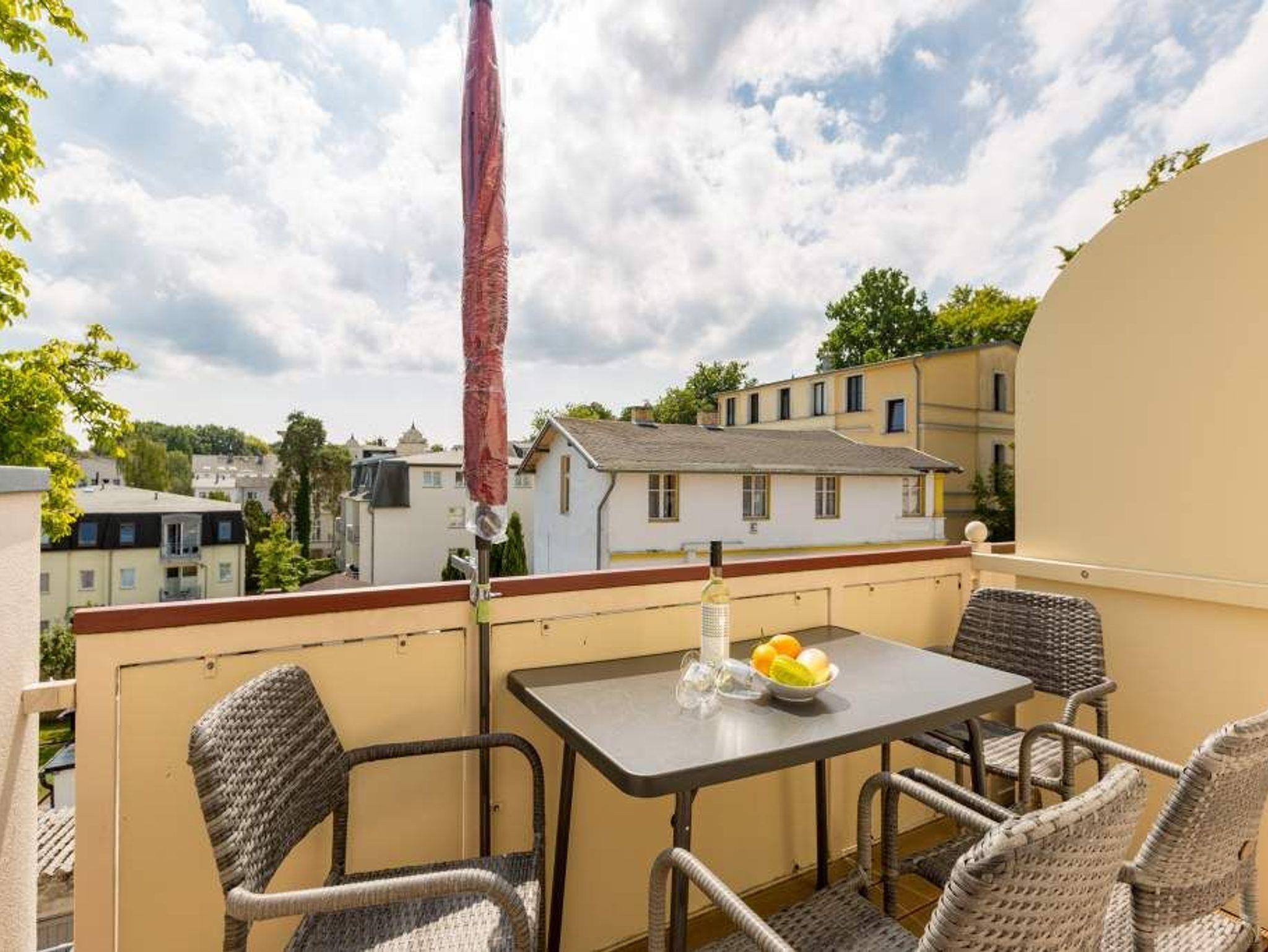 Diese stilvolle und elegante Ferienwohnung direkt unter dem Dach der Villa Damaris wartet gleich mit drei Balkonen auf. Und sie alle geben einen Blick auf die mit viel Grün und wunderschönen alten Bädervillen versehene Umgebung frei. Hier können Sie schon morgens Sonne tanken und die salzige Ostseeluft tief in sich einatmen. Das kleine, urgemütliche Urlaubsreich unter Dachschrägen bietet auf seinen 60 Quadratmetern Platz für bis zu vier Personen und ein Kleinkind (im Kinderreisebett). Das offene Wohn-Esszimmer ist großzügig geschnitten und durch die große Fensterfront, die hinaus auf einen der drei Balkone führt, wunderbar luftig und hell. Ein harmonisches Farbkonzept und eine stilvolle Einrichtung sorgen für eine entspannte Urlaubsatmosphäre. Auf der roten Sofalandschaft erhält der Begriff Behaglichkeit eine neue Bedeutung. Denn sie eignet sich ideal zum Runterkommen und Entspannen. Das Zimmer verfügt über einen großen Flat-TV. Am schönen Essplatz lässt es sich ausgiebig schlemmen, spielen oder plaudern. Für die Zubereitung der Speisen findet sich alles Notwendige in der offenen und voll ausgestatteten Küche. Jedes der beiden Schlafzimmer verfügt über ein bequemes Doppelbett, einen geräumigen Kleiderschrank und einen eigenen kleinen Balkon. Eines der beiden Zimmer hat auch einen Flat-TV. Im Bad stehen Ihnen ein Waschtisch und ein WC zur Verfügung. Die ebenerdige Regendusche ist so groß, dass Sie darin bequem zu Zweit Duschspaß haben können. In der Wohnung gibt es WLAN, das Sie kostenfrei nutzen dürfen. Damit der Urlaub rundum sorgenfrei ist, haben wir die Betten bei Ihrer Ankunft schon bezogen und Handtücher liegen bereit. Am haus befindet sich zudem ein Pkw-Stellplatz.