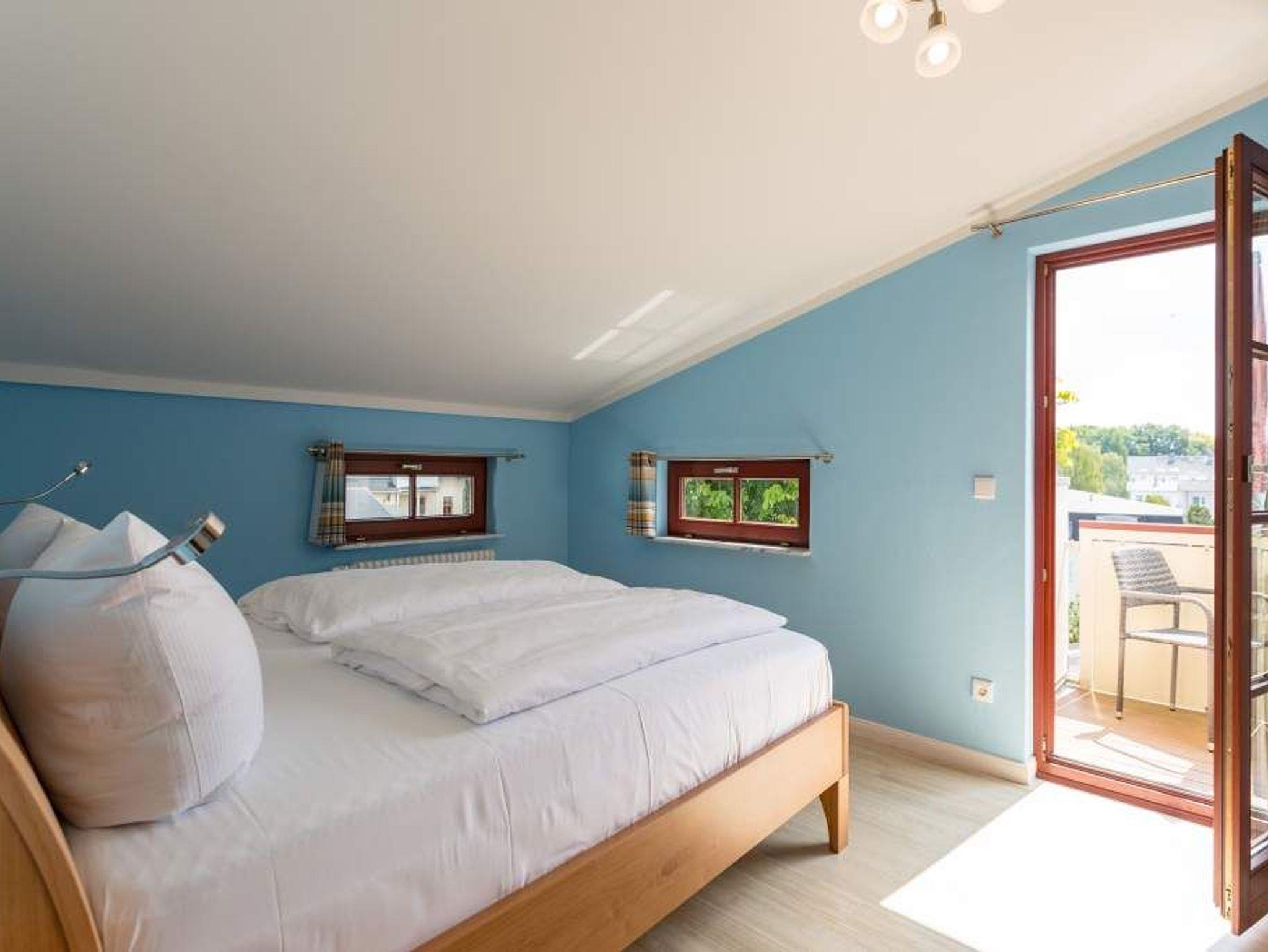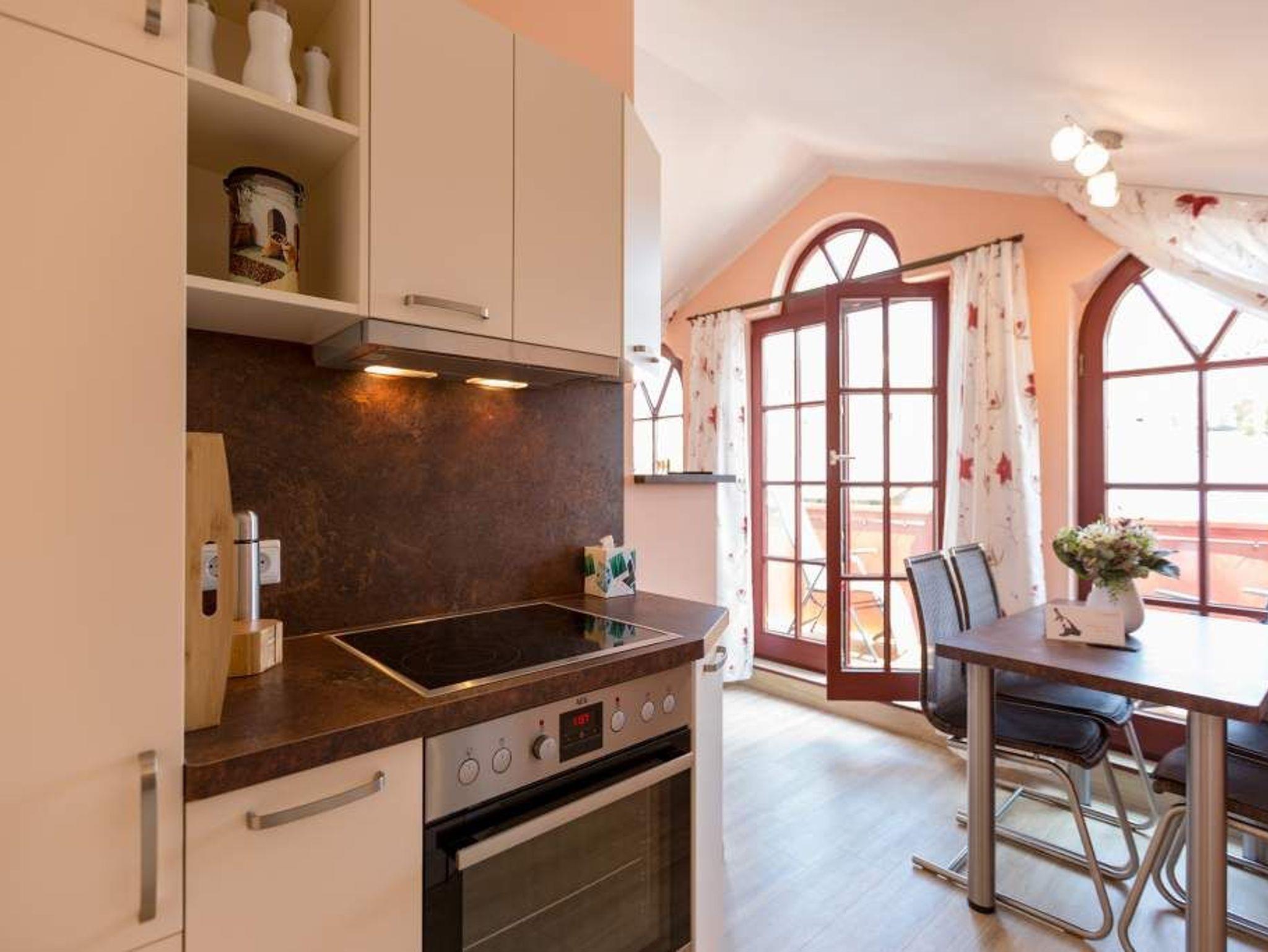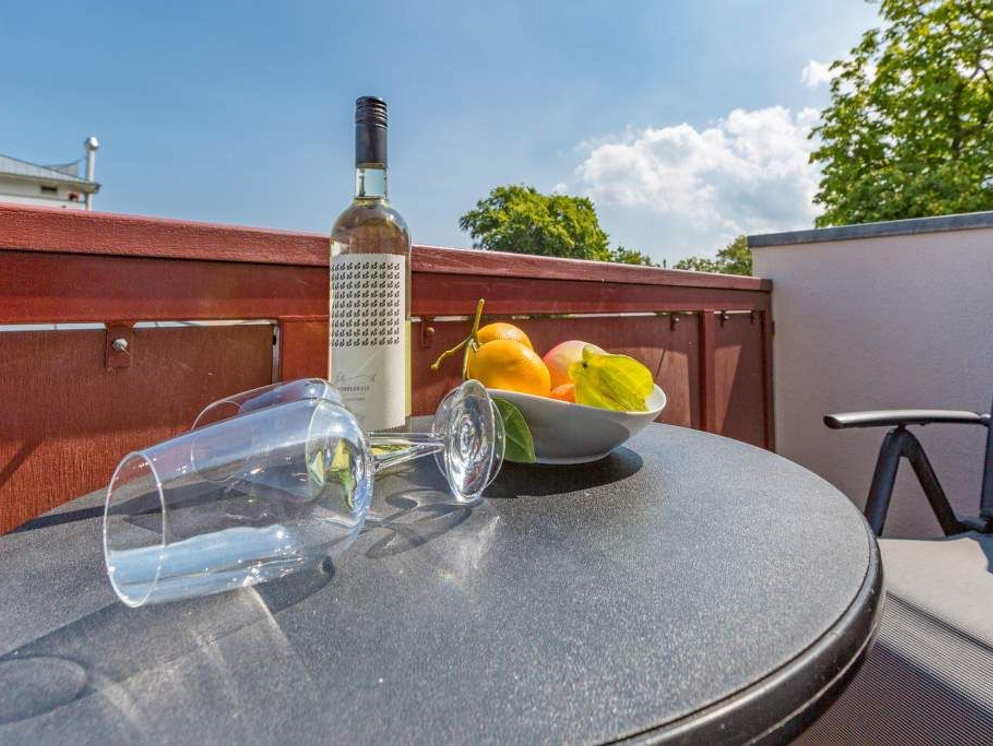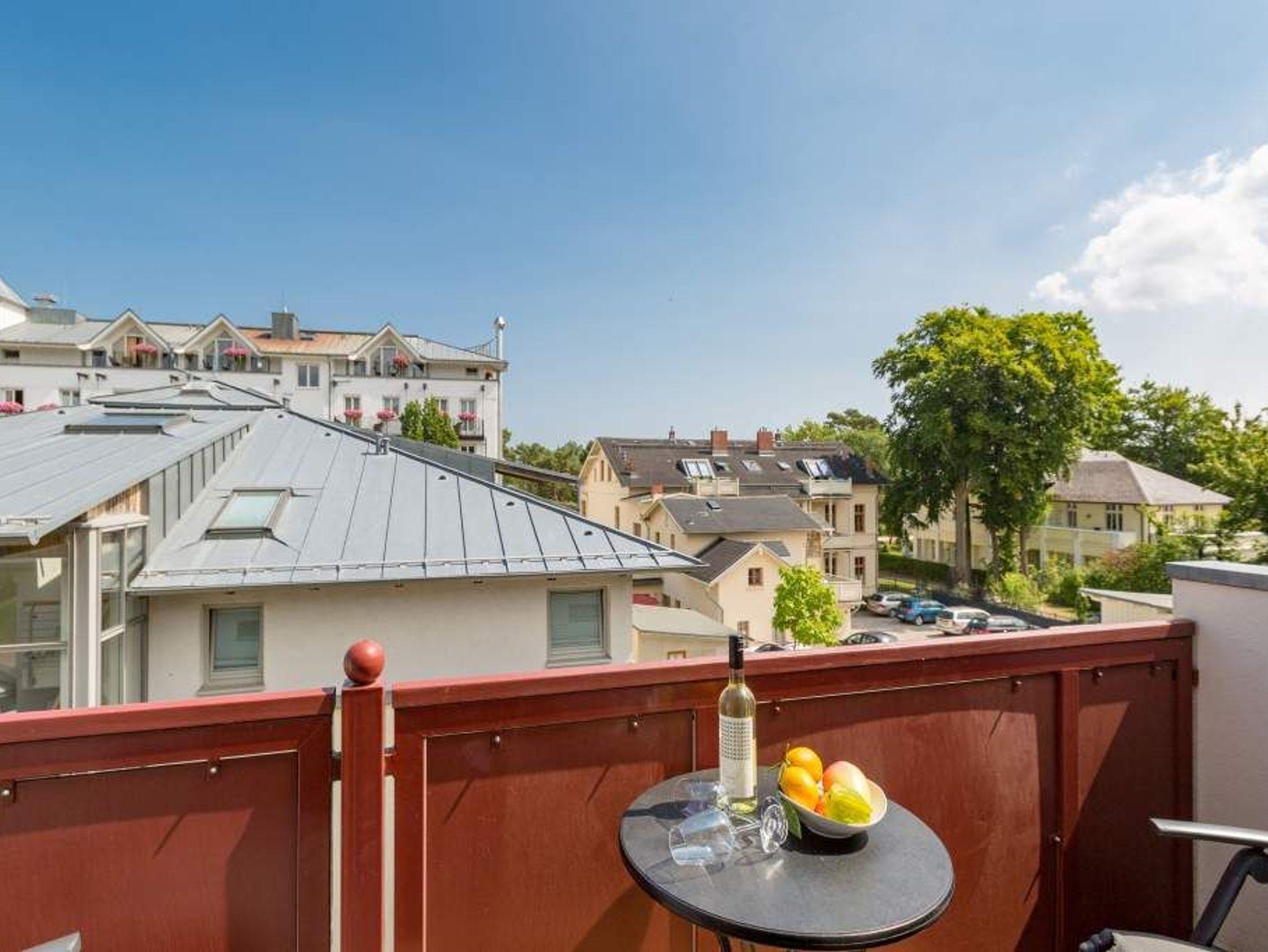 Diese stilvolle und elegante Ferienwohnung direkt unter dem Dach der Villa Damaris wartet gleich mit drei Balkonen auf. Und sie alle geben einen Blick auf die mit viel Grün und wunderschönen alten Bädervillen versehene Umgebung frei. Hier können Sie schon morgens Sonne tanken und die salzige Ostseeluft tief in sich einatmen. Das kleine, urgemütliche Urlaubsreich unter Dachschrägen bietet auf seinen 60 Quadratmetern Platz für bis zu vier Personen und ein Kleinkind (im Kinderreisebett). Das offene Wohn-Esszimmer ist großzügig geschnitten und durch die große Fensterfront, die hinaus auf einen der drei Balkone führt, wunderbar luftig und hell. Ein harmonisches Farbkonzept und eine stilvolle Einrichtung sorgen für eine entspannte Urlaubsatmosphäre. Auf der roten Sofalandschaft erhält der Begriff Behaglichkeit eine neue Bedeutung. Denn sie eignet sich ideal zum Runterkommen und Entspannen. Das Zimmer verfügt über einen großen Flat-TV. Am schönen Essplatz lässt es sich ausgiebig schlemmen, spielen oder plaudern. Für die Zubereitung der Speisen findet sich alles Notwendige in der offenen und voll ausgestatteten Küche. Jedes der beiden Schlafzimmer verfügt über ein bequemes Doppelbett, einen geräumigen Kleiderschrank und einen eigenen kleinen Balkon. Eines der beiden Zimmer hat auch einen Flat-TV. Im Bad stehen Ihnen ein Waschtisch und ein WC zur Verfügung. Die ebenerdige Regendusche ist so groß, dass Sie darin bequem zu Zweit Duschspaß haben können. In der Wohnung gibt es WLAN, das Sie kostenfrei nutzen dürfen. Damit der Urlaub rundum sorgenfrei ist, haben wir die Betten bei Ihrer Ankunft schon bezogen und Handtücher liegen bereit. Am haus befindet sich zudem ein Pkw-Stellplatz.