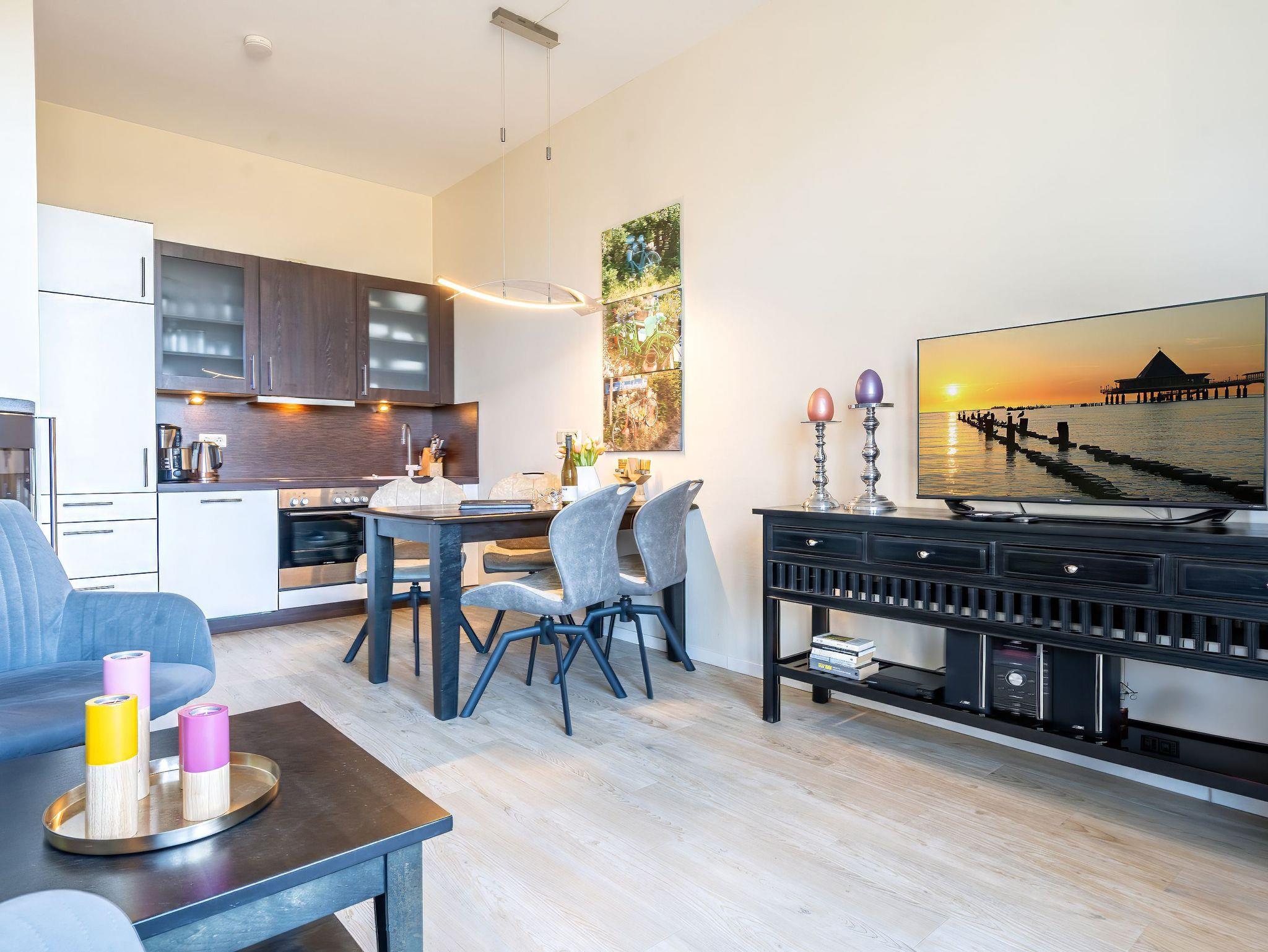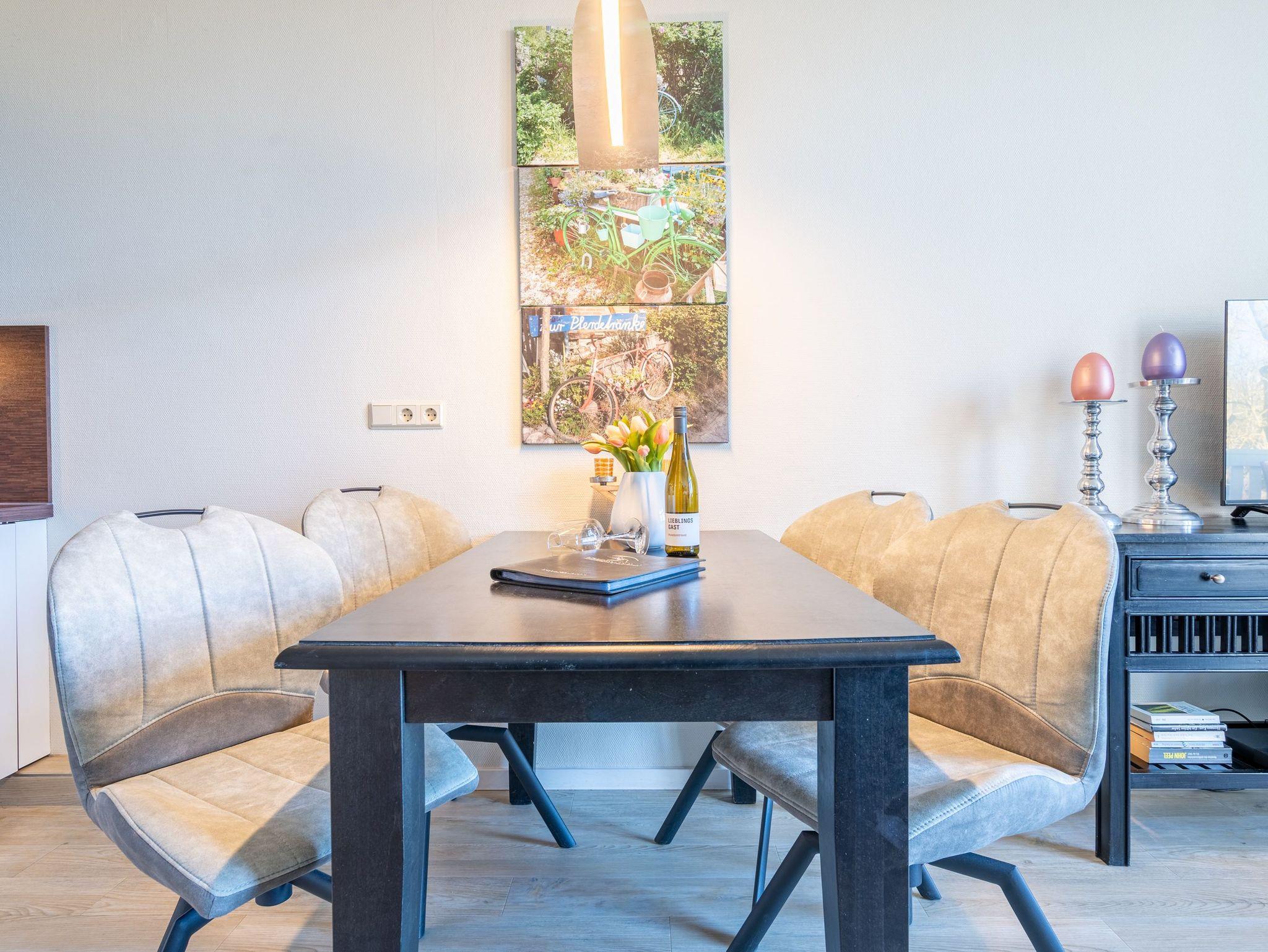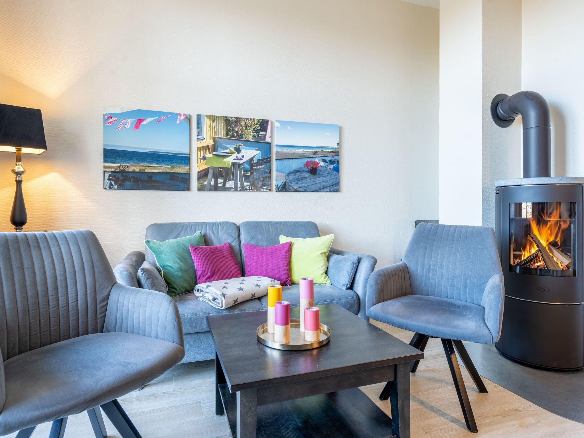 Stylische Farben und ein moderner Look versprühen sofort das passende Urlaubsfeeling. Die schöne 3-Raum-Ferienwohnung (75 qm) befindet sich im 1. Obergeschoss des Hauses und bietet Platz für 4 Erwachsene und ein Kleinkind bis 3 Jahre. An den Wohnbereich mit bequemer Sitzgruppe und schönen Kaminofen schließt sich die offene Küche mit Essplatz an. Auf dem Südbalkon lässt es sich besonders gut relaxen und man genießt den Blick ins Grüne. Die beiden Schlafzimmer mit Doppelbetten und TV, ein Bad mit Dusche und WC und ein Gäste-WC ergänzen die Wohnung. Für die Wohnung steht ein PKW-Stellplatz zur Verfügung. Ein WLAN-Netz im Haus kann kostenfrei genutzt werden. Auf Wunsch stellen wir für unsere kleinen Gäste ein Kinderreisebett (ohne zusätzliche Matratze [&] Bettzeug) und einen Kinderhochstuhl ( gegen einen Aufpreis) zur Verfügung. Für Ihren Komfort sind die Betten bei der Anreise bezogen und Handtücher liegen bereit (Erstausstattung). Für den Tag am Meer steht Ihnen als besonderes Bonbon von Mitte Mai bis Ende September (je nach Witterung) ein Strandkorb am Strand kostenlos zur Verfügung.