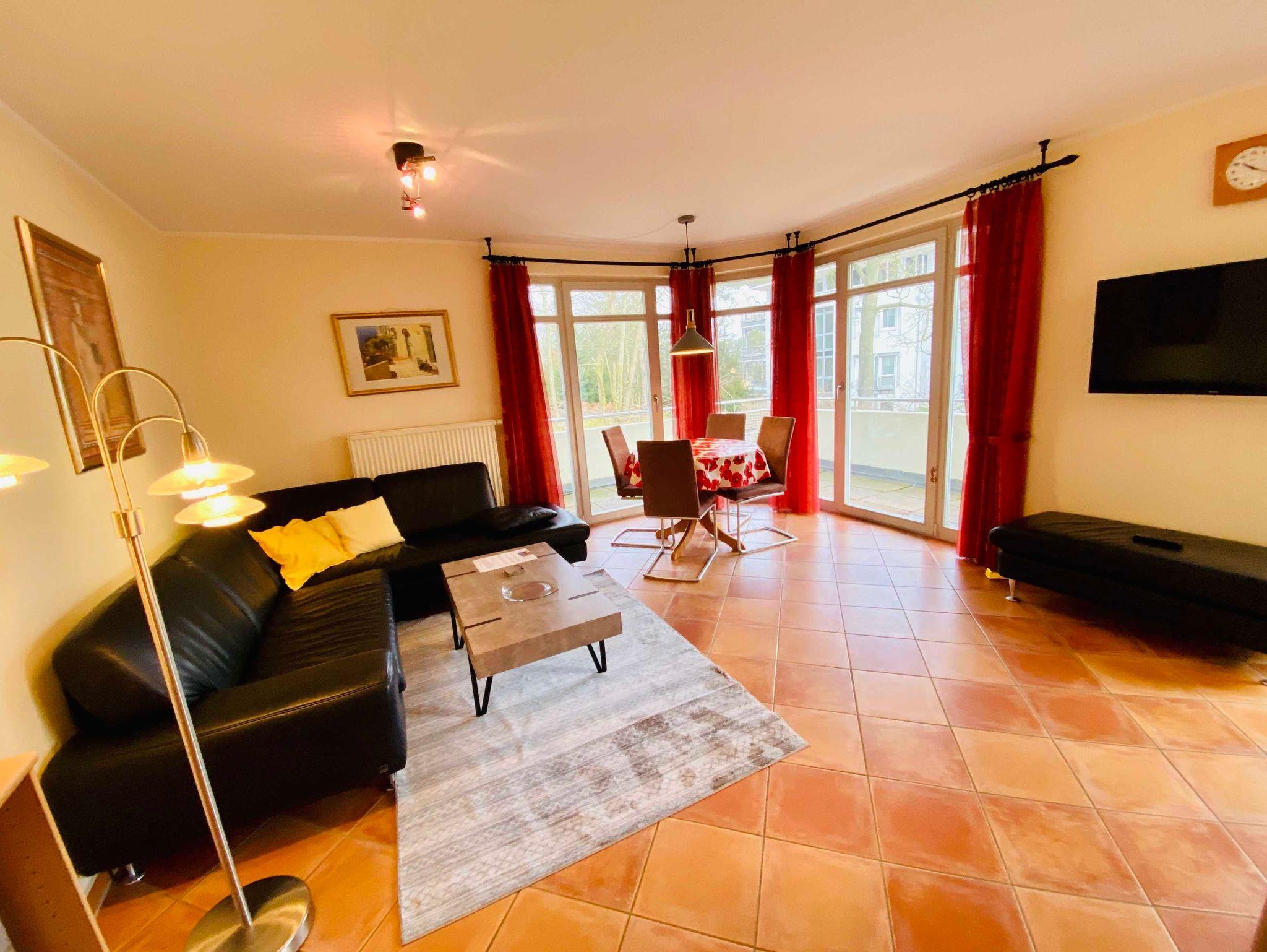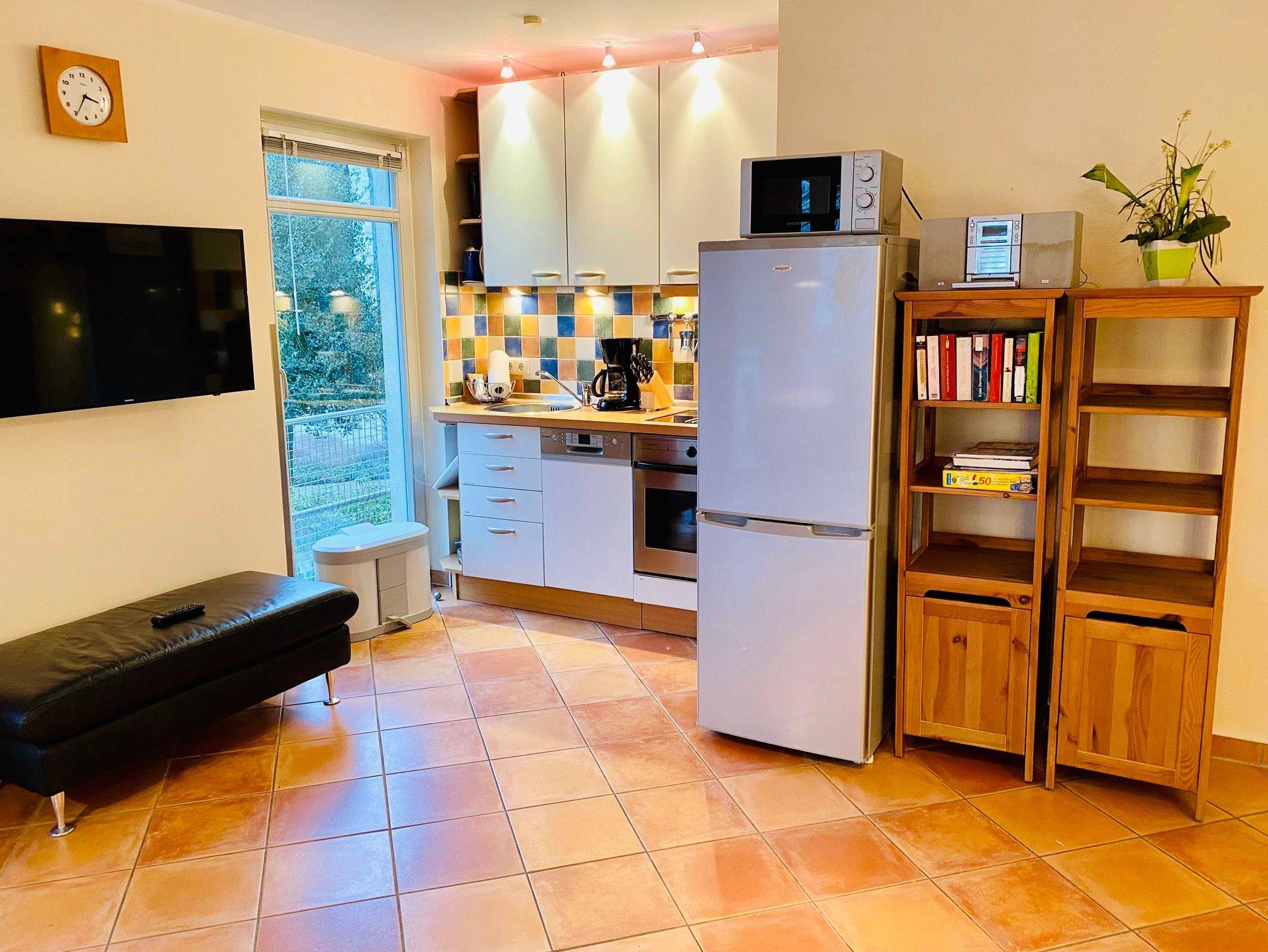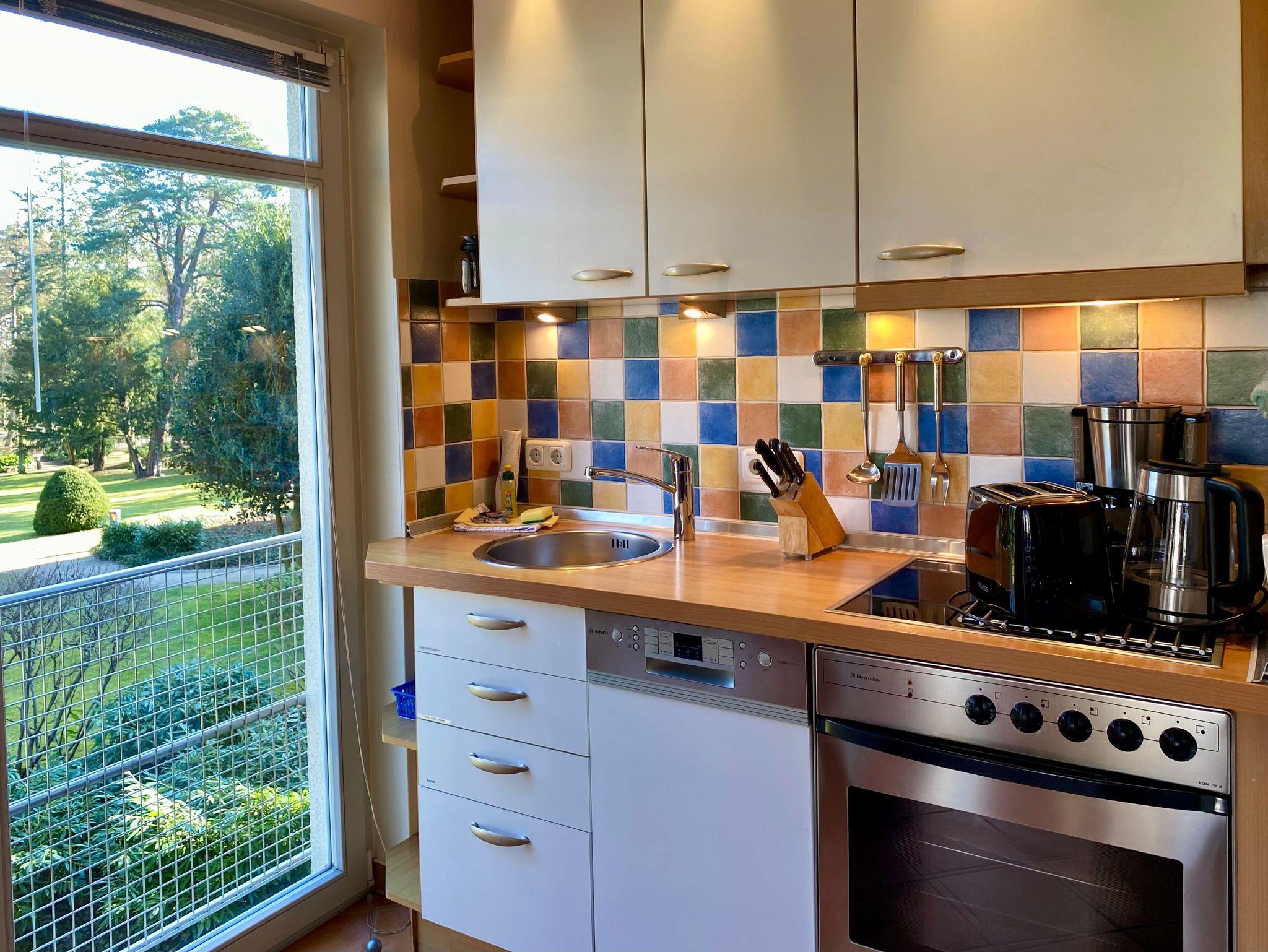 Genießen Sie Ihren Urlaub in dieser schönen 3-Raumwohnung Nr. 11 mit Balkon Richtung Park der Residenz Bleichröder. Der Wohnraum bietet durch eine funktionale Aufteilung zwischen Küche, Esstisch und Couchecke genug Platz für die gesamte Familie. In der Küche stehen Geschirrspüler, Backofen, Herd, Mikrowelle und ein großer Kühlschrank mit Gefrierteil zur Verfügung. Beide Schlafzimmer sind mit Doppelbetten versehen, im großen Schlafzimmer gibt es einen zweiten TV. Diese moderne Ferienwohnung ist komplett mit Terracotta-Steinfliesen ausgelegt, sehr praktisch. Zur Ferienwohnung gehört ein Bad mit Dusche.