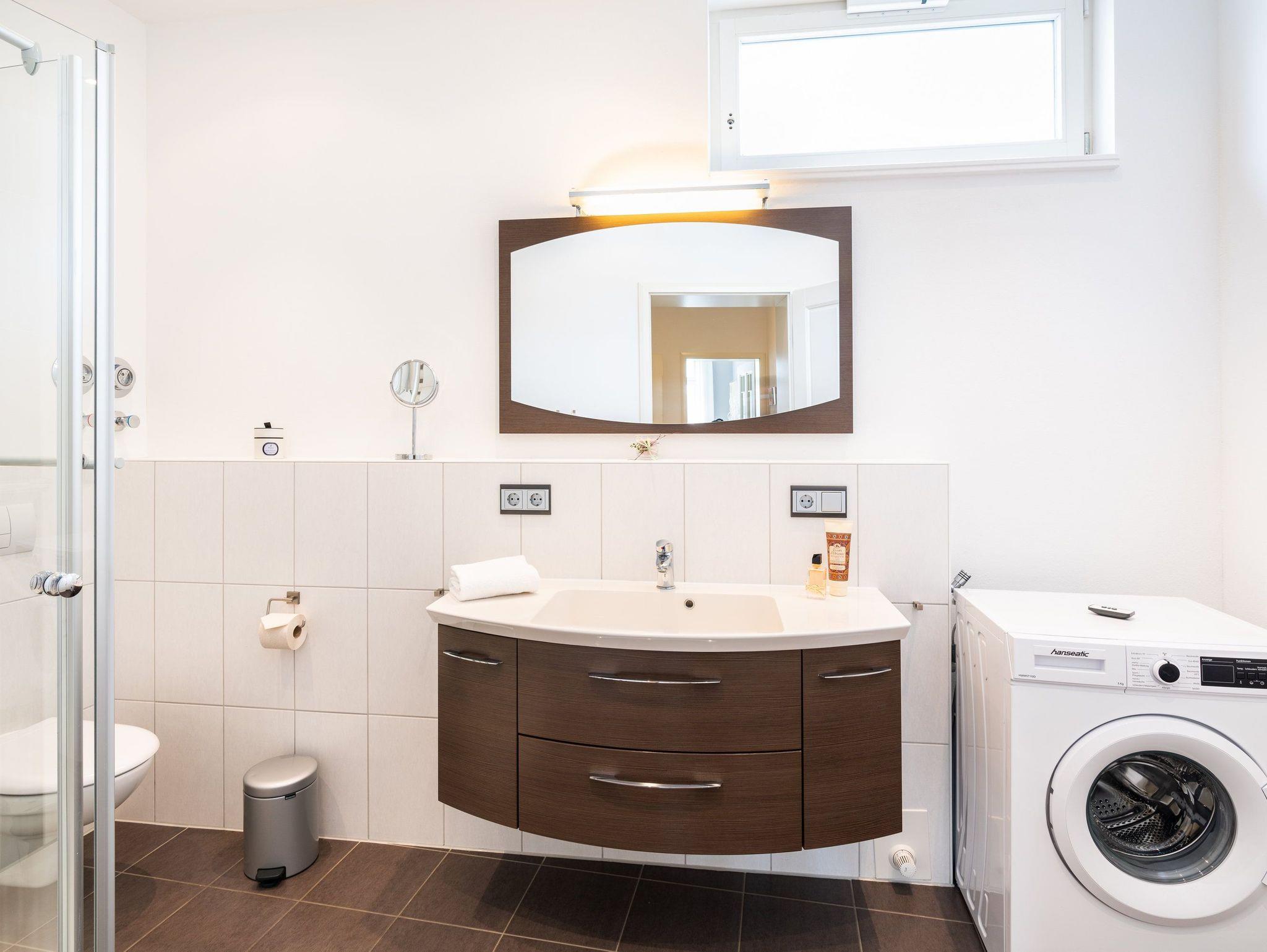 Die neue Küche mit Arbeitsinsel ist mit modernsten Geräten (Mikrowelle, Herd, Backofen, Geschirrspüler) sowie umfangreichen Kochutensilien und Geschirr ausgestattet. Hier schlagen die Herzen von Hobbyköchen höher, denn es gibt ausreichend Platz zur Zubereitung Ihrer Lieblingsspeisen. Optisches Highlight der Küche ist der freistehende SMEG-Kühlschrank. In der Küche befindet sich ebenfalls ein schöner Esstisch mit vier Stühlen. Ein stylisches Lampendesign sorgt dafür, dass es Ihnen nie zu dunkel wird. Pures Schlafvergnügen finden Sie im Schlafzimmer. Dieses bietet Ihnen ein hochwertiges Doppelbett (1,80 m x 2,00 m) und einen Kleiderschrank. Eine weitere Schlafgelegenheit für bis zu zwei Personen finden Sie auf dem Design-Schlafsofa (1,60m x 2,10m) im Wohnzimmer, welches eine robuste und einfache Ausklappfunktion und einen echten Lattenrost bietet. Das Tageslichtbad verfügt über eine ebenerdige Dusche, einen Waschtisch, einem WC und einer Waschmaschine ausgestattet.