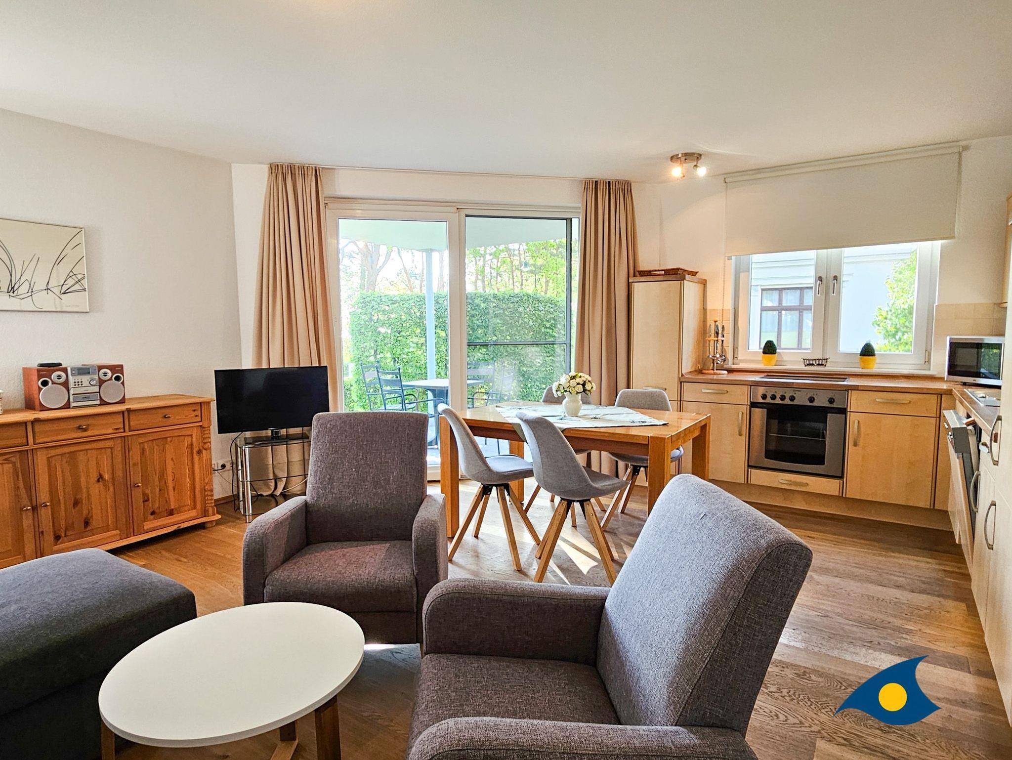 Der großzügige Wohnbereich besticht durch seine geschmackvolle Einrichtung und eine offene, voll ausgestattete Küche, perfekt für kulinarische Erlebnisse. Von hier aus haben Sie direkten Zugang zur überdachten Terrasse, die mit einem herrlichen Blick auf die Ostseedünen und das Meer begeistert. Eine gemütliche große Eckcouch mit Schlaffunktion für die 3. und 4. Person, zwei komfortable Sessel und ein Flachbild-TV laden zu entspannten Abenden ein. Die Essecke bietet ausreichend Platz für gemeinsame Mahlzeiten.
