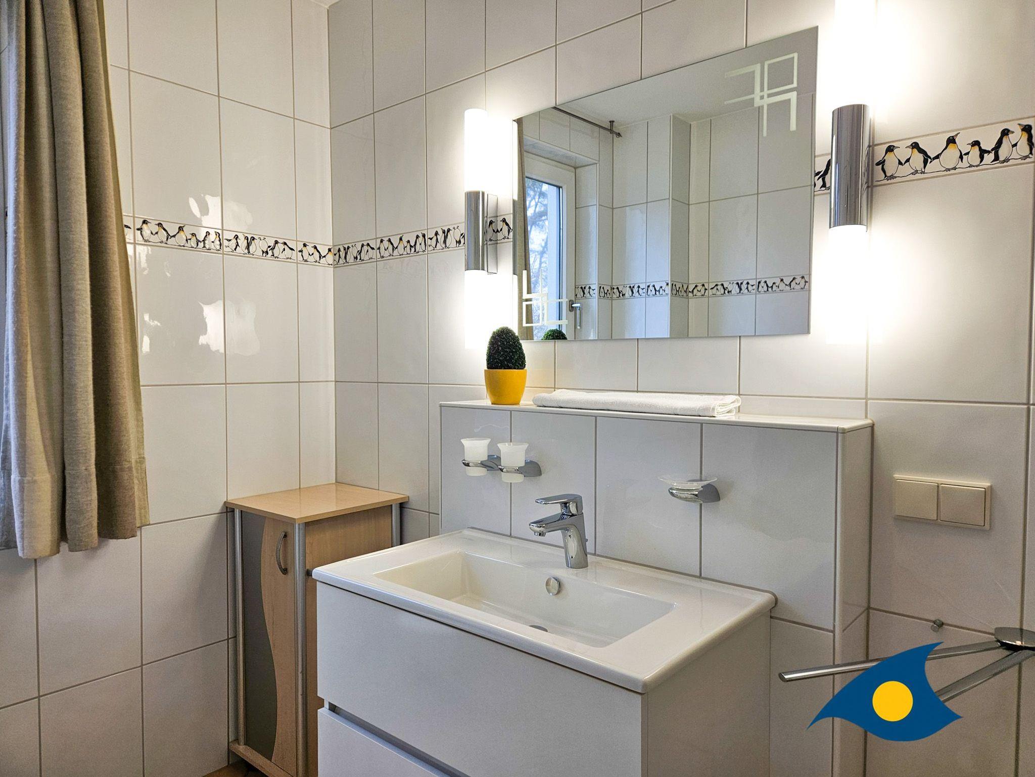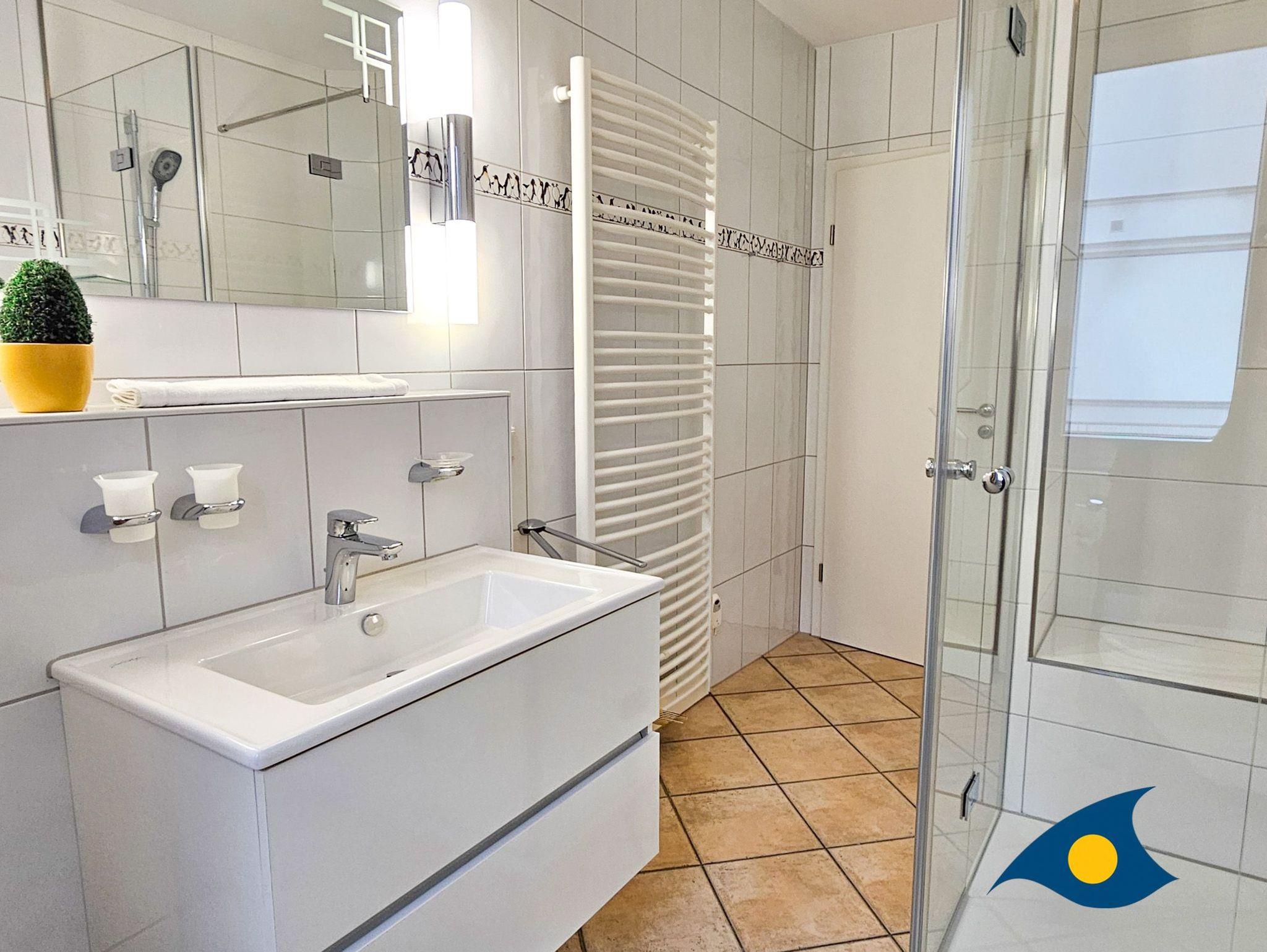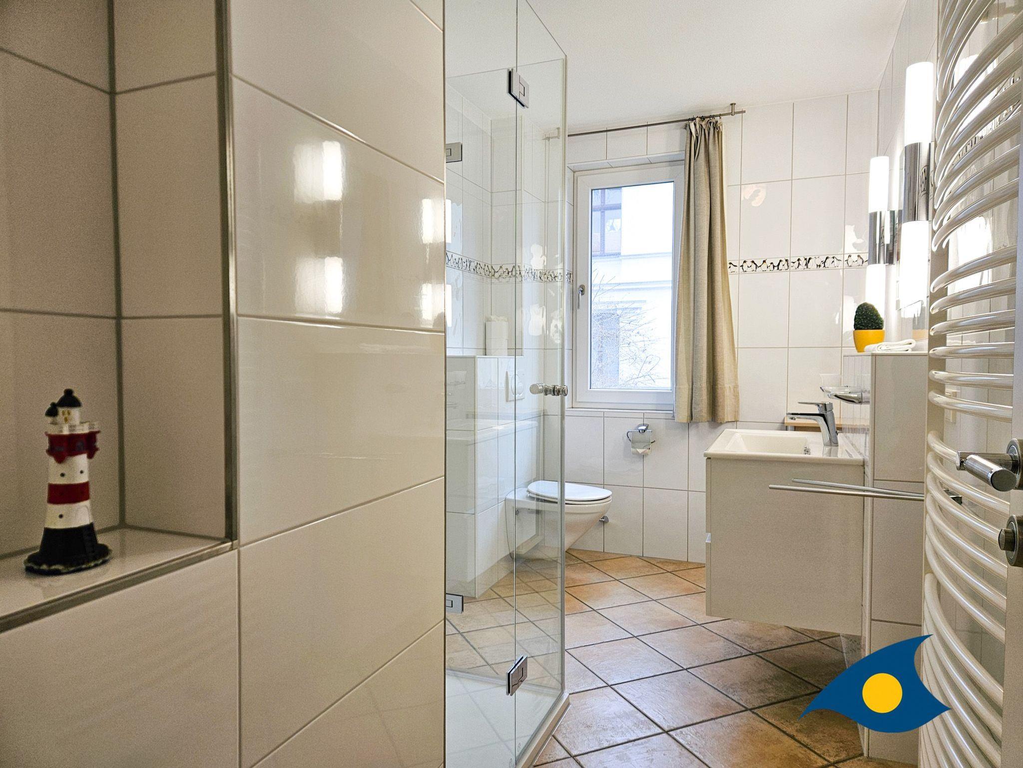 Das großzügige Tageslichtbad ist modern gestaltet und mit einer ebenerdigen Dusche ausgestattet, die höchsten Komfort bietet.