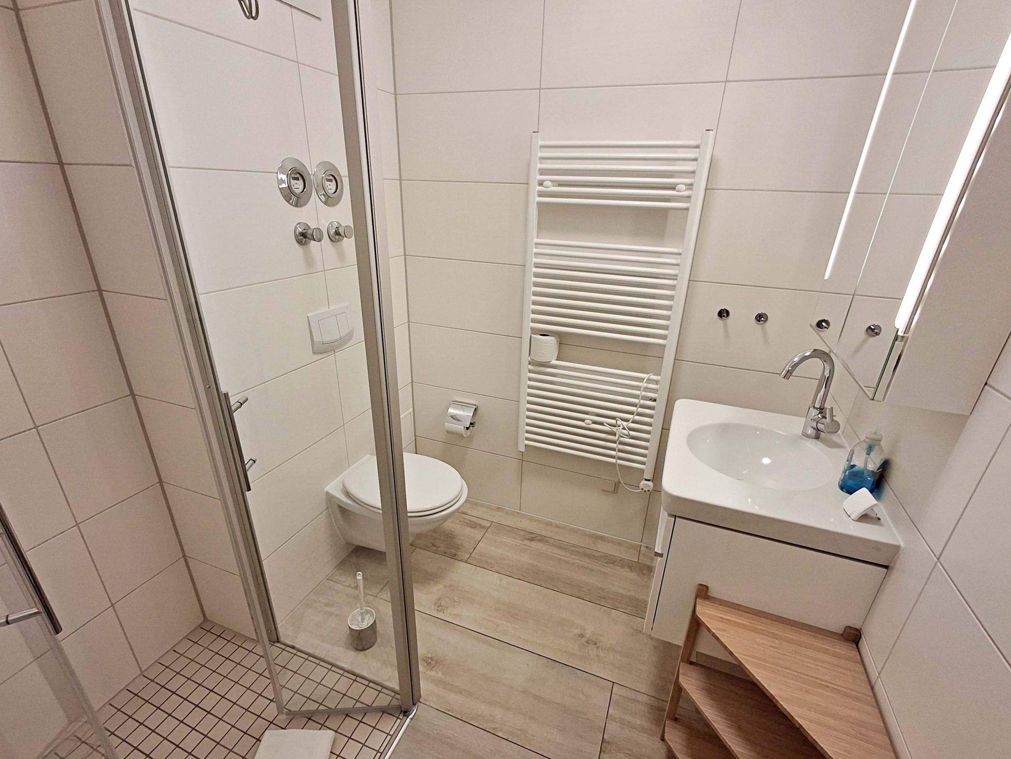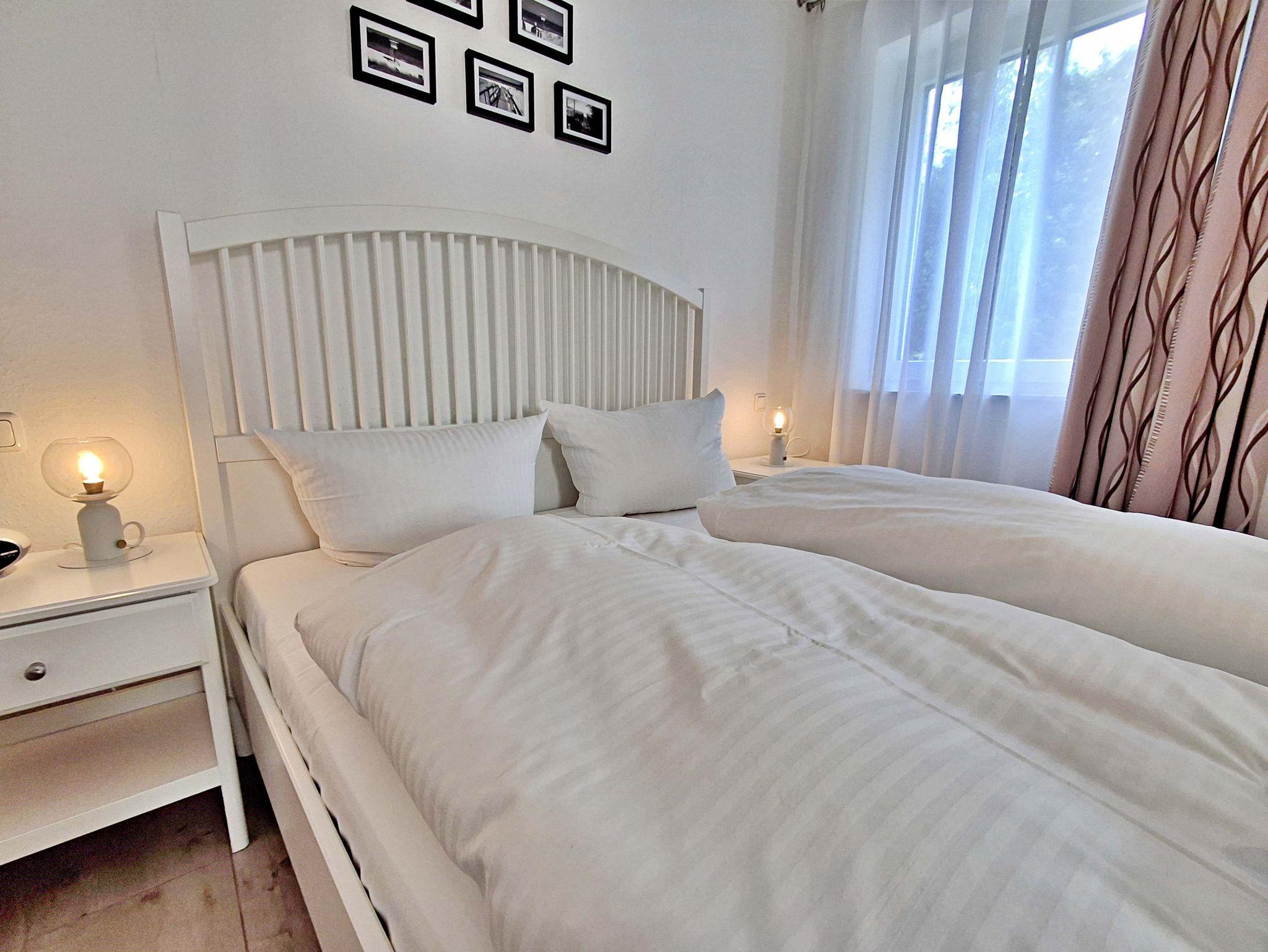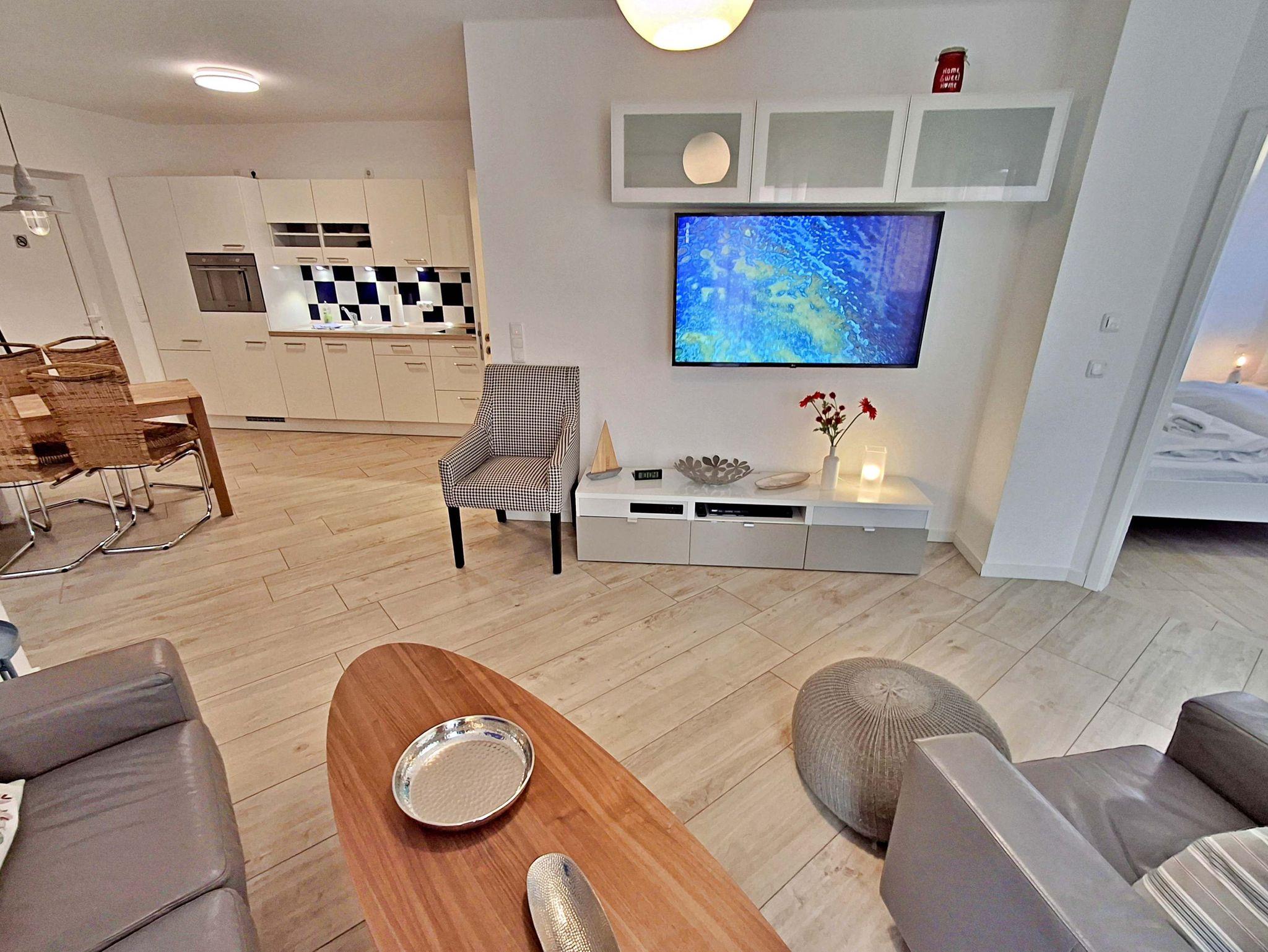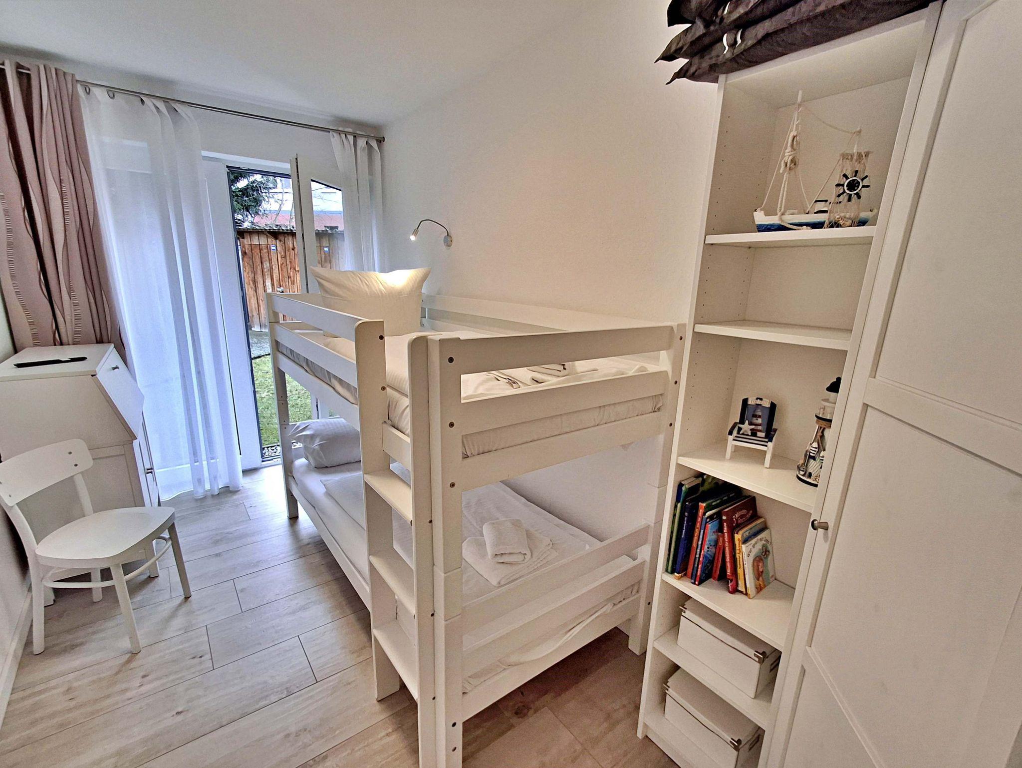 Diese gemütliche Unterkunft im Erdgeschoss bietet auf großzügigen 54 m² ausreichend Platz für bis zu 4 Personen - ideal für eine Familie mit 2 Erwachsenen und 2 Kindern. Im einladenden Wohn- und Essbereich finden Sie eine bequeme Couch, einen Sessel und einen großen Flachbild-TV (55 Zoll), der für entspannte Abende sorgt. Die offene Küche ist komplett ausgestattet und lässt keine Wünsche offen: sie verfügt über ein Induktionskochfeld, Mikrowelle, Heißluftofen, Kühlschrank und Geschirrspüler. Der Essplatz mit 4 Stühlen lädt zu gemeinsamen Mahlzeiten ein. Das erste Schlafzimmer ist mit einem gemütlichen Doppelbett (1,60 x 2 m) ausgestattet, während das zweite Schlafzimmer ein Etagenbett (jeweils 0,90 x 2 m), einen Sekretär und einen weiteren Flachbild-TV bietet. Das moderne Bad verfügt über eine ebenerdige Dusche/WC, eine Handtuchheizung, einen Waschtisch mit Spiegelschrank und einen Fön.