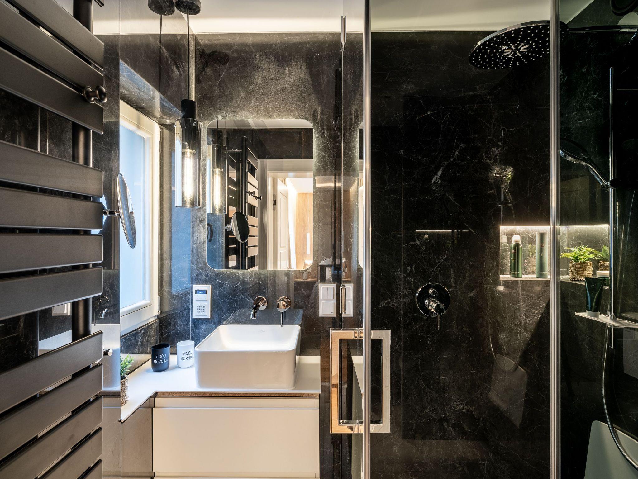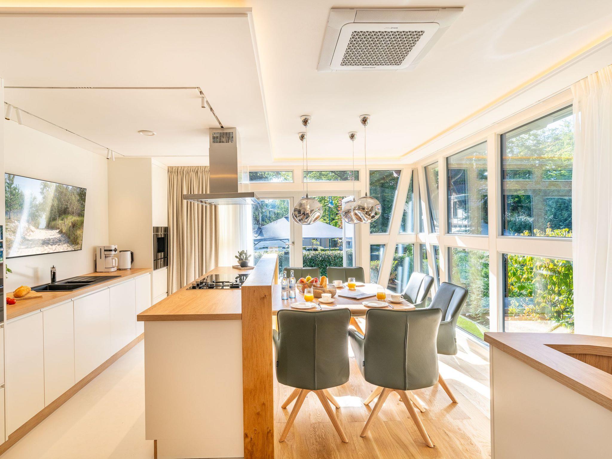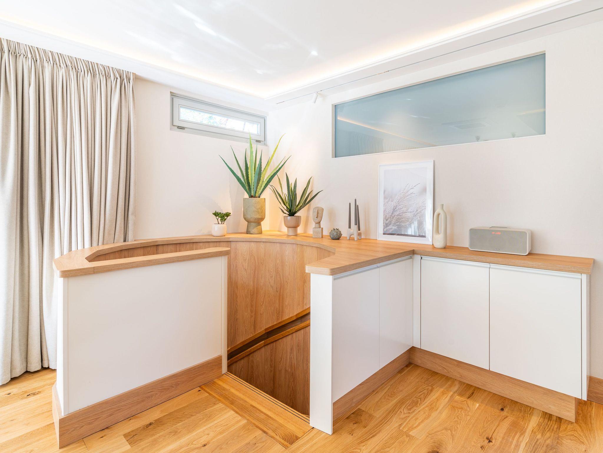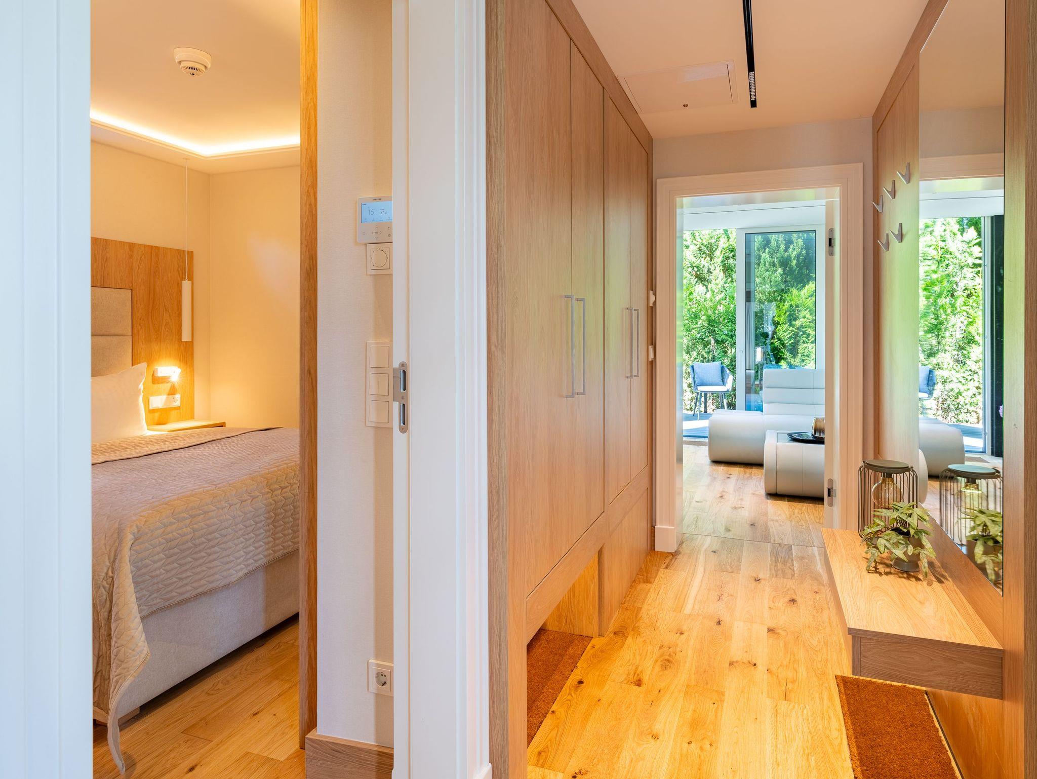 Erdgeschoss: Wohnbereich mit Flat-TV, Gaskamin, großzügigen Fensterflächen, individuell einstellbare Verschattungsanlage und direktem Zugang zur möblierten Terrasse mit zwei Relaxliegen und kleiner Sitzecke ? perfekt für entspannte Sonnenstunden. Hochwertige, separate Küche mit Esstisch für sechs Personen, Smart-TV, Induktionskochfeld, Kombibackofen mit Mikrowelle, Wärmeschublade mit Tellerwärmer, Side-by-Side-Kühlschrank mit großem Gefrierschrank und Wasser- und Eiswürfelspender, Geschirrspüler sowie Kaffeevollautomat. Vom Essbereich gelangen Sie auf eine zweite Terrasse mit großem Gartentisch, Sonnenschirm und Elektrogrill ? ideal für gesellige Grillabende. Im Erdgeschoss befindet sich zudem ein gemütliches Schlafzimmer mit Doppelbett (160 x 200 cm) und Smart-TV sowie ein modernes Badezimmer mit Dusche und WC.