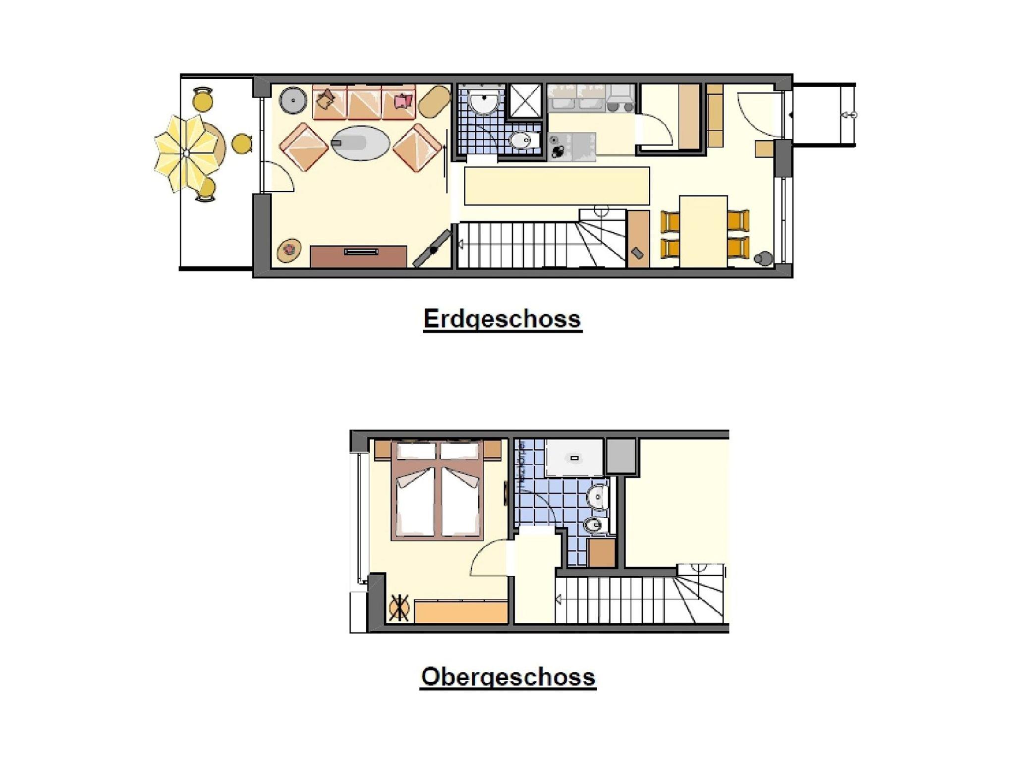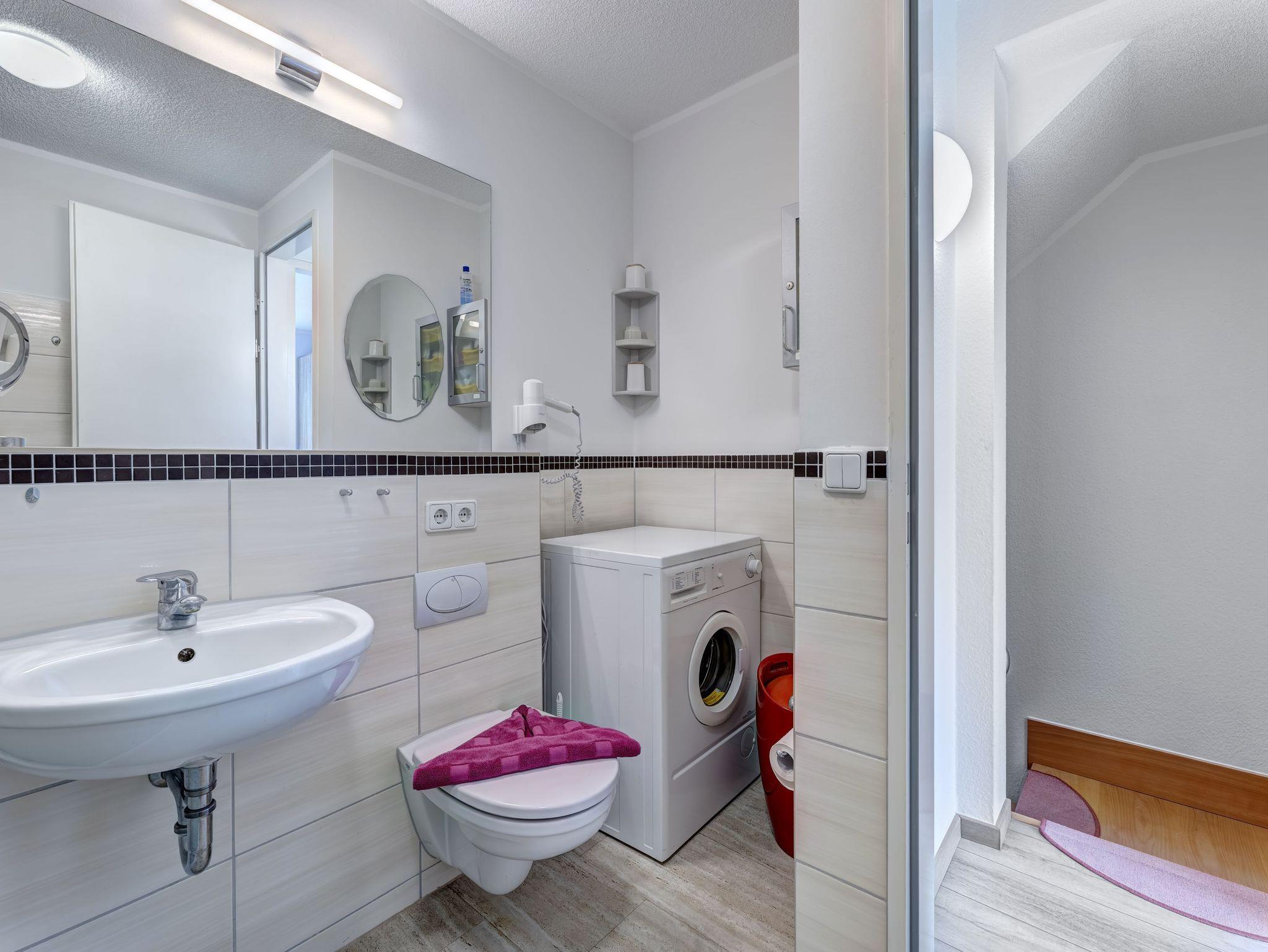 Im Obergeschoss befindet sich neben dem Schlafzimmer ein weiteres Badezimmer mit Dusche sowie eine Waschmaschine, die Ihnen zusätzlichen Komfort bietet. Auch im Erdgeschoss finden Sie ein weiteres Badezimmer mit WC und Waschbecken.