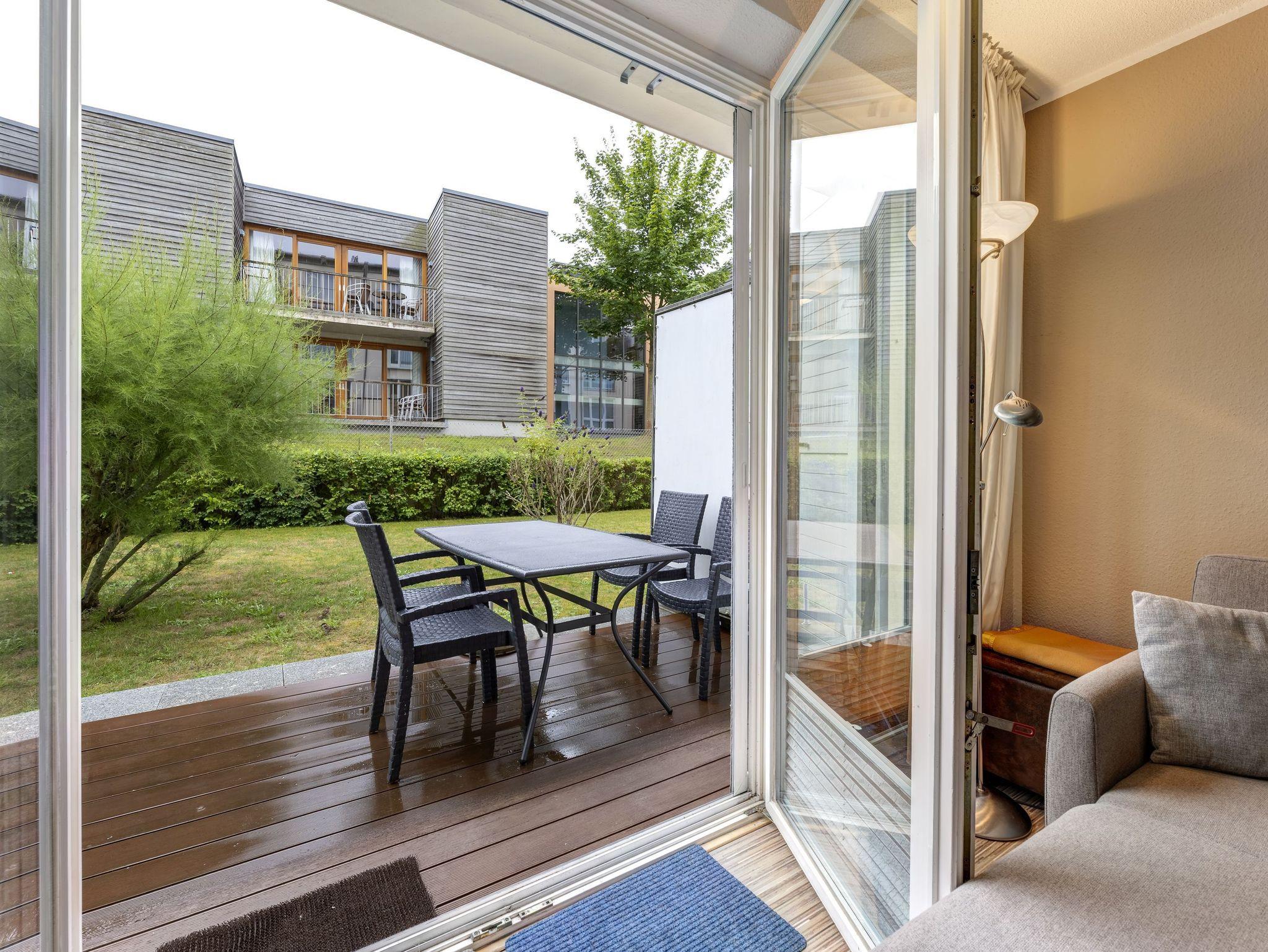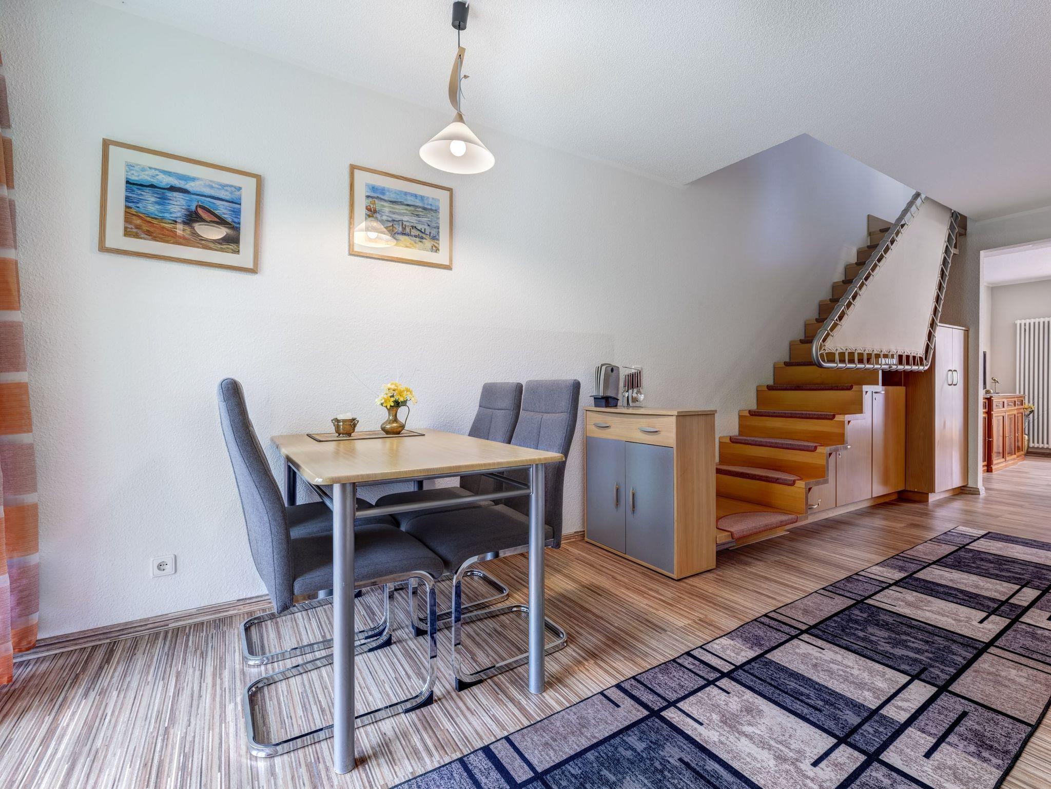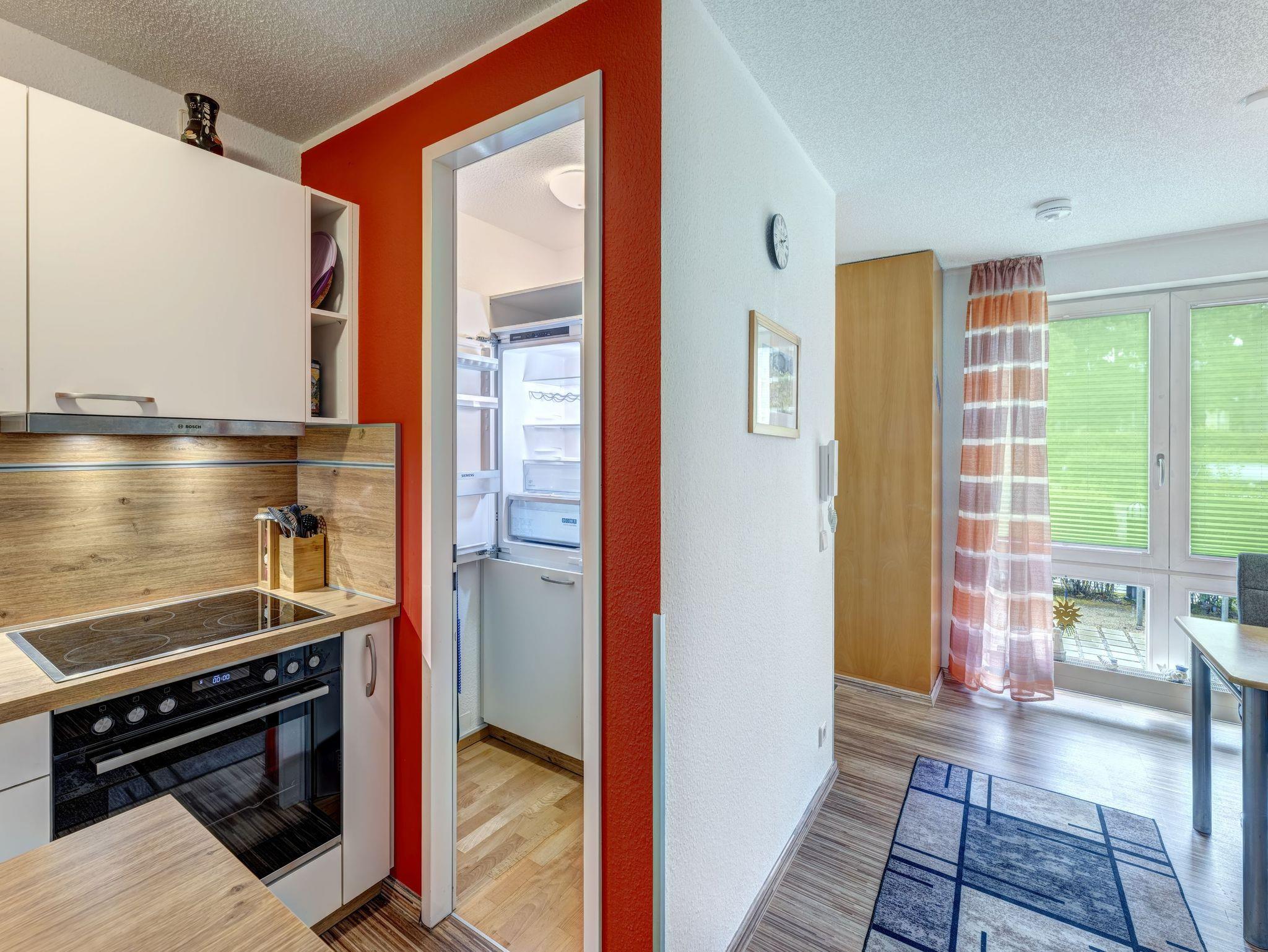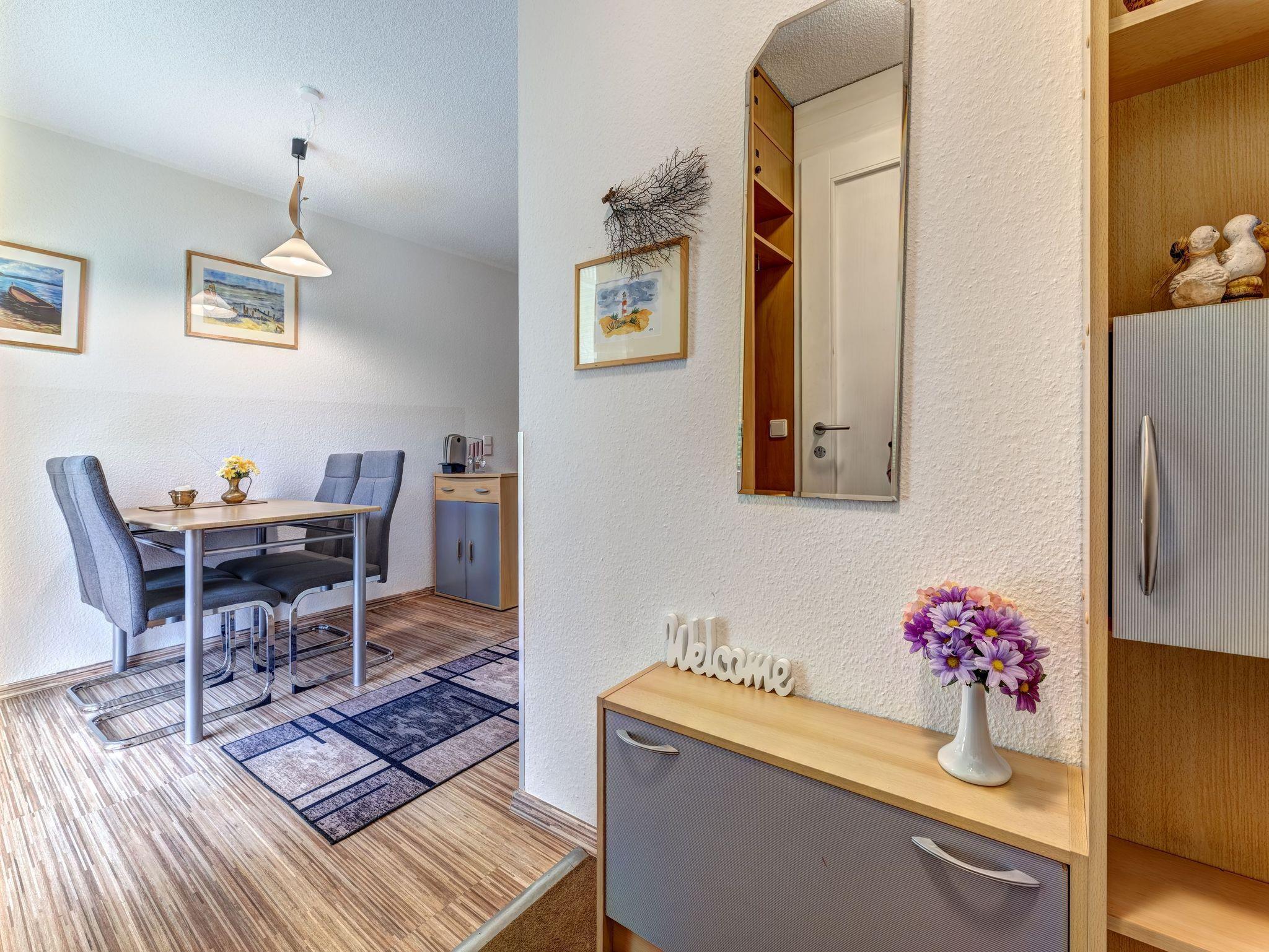 In der modernen Appartementanlage „Forum Marinar“ erwartet Sie eine liebevoll eingerichtete Maisonette-Ferienwohnung mit einer gemütlichen Terrasse und einer kleinen, vorgelagerten Wiese, die zum Entspannen einlädt. Diese charmante 2-Raum-Wohnung erstreckt sich über das Erdgeschoss, wo sich der Eingangsbereich mit einer frisch renovierten Küche aus dem Jahr 2022 und einem Esstisch für 2 Personen befindet. Die gut ausgestattete Küche lässt keine Wünsche offen und bietet alles, was Sie für einen angenehmen Urlaub benötigen - darunter eine Kaffeemaschine, Mikrowelle, Wasserkocher, Toaster, ein großer Herd, Geschirrspüler und ein Kühlschrank mit Frostfach.