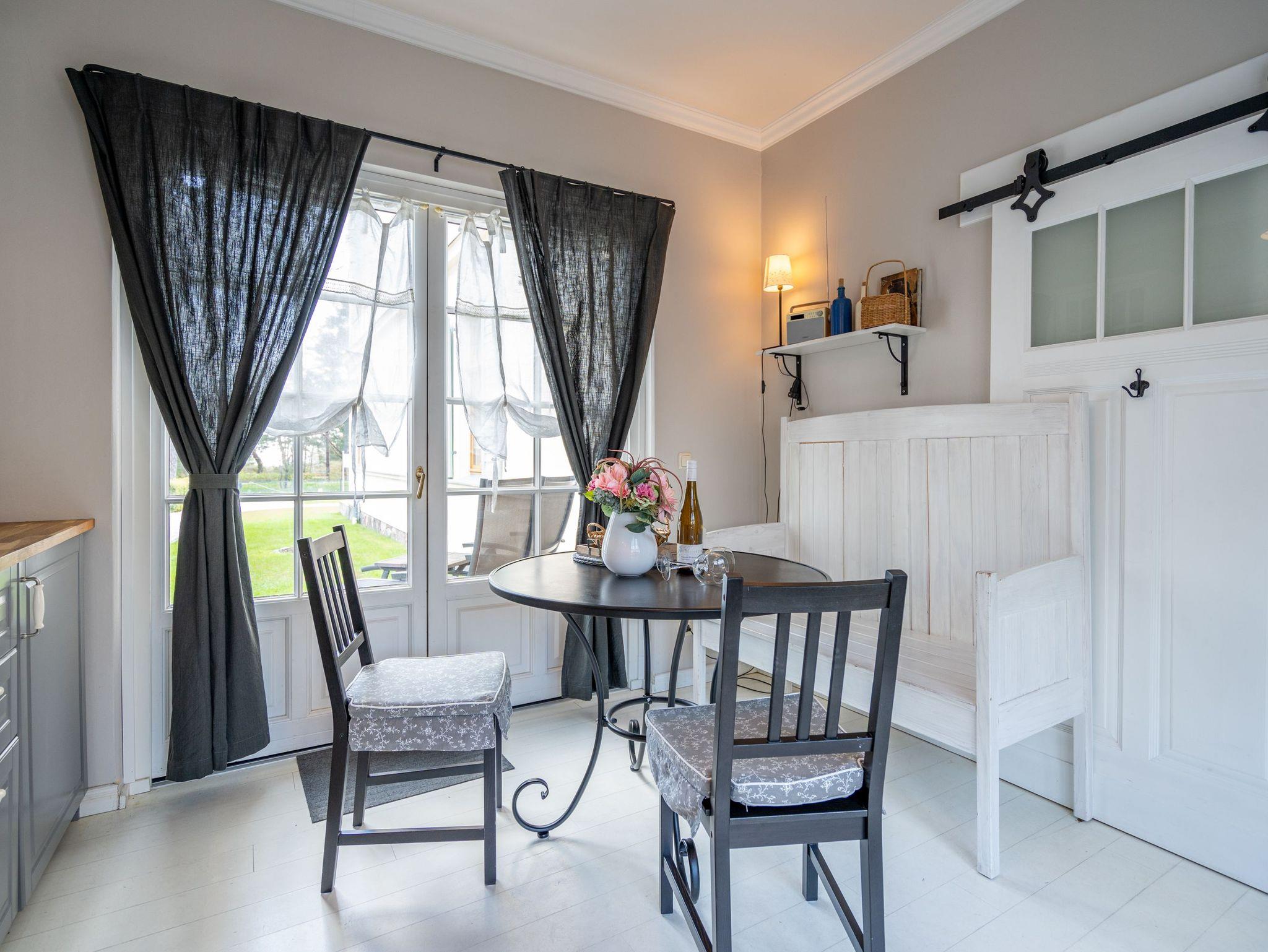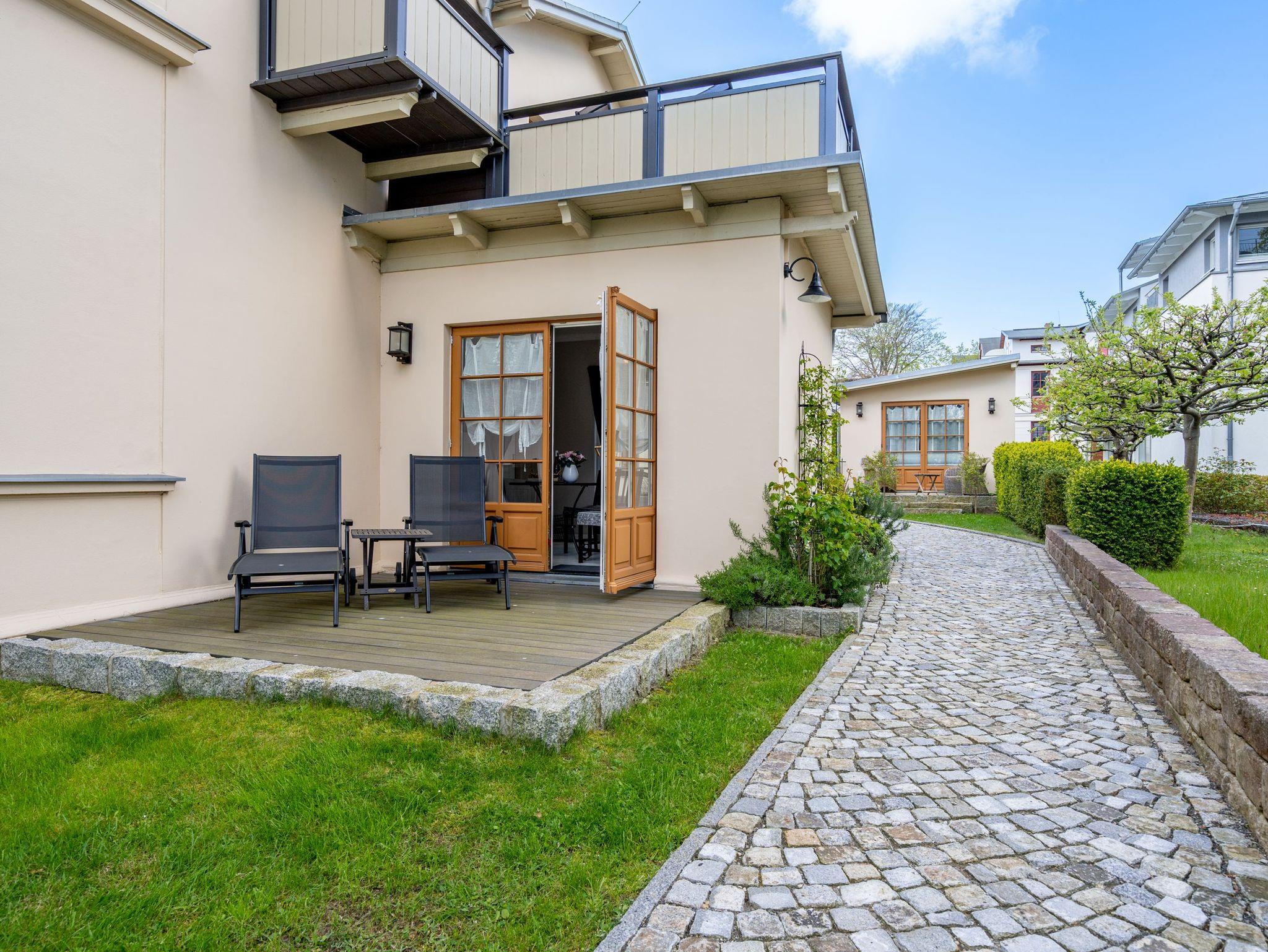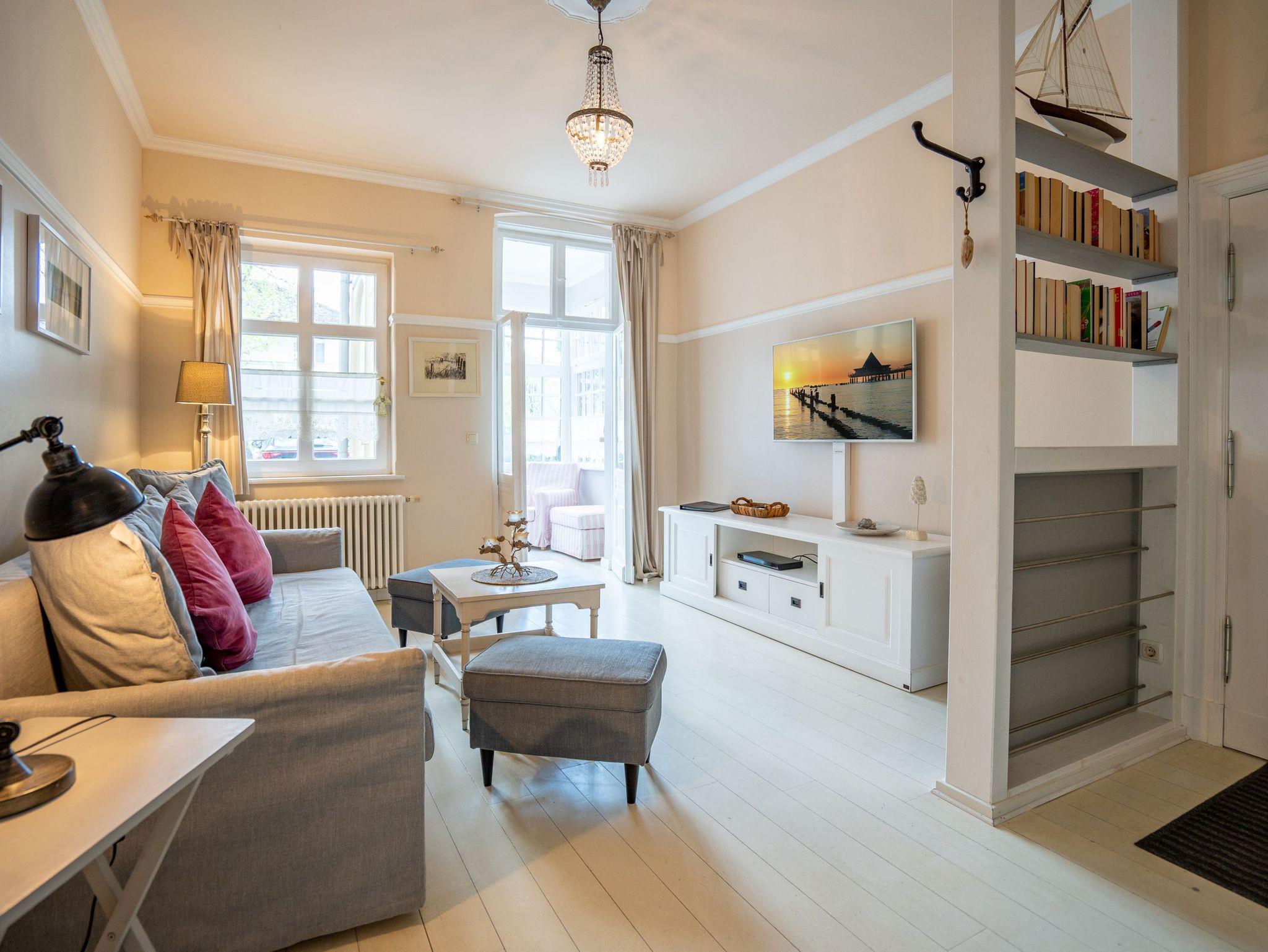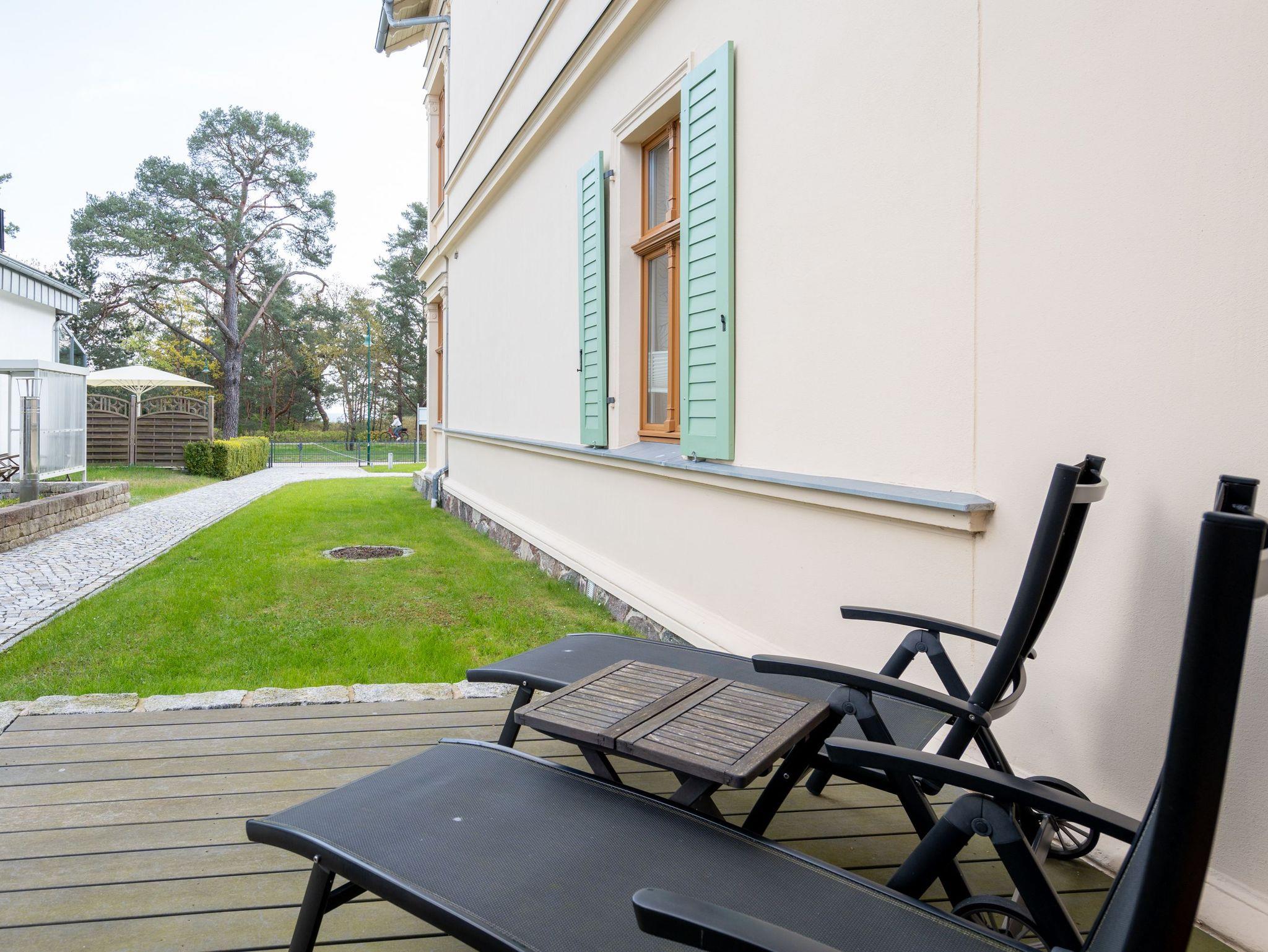 Leichtigkeit, Esprit und Charme versprüht unser neues Urlaubsdomizil im Erdgeschoss der Villa Saphira. Ob sie zu zweit oder mit kleiner Familie reisen (2 Erwachsene und 1 Kind bis 5 Jahre), diese 2-Raum-Ferienwohnung ( 59 qm) versprüht sogleich Urlaubsfreude. Helle Farben, ein weißer Holzfußboden und wunderbar kombinierte Möbel verleihen dem Appartement ein ganz besonderes Flair. Der hübsche Wohnbereich ist mit bequemer Sitzgruppe und Flat-TV ausgestattet, die seitliche kleine Veranda mit Bank und Tisch lädt zum Verweilen ein. Das Schlafzimmer mit Doppelbett (1,60m x 2,00m) bietet außerdem eine Schlafmöglichkeit durch ein zusätzliches Juniorbett (0,70m x 1,60m). Die Küche mit angrenzender Terrasse (mit Gartenmöbeln ausgestattet und zur Südseite gelegen) findet in der zweiten Veranda Platz. Luftig und hell mit einer schönen Essgruppe gestaltet, lädt sie ein, ganz entspannt in den Tag zu starten und dabei den Blick auf die Heringsdorfer Promenade zu genießen. Die Wohnung wird komplettiert mit einem Wellnessbad mit einer Finnischen Sauna, Dusche, WC und Waschbecken. Ein Pkw-Stellplatz befindet sich direkt am Haus. Auf Nachfrage ist es möglich ein 2. Kind ( bis 2 Jahre im Kinderreisebett) mitzubringen. Bei Ihrer Anreise sind die Betten bezogen und Handtücher liegen bereit (als Erstausstattung). Das WLAN-Netz im Haus kann kostenfrei genutzt werden. Für den Tag am Meer steht Ihnen von Mitte Mai bis September (je nach Witterung) ein Strandkorb am Strand zur Verfügung. Sie planen einen größeren Familienausflug - dann lässt sich diese Wohnung super mit der Wohnung 07 ( im Obergeschoss) kombinieren. Beide Appartements befinden sich in einem Haus und sind über den selben Haupteingang zu nutzen.