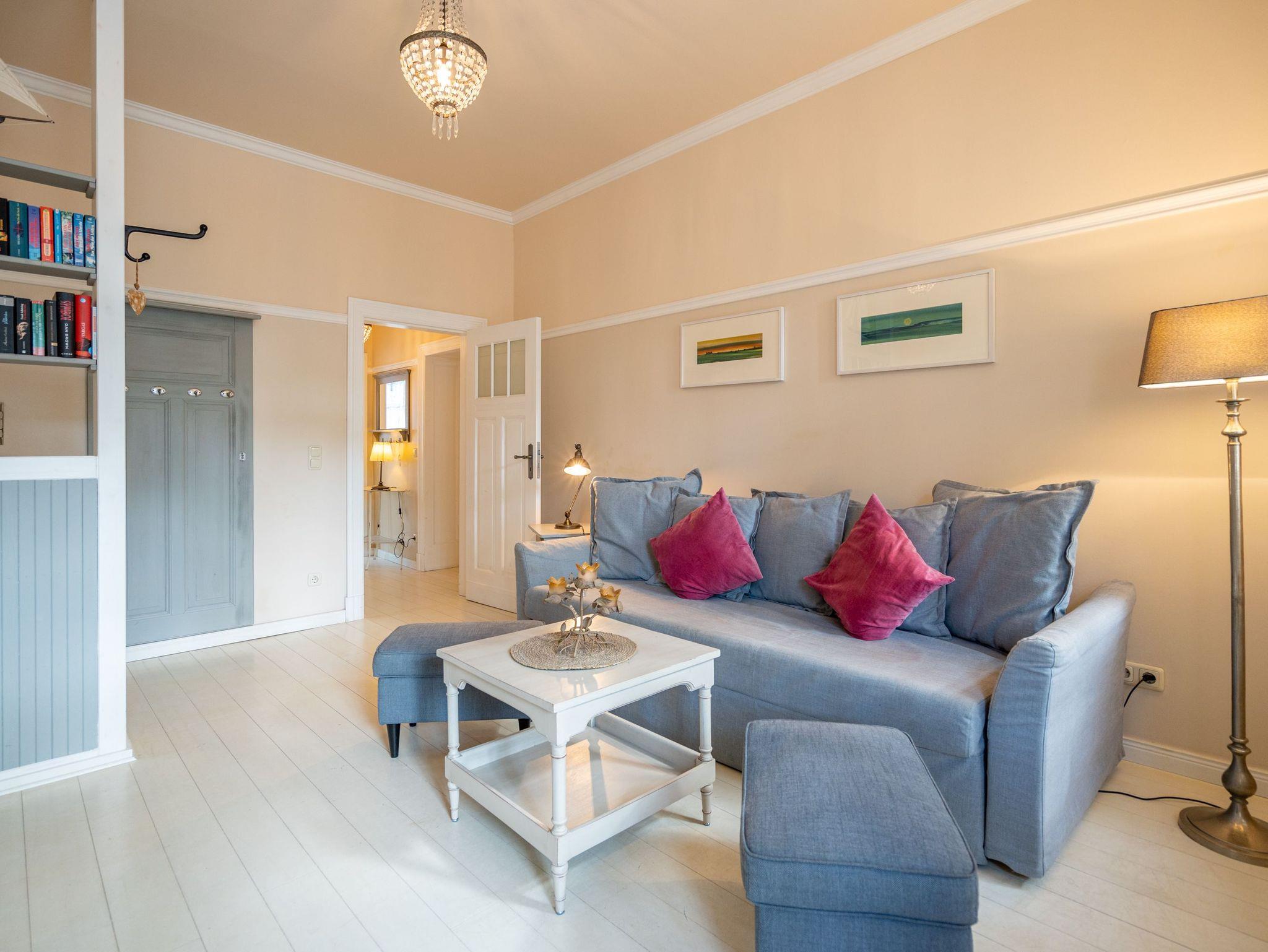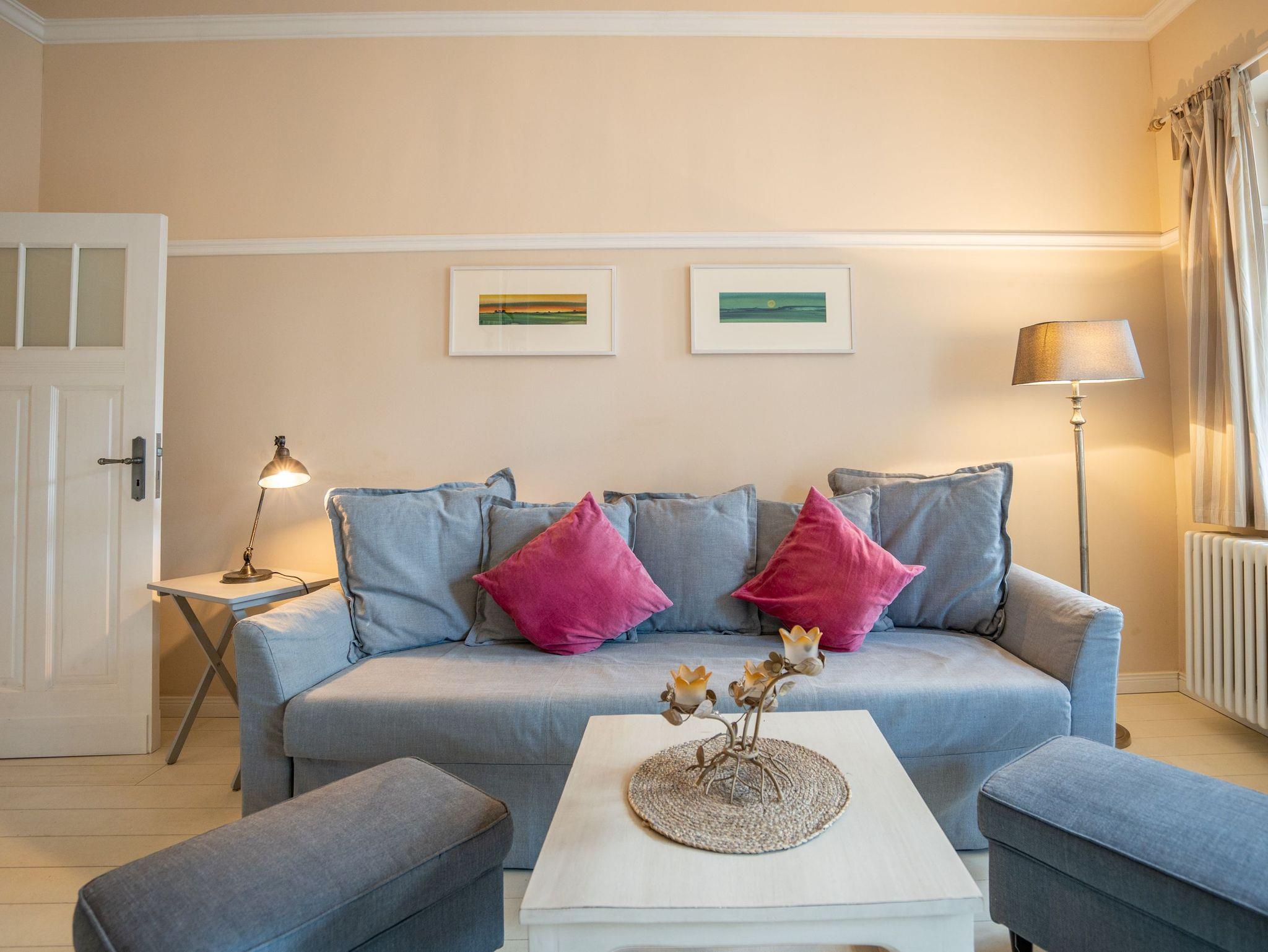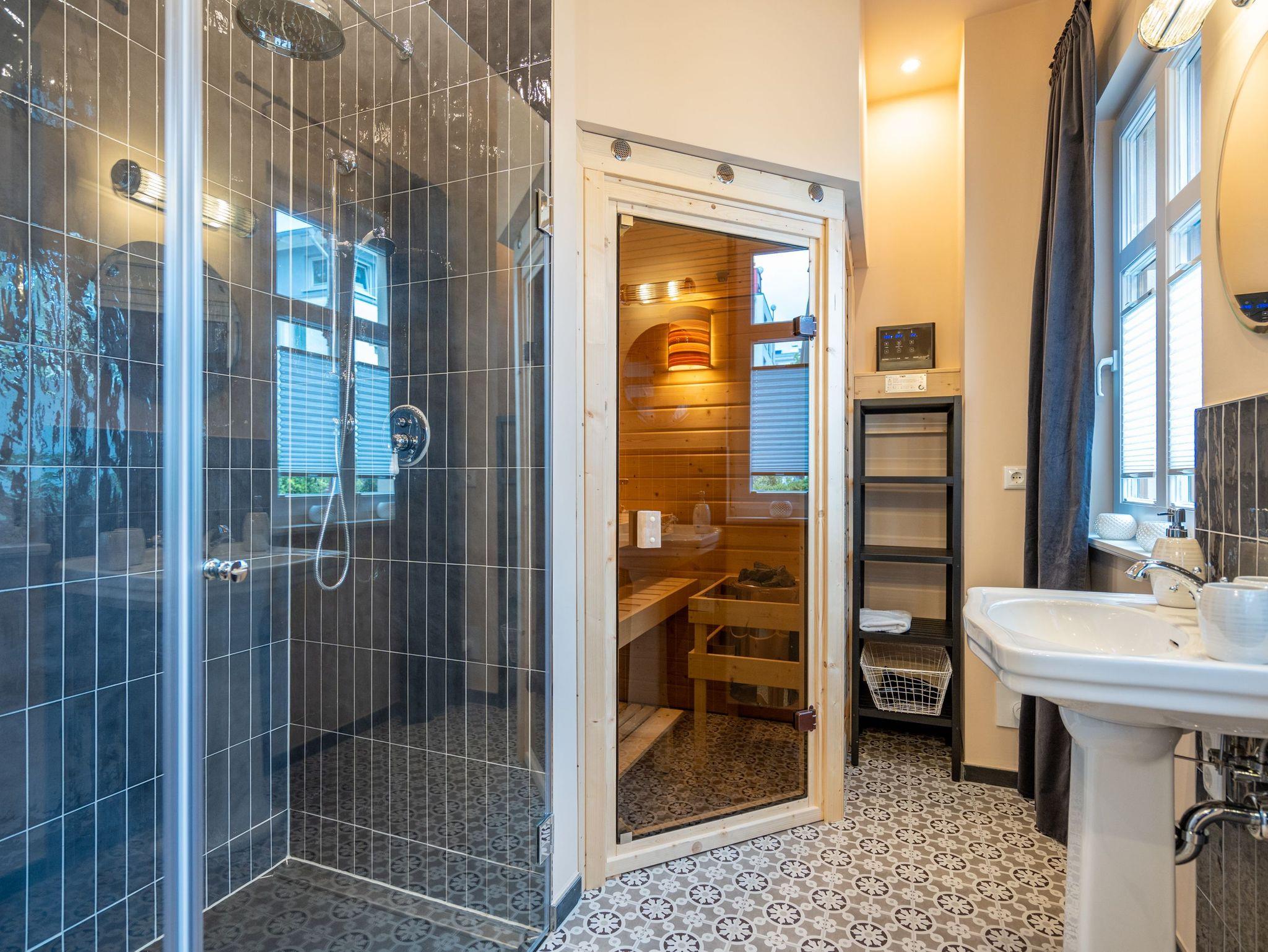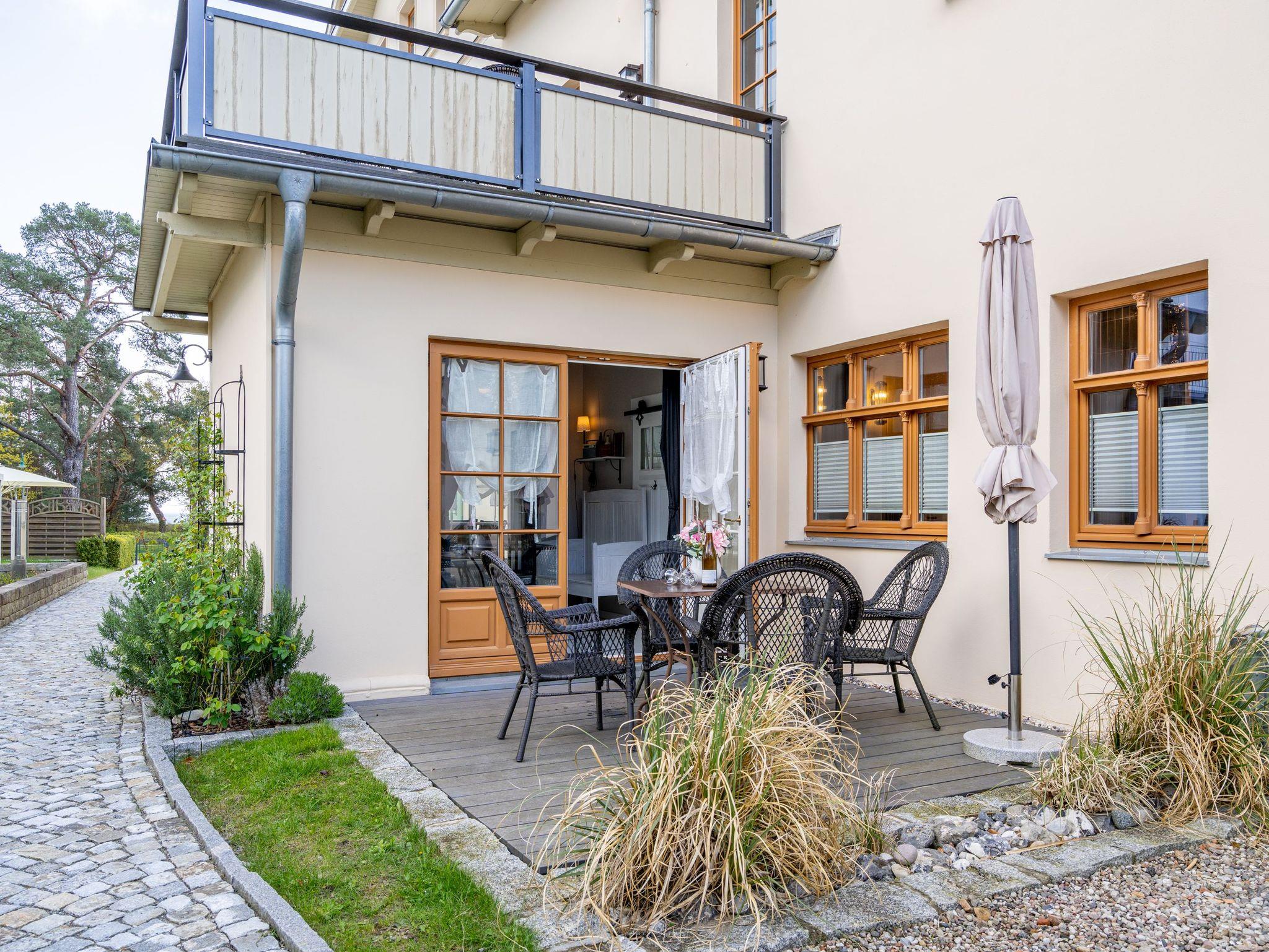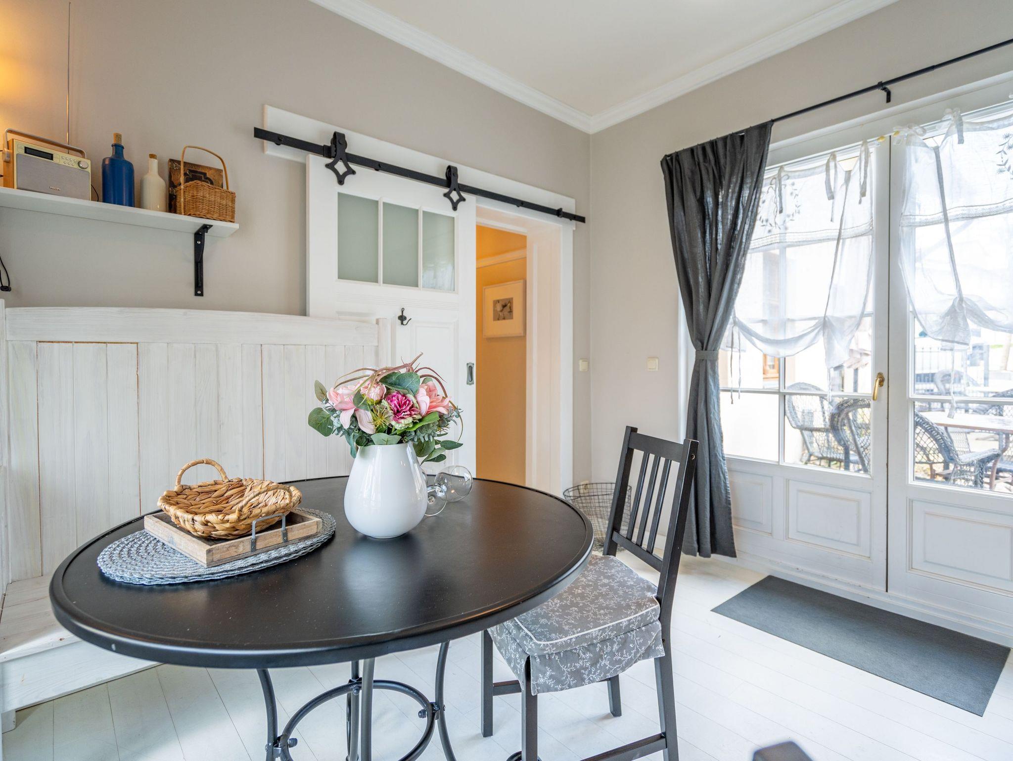 Leichtigkeit, Esprit und Charme versprüht unser neues Urlaubsdomizil im Erdgeschoss der Villa Saphira. Ob sie zu zweit oder mit kleiner Familie reisen (2 Erwachsene und 1 Kind bis 5 Jahre), diese 2-Raum-Ferienwohnung ( 59 qm) versprüht sogleich Urlaubsfreude. Helle Farben, ein weißer Holzfußboden und wunderbar kombinierte Möbel verleihen dem Appartement ein ganz besonderes Flair. Der hübsche Wohnbereich ist mit bequemer Sitzgruppe und Flat-TV ausgestattet, die seitliche kleine Veranda mit Bank und Tisch lädt zum Verweilen ein. Das Schlafzimmer mit Doppelbett (1,60m x 2,00m) bietet außerdem eine Schlafmöglichkeit durch ein zusätzliches Juniorbett (0,70m x 1,60m). Die Küche mit angrenzender Terrasse (mit Gartenmöbeln ausgestattet und zur Südseite gelegen) findet in der zweiten Veranda Platz. Luftig und hell mit einer schönen Essgruppe gestaltet, lädt sie ein, ganz entspannt in den Tag zu starten und dabei den Blick auf die Heringsdorfer Promenade zu genießen. Die Wohnung wird komplettiert mit einem Wellnessbad mit einer Finnischen Sauna, Dusche, WC und Waschbecken. Ein Pkw-Stellplatz befindet sich direkt am Haus. Auf Nachfrage ist es möglich ein 2. Kind ( bis 2 Jahre im Kinderreisebett) mitzubringen. Bei Ihrer Anreise sind die Betten bezogen und Handtücher liegen bereit (als Erstausstattung). Das WLAN-Netz im Haus kann kostenfrei genutzt werden. Für den Tag am Meer steht Ihnen von Mitte Mai bis September (je nach Witterung) ein Strandkorb am Strand zur Verfügung. Sie planen einen größeren Familienausflug - dann lässt sich diese Wohnung super mit der Wohnung 07 ( im Obergeschoss) kombinieren. Beide Appartements befinden sich in einem Haus und sind über den selben Haupteingang zu nutzen.