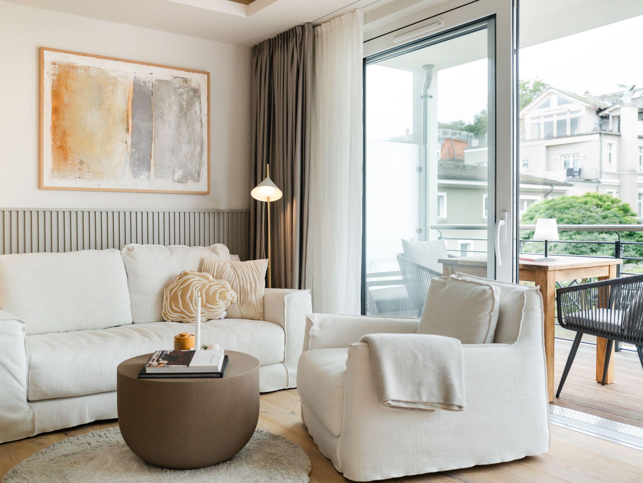Ihr Urlaub zu zweit war noch nie so erholsam - herzlich willkommen in der traumhaften Ferienwohnung Nr. 05 im Quartier am Strand. Mit besonders viel Liebe zum Detail gestaltet, lässt das 50 Quadratmeter große, „kleine“ Appartement keine Wünsche offen. Entspannen Sie sich auf dem gemütlichen GERVASONI Sofa vor dem Kamin mit kuscheligem Teppich unter den Füßen oder schauen Sie Ihre Lieblingsserie auf dem Flatscreen-TV. Der schöne Essplatz lädt mit einer eingebauten Sitzbank zum „länger sitzenbleiben“ ein und in der offenen Küche (Backofen, Induktionsherd, Kühlschrank, Gefrierschrank und Spülmaschine) lässt sich, wenn gewünscht problemlos ein ganzes Urlaubsmenü zaubern. Eine hochwertige Nespresso Maschine zaubert Ihnen einen leckeren Kaffee für den perfekten Start in den Urlaubstag. Das offene Schlafzimmer überzeugt mit tollem Komfort. Das Boxspringdoppelbett (1,80m x 2,00m) von COCO-Mat, gefertigt aus hochwertiger Naturmaterialien, sorgt für erholsame Nächte. Mit dem zweiten Flat TV lässt es sich auch bequem aus dem Bett TV schauen. Die wertigen Tischlereinbauten im Flurbereich schaffen Platz für Ihre Urlaubsgarderobe. Gleich angrenzend befindet sich das innenliegende Bad mit Glasdusche, WC und Waschtisch und einem weiteren Highlight, der privaten Sauna. Die Usedomer Sonne genießt man auf dem großzügigen Süd-West-Balkon (15 qm) mit Essplatz und Sonnenliege. In den warmen Monaten (Mitte Mai bis September) steht Ihnen ein Strandkorb direkt am Strand zur Verfügung, um das Meeresrauschen in vollen Zügen zu genießen. Für Ihr Fahrzeug bieten wir einen Stellplatz in der Tiefgarage, der optional mit einer Ladestation für E-Autos zubuchbar ist. Ein wohnungseigener Fahrradabstellraum rundet das Angebot ab.
