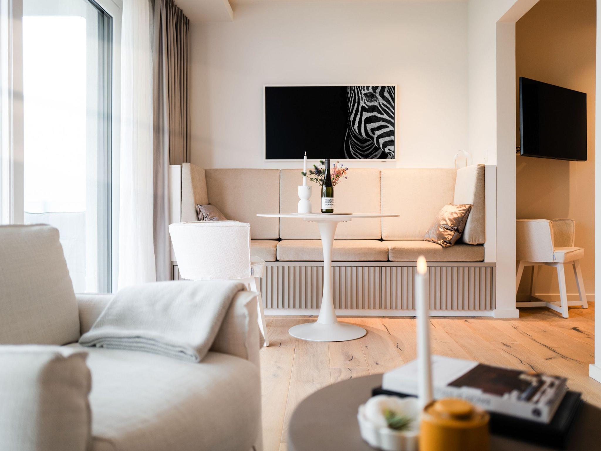 Ihr Urlaub zu zweit war noch nie so erholsam - herzlich willkommen in der traumhaften Ferienwohnung Nr. 05 im Quartier am Strand. Mit besonders viel Liebe zum Detail gestaltet, lässt das 50 Quadratmeter große, ?kleine? Appartement keine Wünsche offen. Entspannen Sie sich auf dem gemütlichen GERVASONI Sofa vor dem Kamin mit kuscheligem Teppich unter den Füßen oder schauen Sie Ihre Lieblingsserie auf dem Flatscreen-TV. Der schöne Essplatz lädt mit einer eingebauten Sitzbank zum ?länger sitzenbleiben? ein und in der offenen Küche (Backofen, Induktionsherd, Kühlschrank, Gefrierschrank und Spülmaschine) lässt sich, wenn gewünscht problemlos ein ganzes Urlaubsmenü zaubern. Eine hochwertige Nespresso Maschine zaubert Ihnen einen leckeren Kaffee für den perfekten Start in den Urlaubstag. Das offene Schlafzimmer überzeugt mit tollem Komfort. Das Boxspringdoppelbett (1,80m x 2,00m) von COCO-Mat, gefertigt aus hochwertiger Naturmaterialien, sorgt für erholsame Nächte. Mit dem zweiten Flat TV lässt es sich auch bequem aus dem Bett TV schauen. Die wertigen Tischlereinbauten im Flurbereich schaffen Platz für Ihre Urlaubsgarderobe. Gleich angrenzend befindet sich das innenliegende Bad mit Glasdusche, WC und Waschtisch und einem weiteren Highlight, der privaten Sauna. Die Usedomer Sonne genießt man auf dem großzügigen Süd-West-Balkon (15 qm) mit Essplatz und Sonnenliege. In den warmen Monaten (Mitte Mai bis September) steht Ihnen ein Strandkorb direkt am Strand zur Verfügung, um das Meeresrauschen in vollen Zügen zu genießen. Für Ihr Fahrzeug bieten wir einen Stellplatz in der Tiefgarage, der optional mit einer Ladestation für E-Autos zubuchbar ist. Ein wohnungseigener Fahrradabstellraum rundet das Angebot ab.