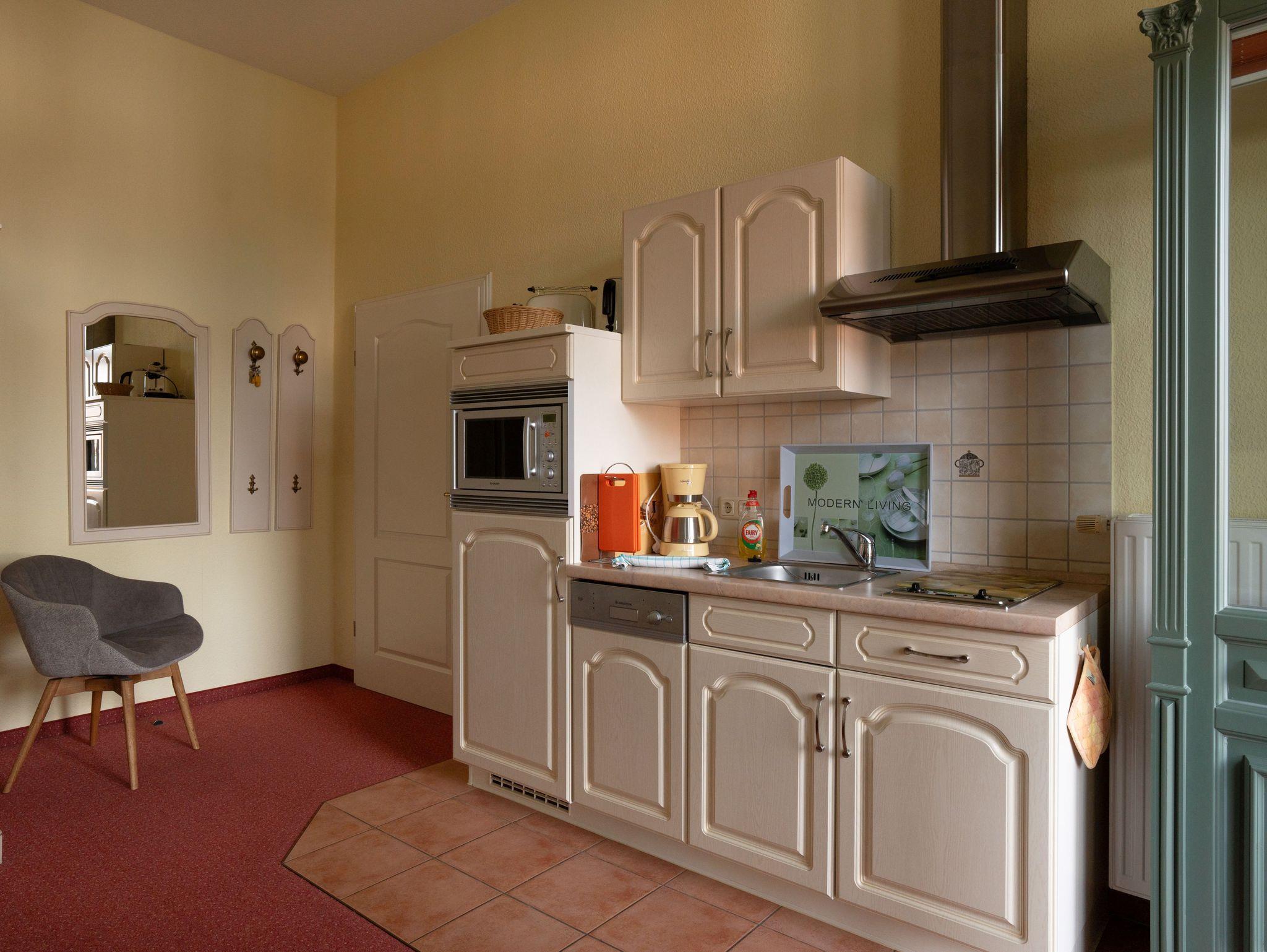 Ceranfeld und Mikrowelle. Bad mit Dusche und WC.