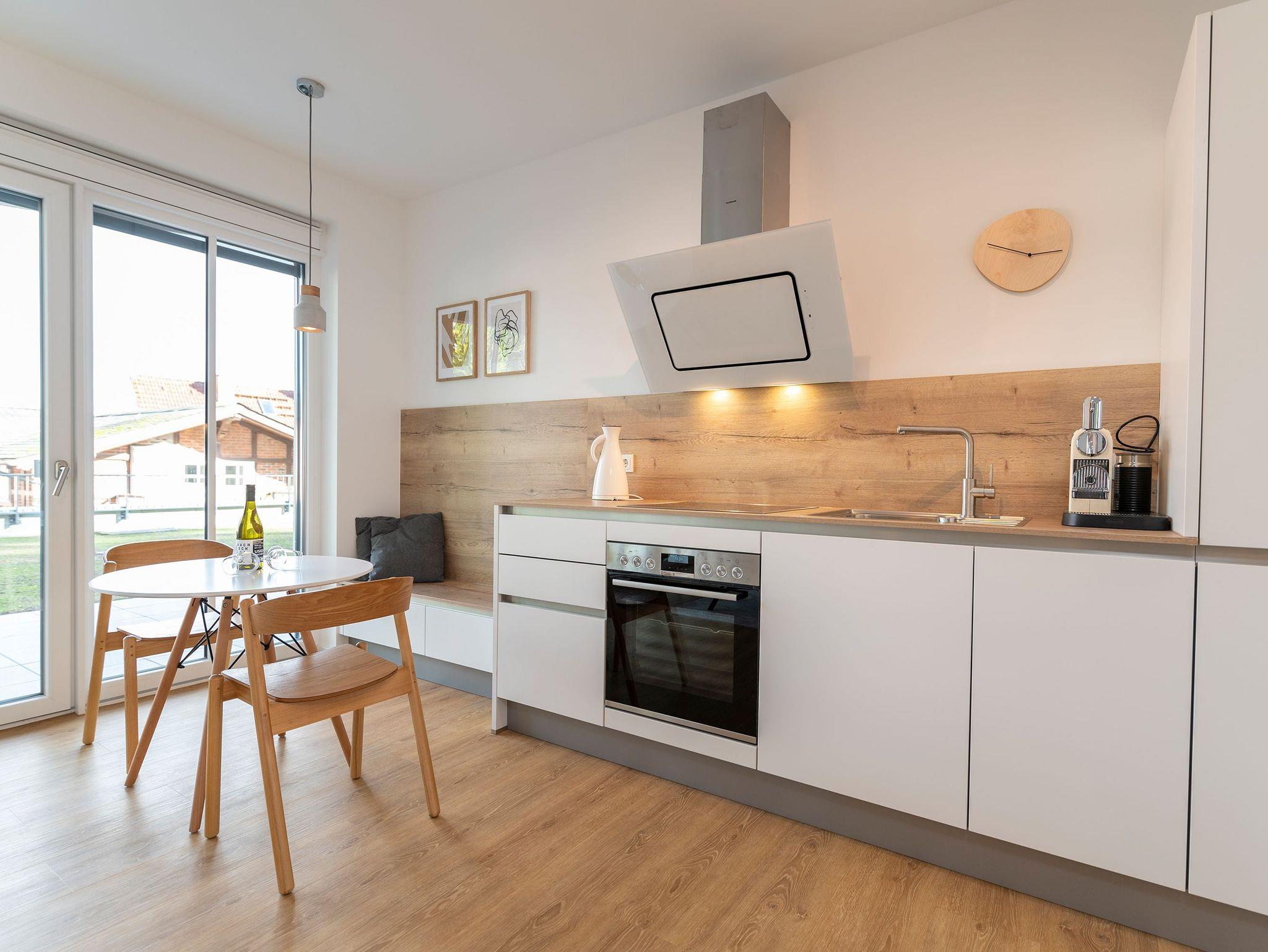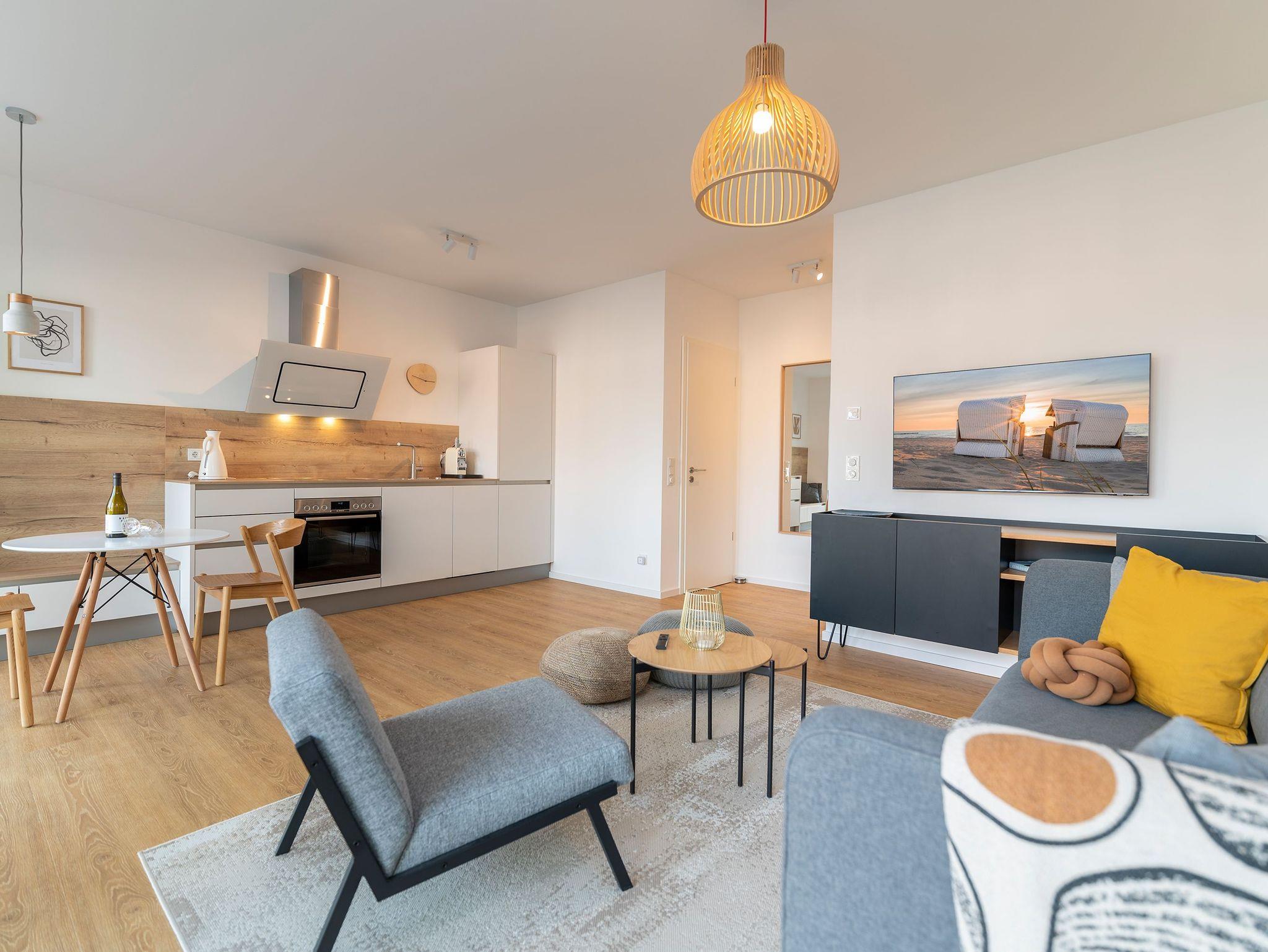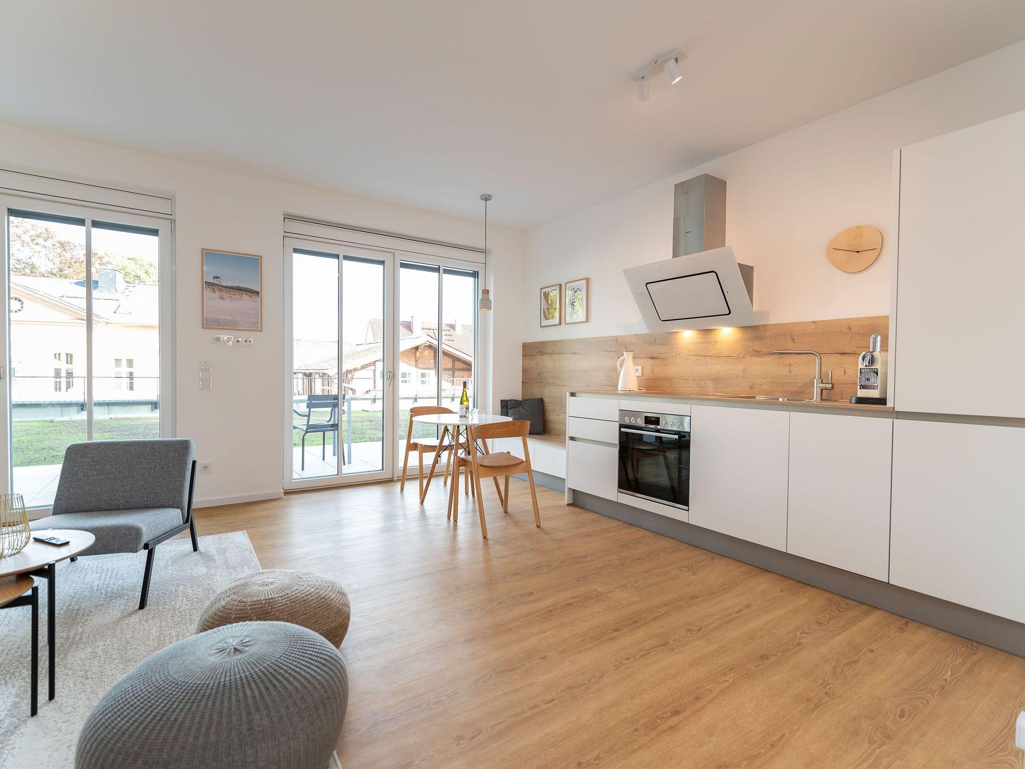 Die Wohnung 11 im Erdgeschoss empfängt bis zu 3 Personen und ein Kleinkind bis 2 Jahre, ideal für Familien oder kleine Gruppen, die Wert auf Komfort und Stil legen. Genießen Sie das hochwertige Boxspringbett im Schlafzimmer und ein zusätzliches Schlafsofa im lichtdurchfluteten Wohn- und Essbereich. Die Küchenzeile, ausgestattet mit einer Nespressomaschine, und der schöne Essplatz bieten alles für gemütliche Mahlzeiten.