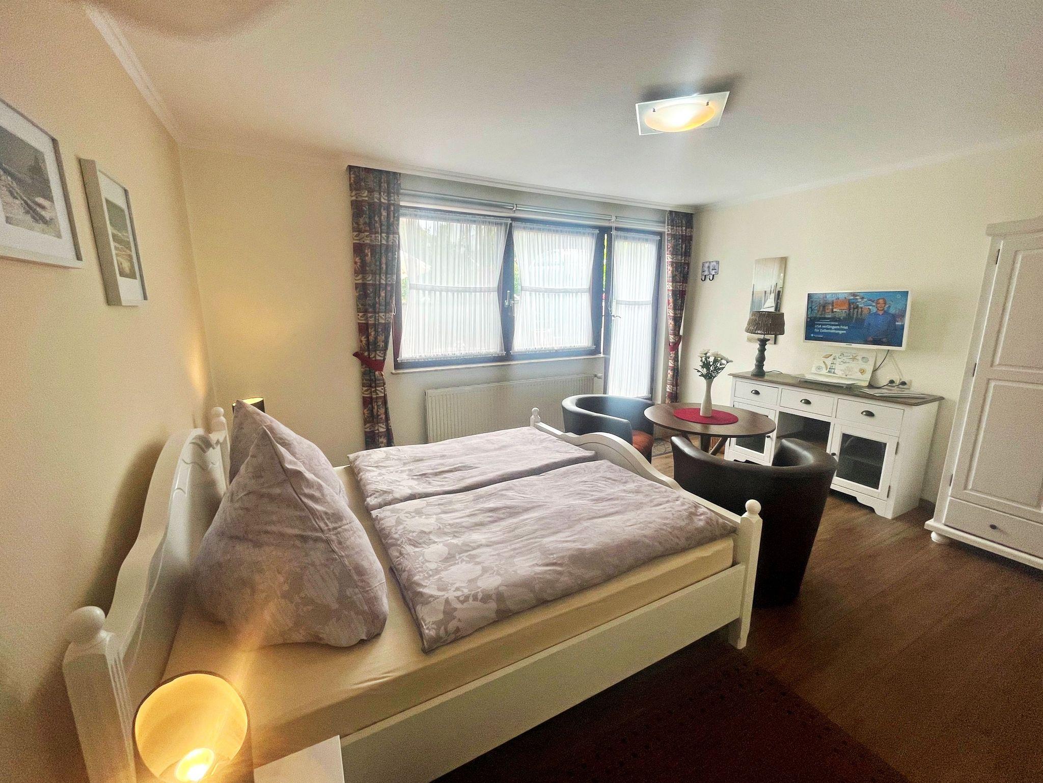 Mit einer Größe von ca. 23 qm bietet das Ferienzimmer Ihnen einen gemütlichen Rückzugsort für bis zu 2 Personen im Souterrain. Die großen Fenster sorgen für ein helles und freundliches Ambiente, in dem Sie sich sofort wohlfühlen werden.Ein bequemes Doppelbett sorgt für erholsamen Schlaf. Zudem stehen Ihnen ein Flachbild-TV sowie zwei bequeme Sessel und ein Tisch zur Verfügung, die perfekt zum Verweilen und Entspannen einladen. Zur Ausstattung gehört auch ein eigenes Bad mit Dusche und WC, das Sie ganz für sich allein nutzen können. Im Flur erwartet Sie ein kleiner Küchenbereich, der mit Ceranherdplatte, Kühlschrank, Kaffeemaschine, Toaster und Mikrowelle ausgestattet ist. Dieser Bereich steht Ihnen und den anderen Gästen des zweiten Ferienzimmers zur gemeinschaftlichen Nutzung zur Verfügung.
