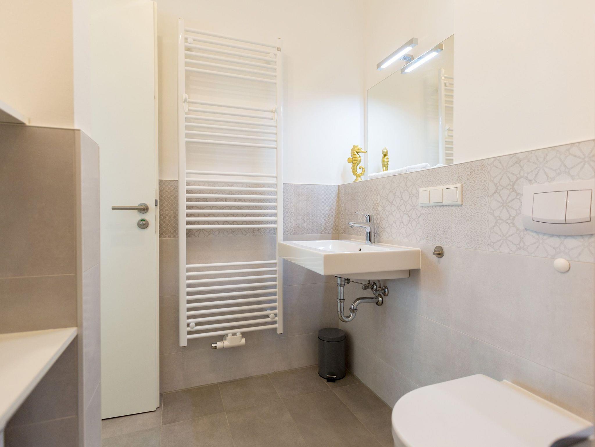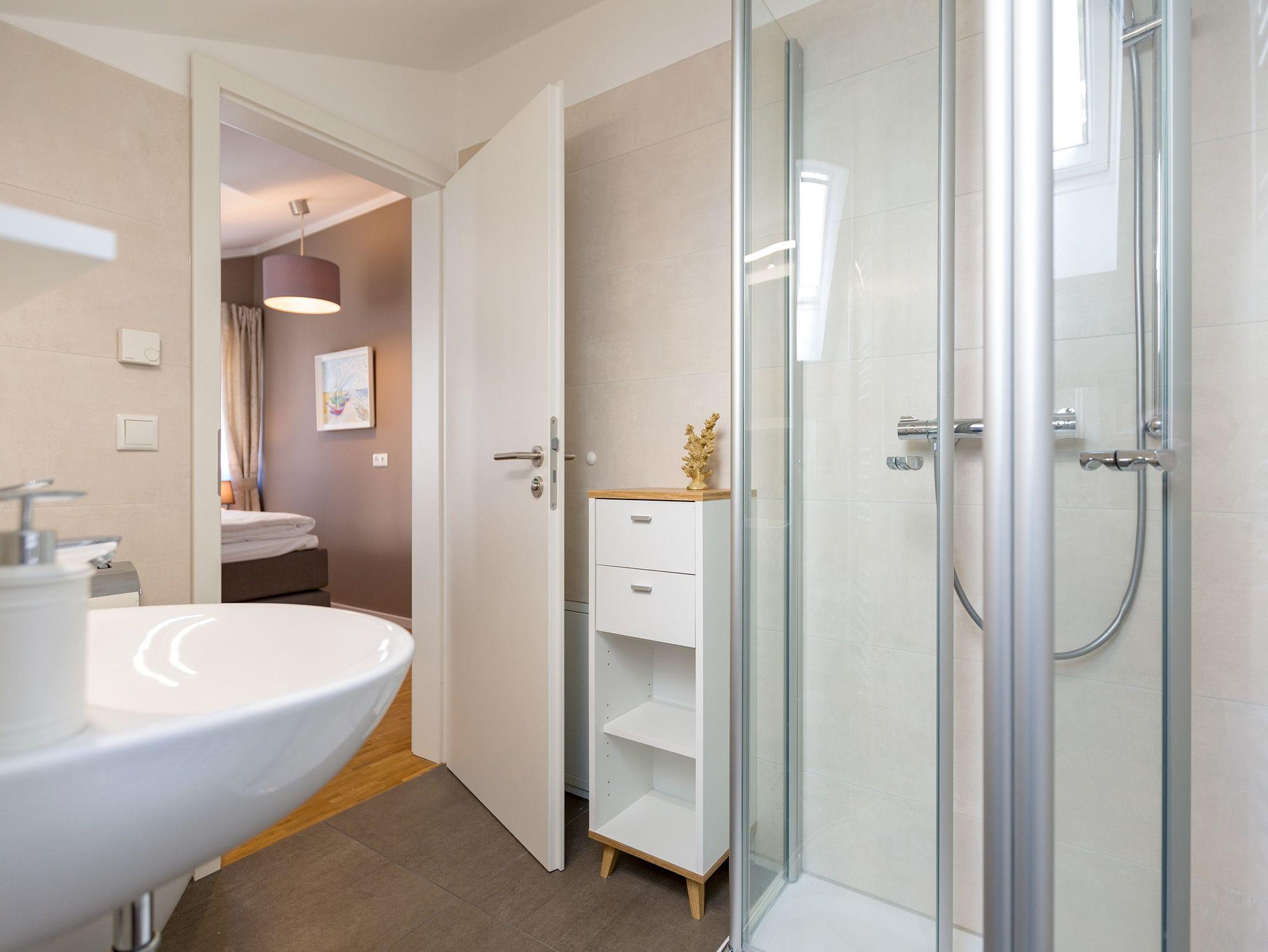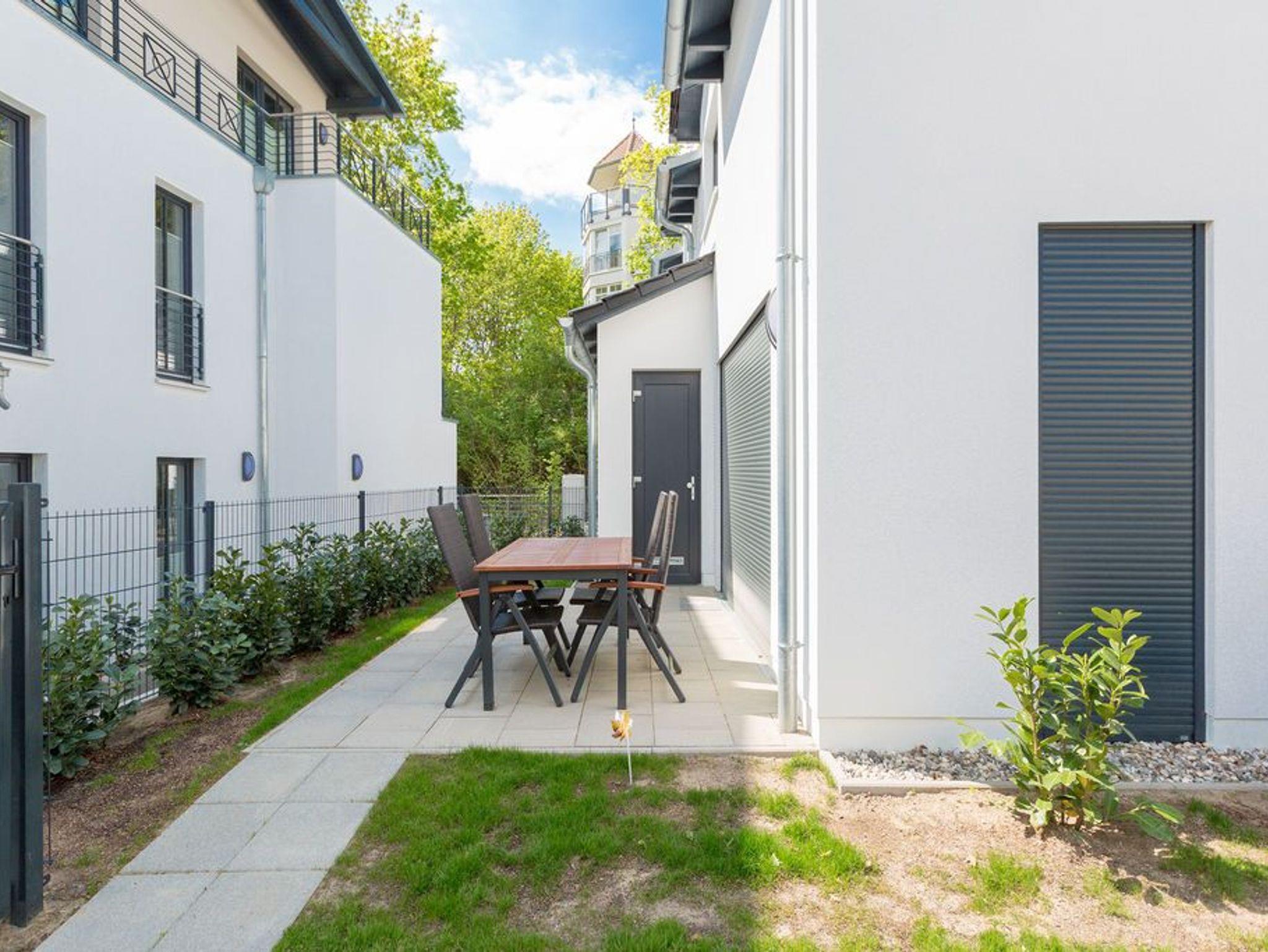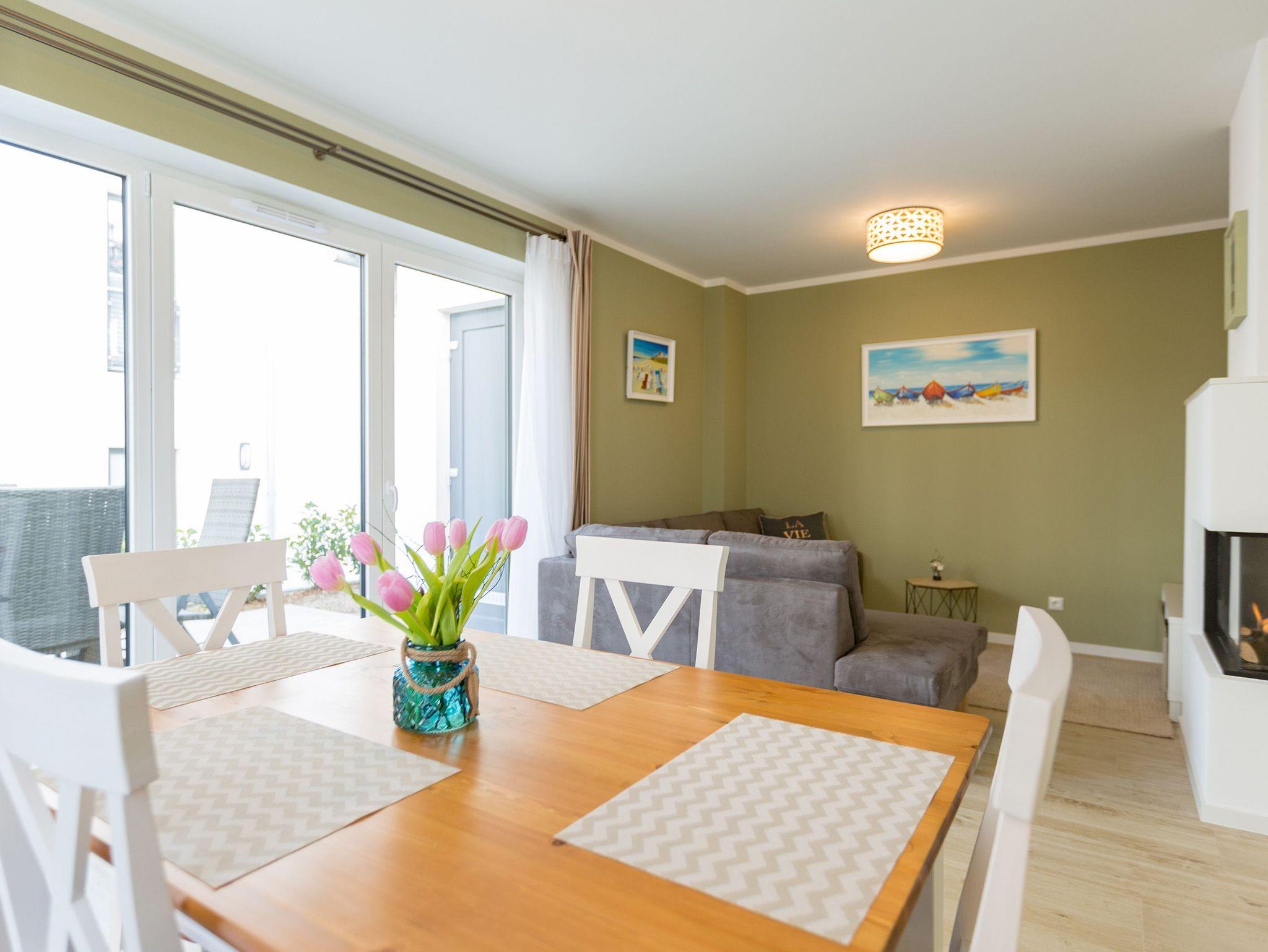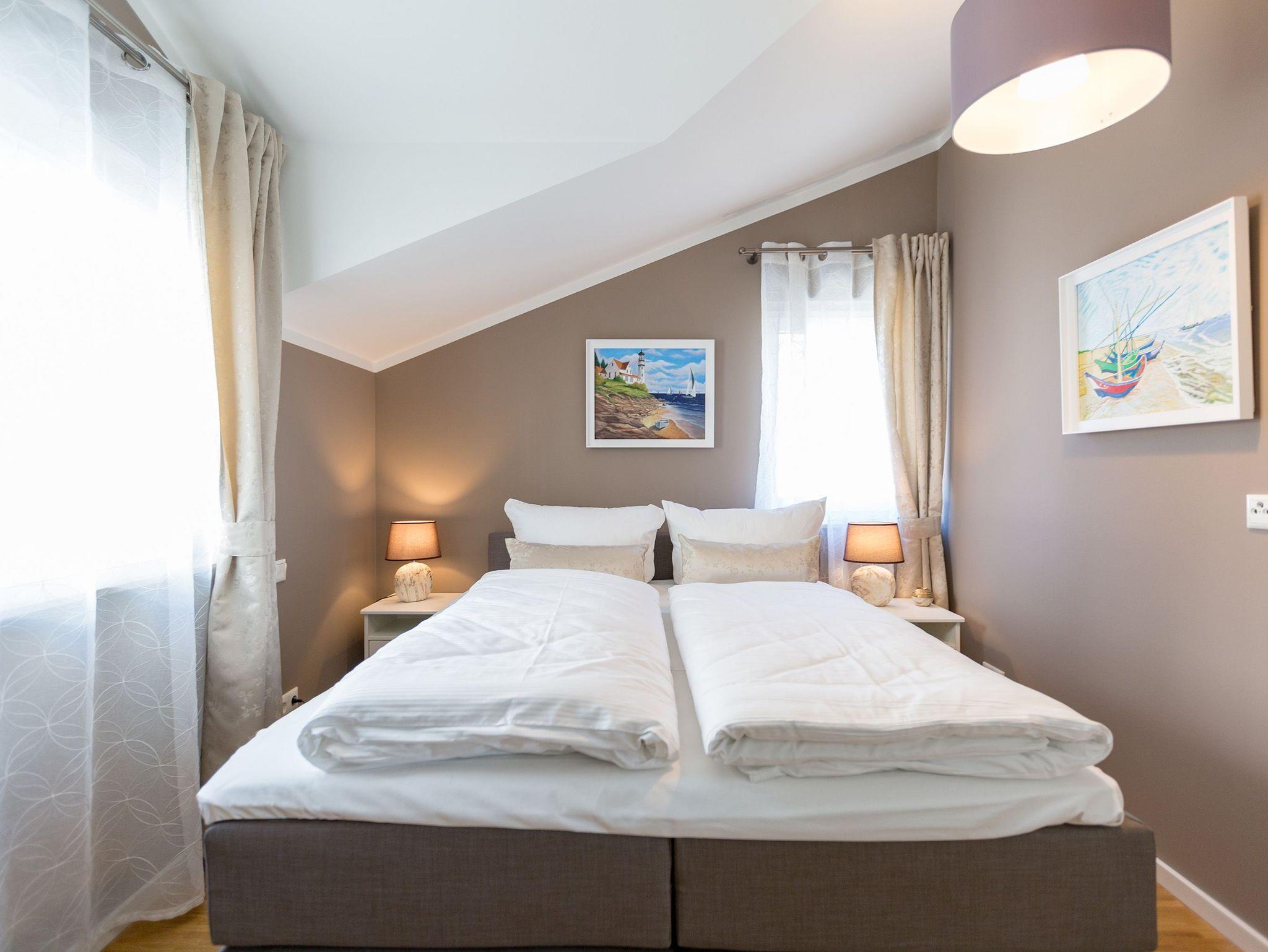 Inmitten des Urlaubstrubels der Kaiserbäder ist das komplett abgeschlossene Appartement Nummer 2 im Gartenhaus des Quartiers am Waldschloss ein exklusives Ruhereich über zwei Etagen. Auf seinen 82 Quadratmetern bietet es Platz für bis zu 5 Personen. Ein Kleinkind bis 2 Jahre kann im Kinderreisebett ebenfalls aufgebettet werden. Hier darf getrost auch der geliebte Vierbeiner mitgebracht werden, das Grundstück ist komplett eingezäunt. So wird der Urlaub an der Ostsee ein rundum gelungenes Erlebnis für Familien und Freunde. Eine wunderschöne, große Küche empfängt Sie gleich beim Eintreten. Vintage-Fliesen und viel weißes Holz im skandinavischen Landhaus-Stil geben Ihnen vom ersten Moment an das Gefühl, genau am richtigen Ort Urlaub zu machen. Hier finden Sie übrigens alle Geräte wie Herd, Spülmaschine, Gefrierschrank, die Sie für gemeinsame Mahlzeiten brauchen können. Inklusive einer urigen Theke für den kleinen Plausch zwischendurch. Von der Küche aus geht es in das helle und großzügige Wohn-Ess-Zimmer. Hier wartet eine große und komfortable Sofalandschaft nur darauf, dass Sie sich fallen lassen und ausgiebig relaxen. Dabei können Sie den Blick auf das Flammenspiel des Gas-Kamins oder aber einen spannenden Film auf dem großen Flat-TV genießen. Die Einrichtung strahlt viel Gemütlichkeit aus. An einem schönen Holztisch können Sie die Mahlzeiten gemeinsam einnehmen. Oder sie setzen sich nach draußen auf die Terrasse. Im Erdgeschoss befindet sich zudem ein separates WC mit Waschbecken, Dusche und Waschmaschine. Zum Schlafen geht?s eine Etage nach oben. Zwei Schlafzimmer mit komfortablen Boxspringdoppelbetten ( 1,60m x 2,00m), davon eines mit Flat-TV und Kleiderschrank sowie ein drittes Schlafzimmer mit einer Sofa-Sitzgruppe, die zu einer Schlafcouch ( 1,80m x 2,00m)[nbsp][nbsp]für eine 5. Person umfunktioniert werden kann sorgen für erholsames Schlafvergnügen. Ein lichtdurchflutetes Badezimmer mit Eckdusche, Waschbecken und WC ist Ihr kleiner Wellness-Bereich. Handtücher liegen für Sie bereit. Und natürlich sind die Betten bei Ankunft ebenfalls bezogen. Und für Ihr Auto gibt es einen für Sie reservierten Tiefgaragen-Stellplatz Nr. 11 a / WE 2 im Nachbarhaus (Einfahrthöhe max. 2,00 m, Stellplatzbreite max. 2,30m, eingeschränkte Wendemöglichkeit).