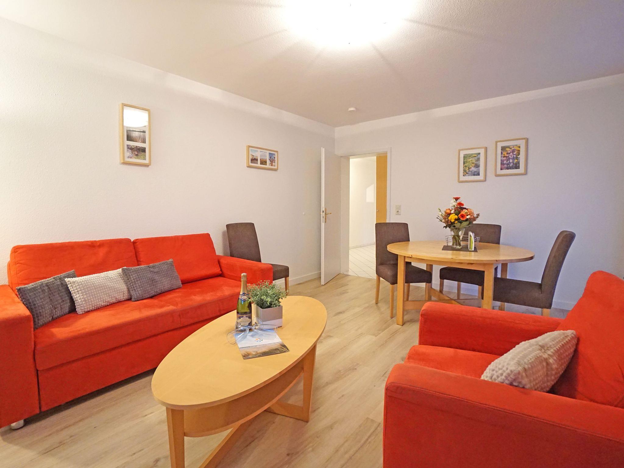 Die geräumige und geschmackvoll eingerichtete Ferienwohnung Nummer 4 in der Villa Madeleine befindet sich im Erdgeschoss mit möblierter Süd-Terrasse. Ein Schlafzimmer ist mit einem Doppelbett (180x200cm) und das zweite mit zwei Einzelbetten ausgestattet. Die separate vollausgestattete Küche lässt keine Wünsche offen. Im komfortablen Wohnzimmer befindet sich die gemütliche Couchgarnitur mit Flachbildfernseher und einem Esstisch. - Ein PKW-Stellplatz und ein Fahrradschuppen stehen auf dem Grundstück zur Verfügung.