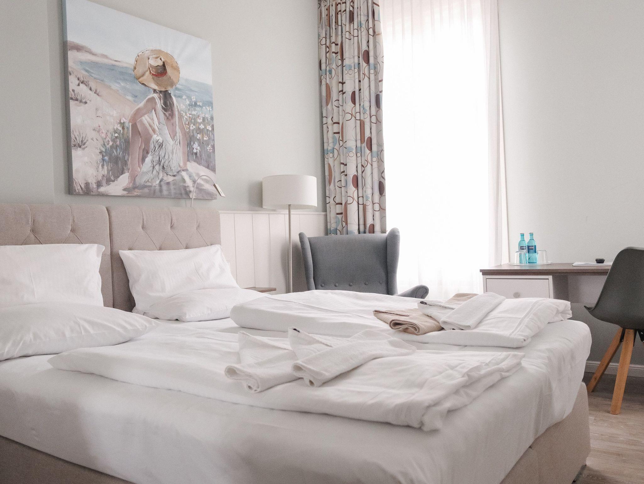 38 schöne und komfortable Doppel- und Einzelzimmer, Suiten und Juniorsuiten mit bequemen Sitzecken zum großen Teil mit herrlichem Blick auf die Ostsee, ein Restaurant mit Frühstücksterrasse in der Morgensonne direkt am Meer, einen Andachtsraum mit Blick auf die Ostsee.