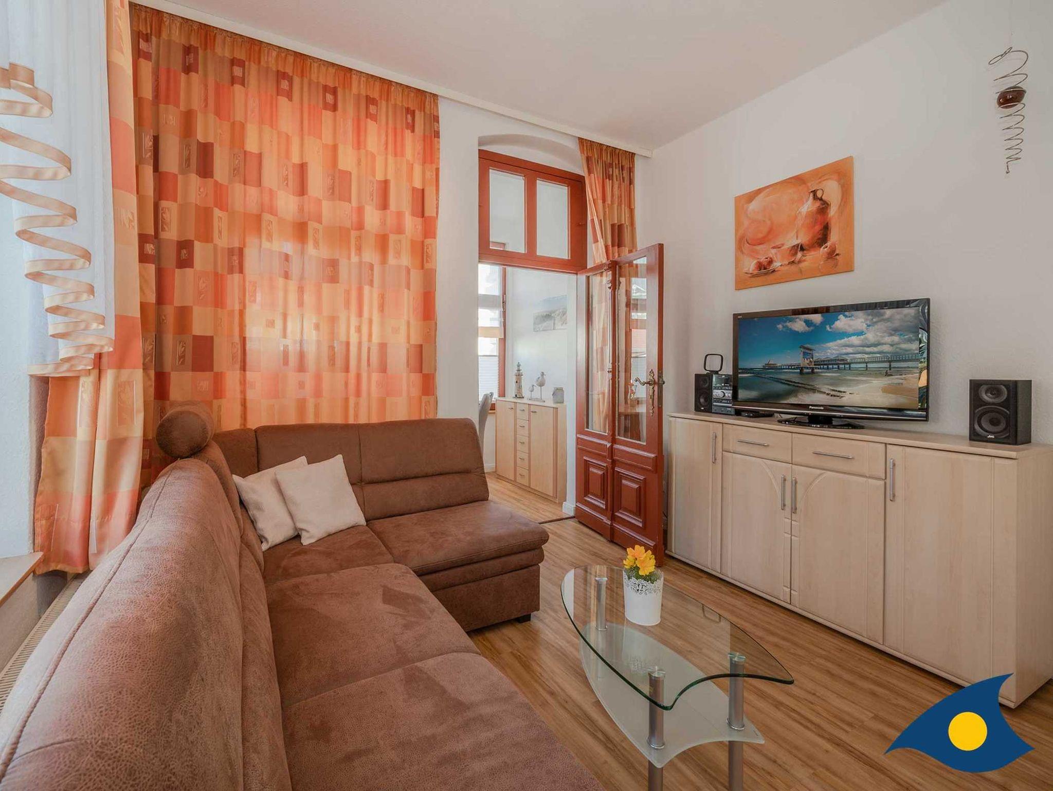Das gemütliche 3-Raum-Appartement bietet Ihnen alles, was Sie für einen erholsamen Urlaub mit bis zu 3 Personen benötigen. Das Wohnzimmer verfügt über eine großzügige Sofalandschaft und lädt zum gemeinsamen Relaxen ein. Die Küchenzeile ist im Wohnbereich integriert und stellt für Sie eine Spülmaschine, einen Backofen, eine Mikrowelle und einen Kühlschrank mit Gefrierfach bereit.