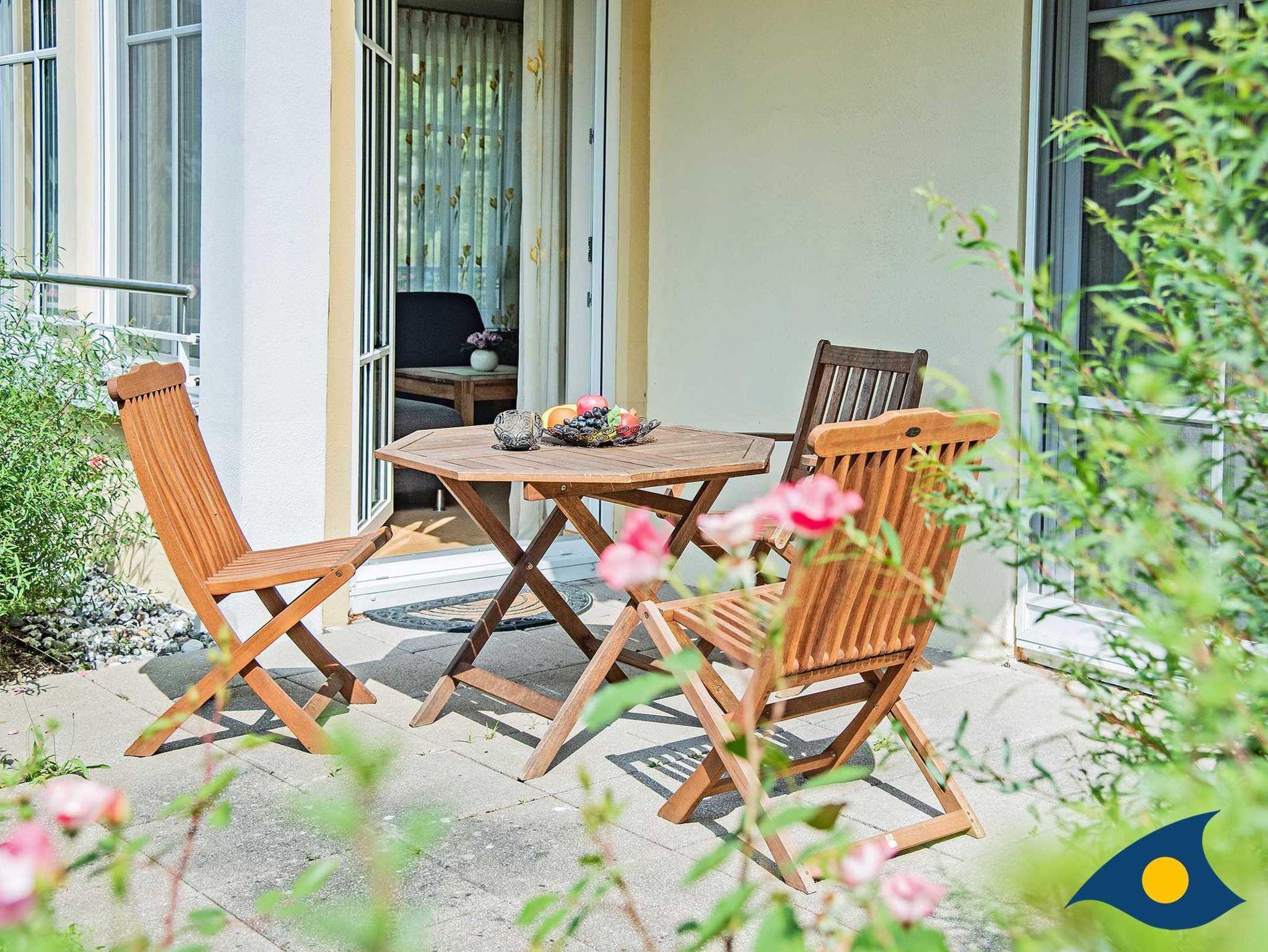 Die Süd-West-Terrasse lädt zum Verweilen ein. Auf dem abgegrenzten Grundstück befindet sich ein kleiner Kinderspielplatz mit Sandkasten und Rutsche für die kleinen Gäste.