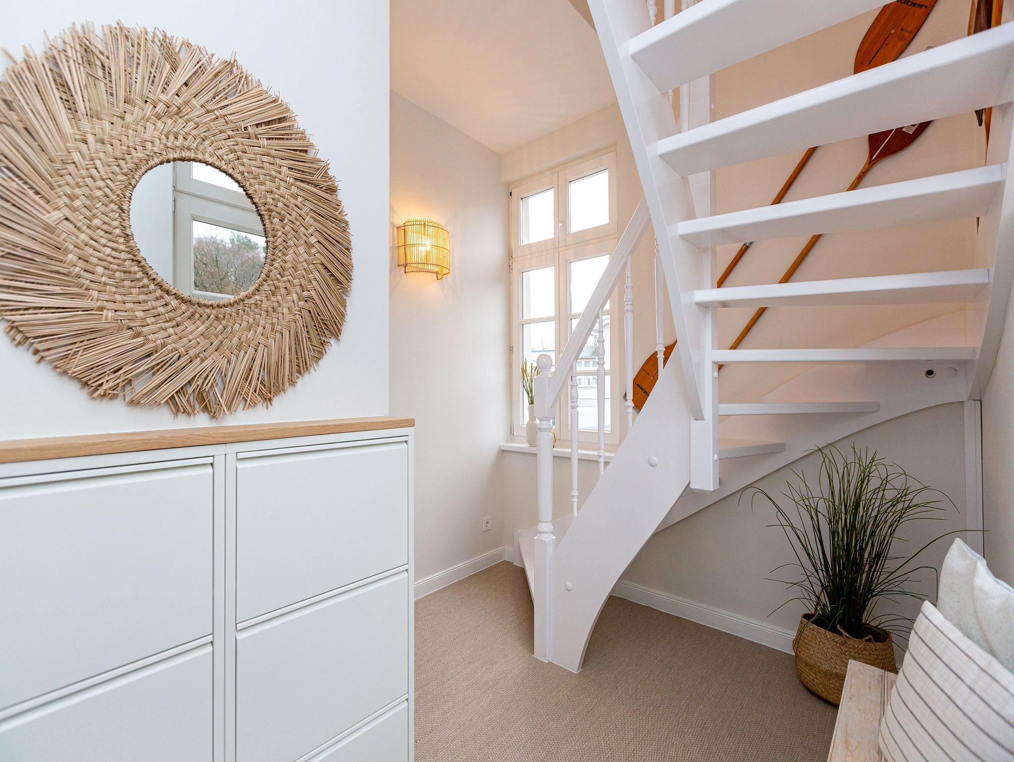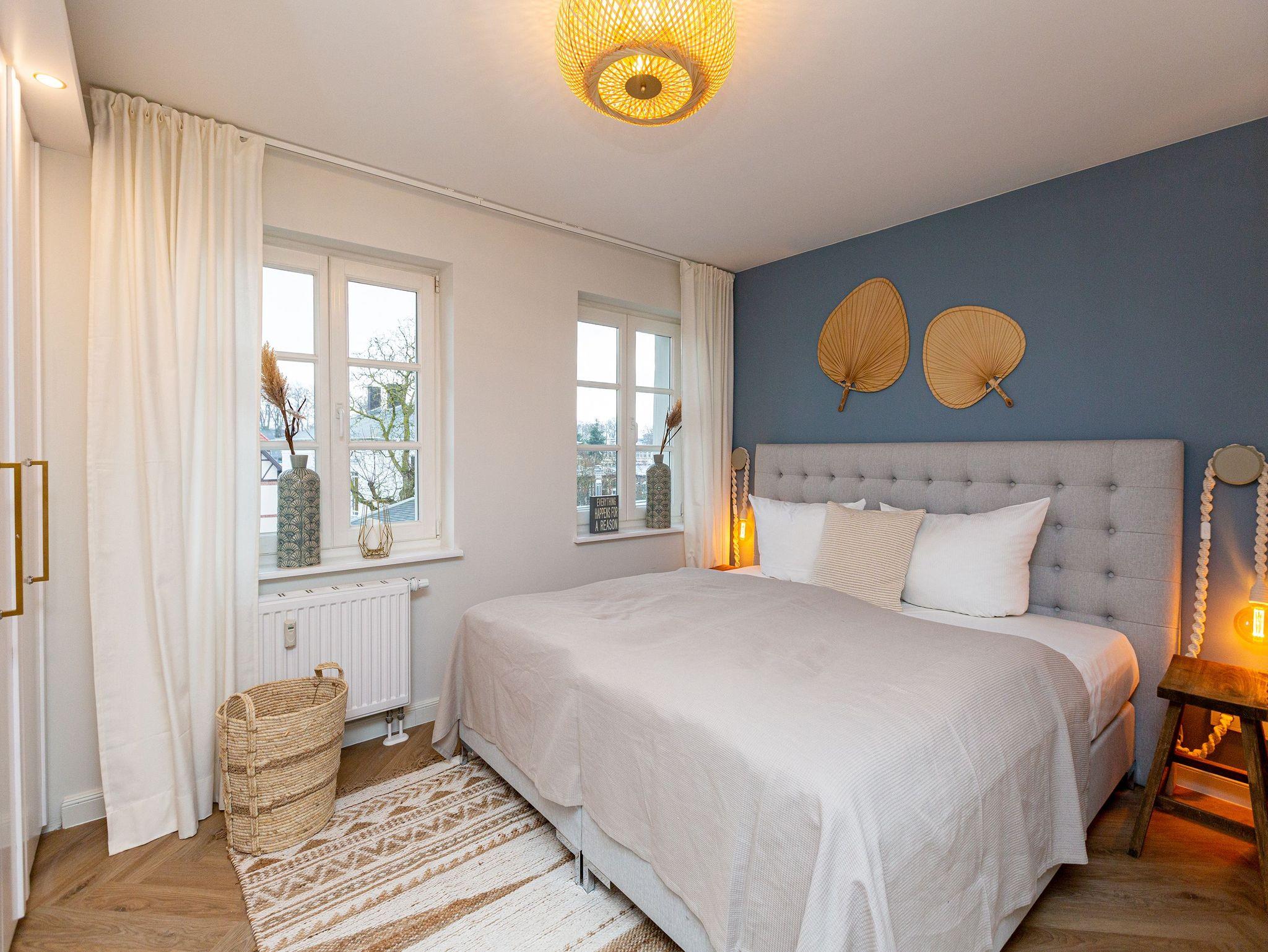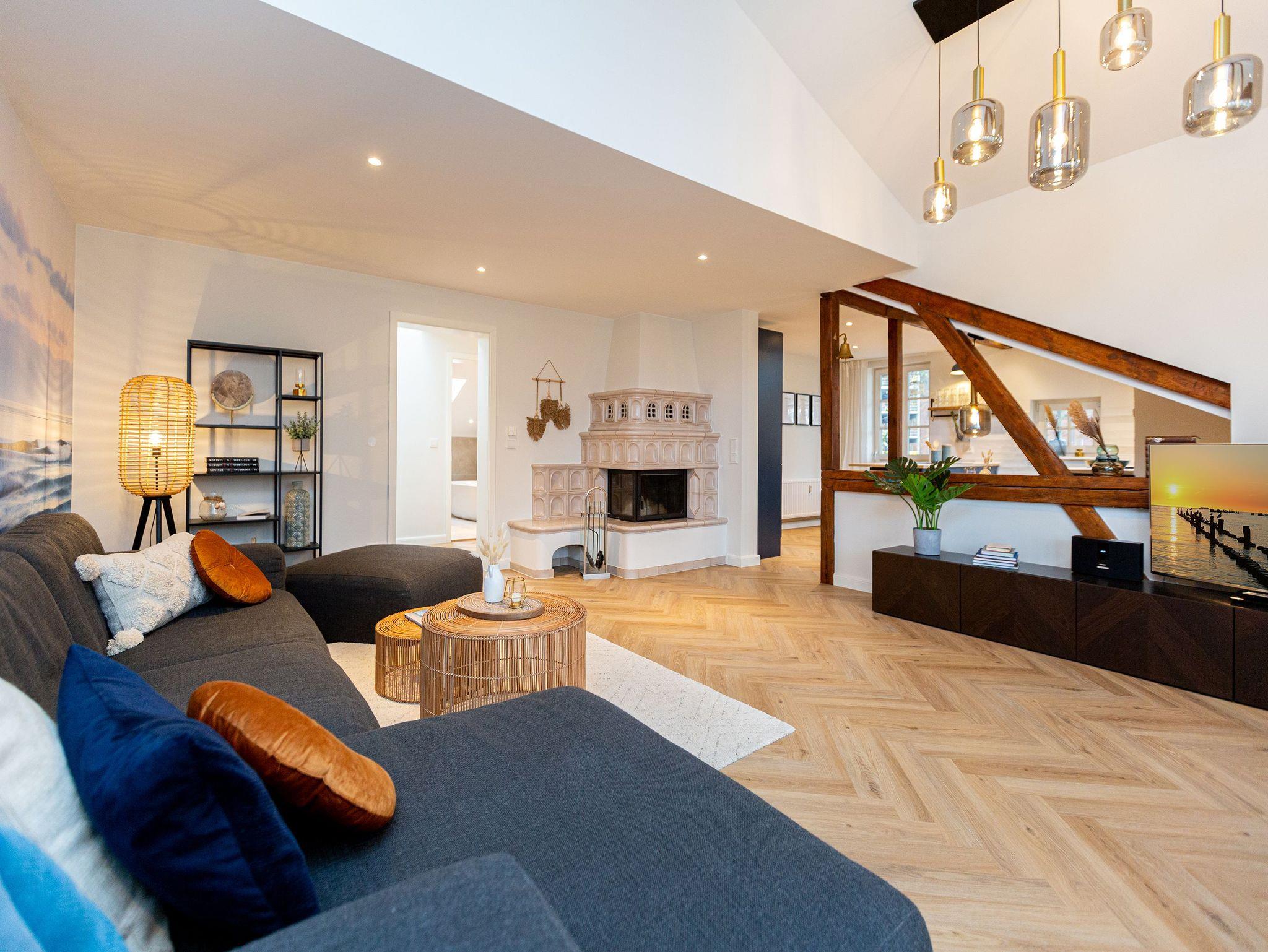 Unter dem Dach dieser wunderschönen Bädervilla mitten im Herzen von Heringsdorf wird Urlaub zu einem unvergesslich schönen und exklusiven Erlebnis. Viel Platz und Wohnkomfort der Extra-Klasse erwartet Sie auf den 110 Quadratmetern luftig leichter Urlaubsfreiheit. Alte Balken, ein Kamin, der wie ein Kachelofen eine kuschelige Atmosphäre zaubert, stylische Möbel, ein harmonisches Lichtkonzept ? all das sorgt für bis zu fünf Personen und ein Kleinkind (im Kinderreisebett) für eine entspannte Auszeit am Meer. Eine urig bequeme Sofa-Sitzgruppe lädt zum Relaxen und Faulenzen ein. Der große Flat-TV fungiert als Highend-Entertainer mit echtem Kino-Sound. Eine schöner, großzügiger Essplatz in einem Erker ist für lange Plauderabende oder ausgiebige Frühstücke, Brunches oder Abendessen ideal geeignet. Der Ausblick vom sonnenüberfluteten Südwest-Balkon auf die mondänen Villen der Umgebung versetzt in eine glanzvolle Zeit, in der die Berliner High Society in diesen Häusern gastierend die Sommerfrische an der Ostsee genoss. So wie Sie es heute tun. Die Küche ist zum Wohn-Esszimmer hin offen und mit allen nötigen Geräten ausgestattet. Hochwertig und edel ist auch das Geschirr in den Schränken. Für viel Vergnügen und erholsame Träume sorgen gleich drei Schlafzimmer. Machen Sie es sich in einem der drei Doppelbetten (1,80 m x 2,00 m; 1,60 m x 2,00 m sowie 1,40 m x 2,00 m) bequem. Die Erholung kommt dann von ganz allein. Denn schlafen werden Sie hier wie im Paradies. Jedes Schlafzimmer ist mit Schrank oder Kommode zur Ablage der Urlaubsgarderobe ausgestattet.[nbsp] Es stehen 2 Badezimmer zur Verfügung. Eines ist mit einer freistehenden Badewanne, Waschtisch und WC ausgestattet und bietet allen Komfort zum ausgiebigen Frischmachen und Ausspannen. Das zweite verfügt über eine Dusche, Waschtisch [&] WC.[nbsp] Damit Sie jede Sekunde in diesem wunderschönen Domizil genießen können, sind die Betten bei der Anreise bereits bezogen und Handtücher liegen bereit. Das WLAN ist kostenfrei und am Haus befindet sich ein Stellplatz.