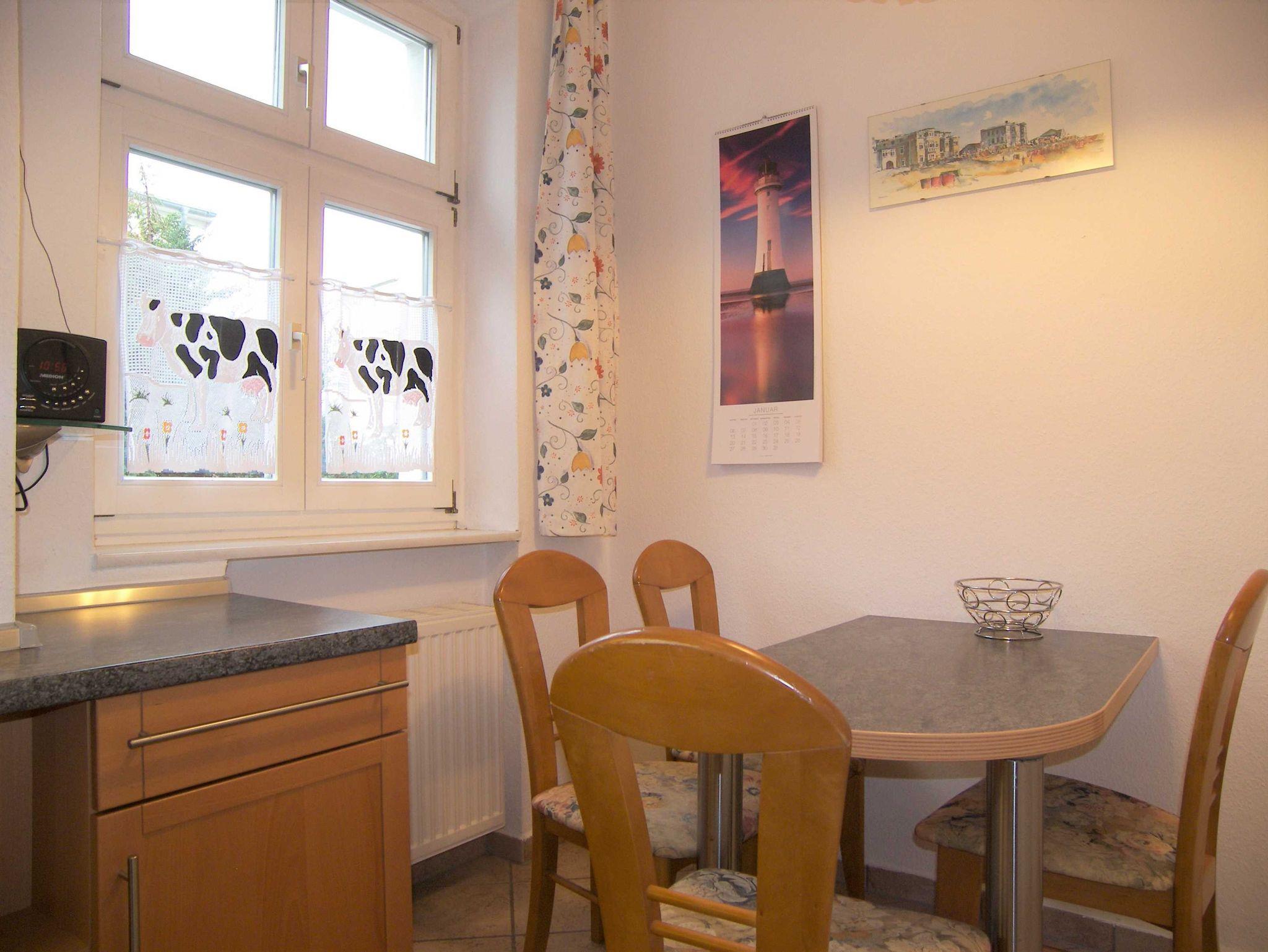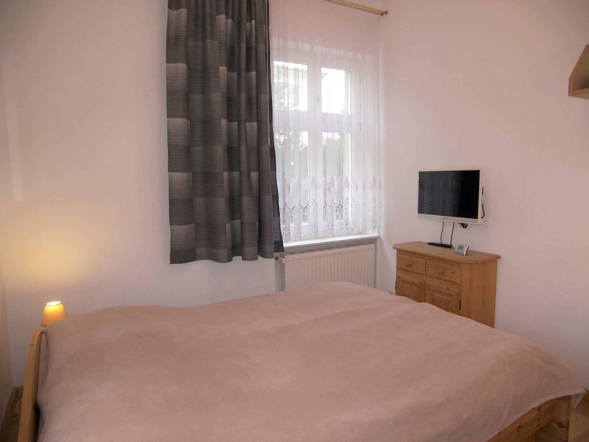 Die geräumige Ferienwohnung ?Coralle? hat 3 Zimmer und befindet sich im Erdgeschoß des Gartenhauses. Sie ist für max. 4 Feriengäste geeignet. Das Wohnzimmer verfügt über 2 Schlafsofas (Querschläfer) und einen großzügigen Essplatz mit 6 Stühlen im Erker. Das Schlafzimmer ist mit einem Doppelbett (160 x 200 cm) ausgestattet. Das dritte Zimmer ist als Wohn- / Schlafzimmer nutzbar und besitzt zwei Schlafsofas (je 90 x 200 cm). Im Wohnzimmer befindet sich Teppichboden. In den beiden anderen Zimmern ist ein Laminatboden verlegt. Die Wohnung ist ausgestattet mit Kabel ? TV in drei Zimmern und je einer Musikanlage in zwei Zimmern. In der Küche befindet sich eine hochwertige Einbauküche mit Elektroherd, Kühl- / Gefrierkombination, Mikrowelle, Kaffeemaschine, Toaster, CD ? Radio und Spülmaschine. Im Vorderhaus besteht die Möglichkeit der Nutzung eines Münztrockners. Weiterhin gehören zur Wohnungsausstattung ein Bügeleisen und ?brett sowie ein Fön. Ein Kinderbett und ein Hochstuhl sind auf Anfrage beim Verwalter kostenlos erhältlich.