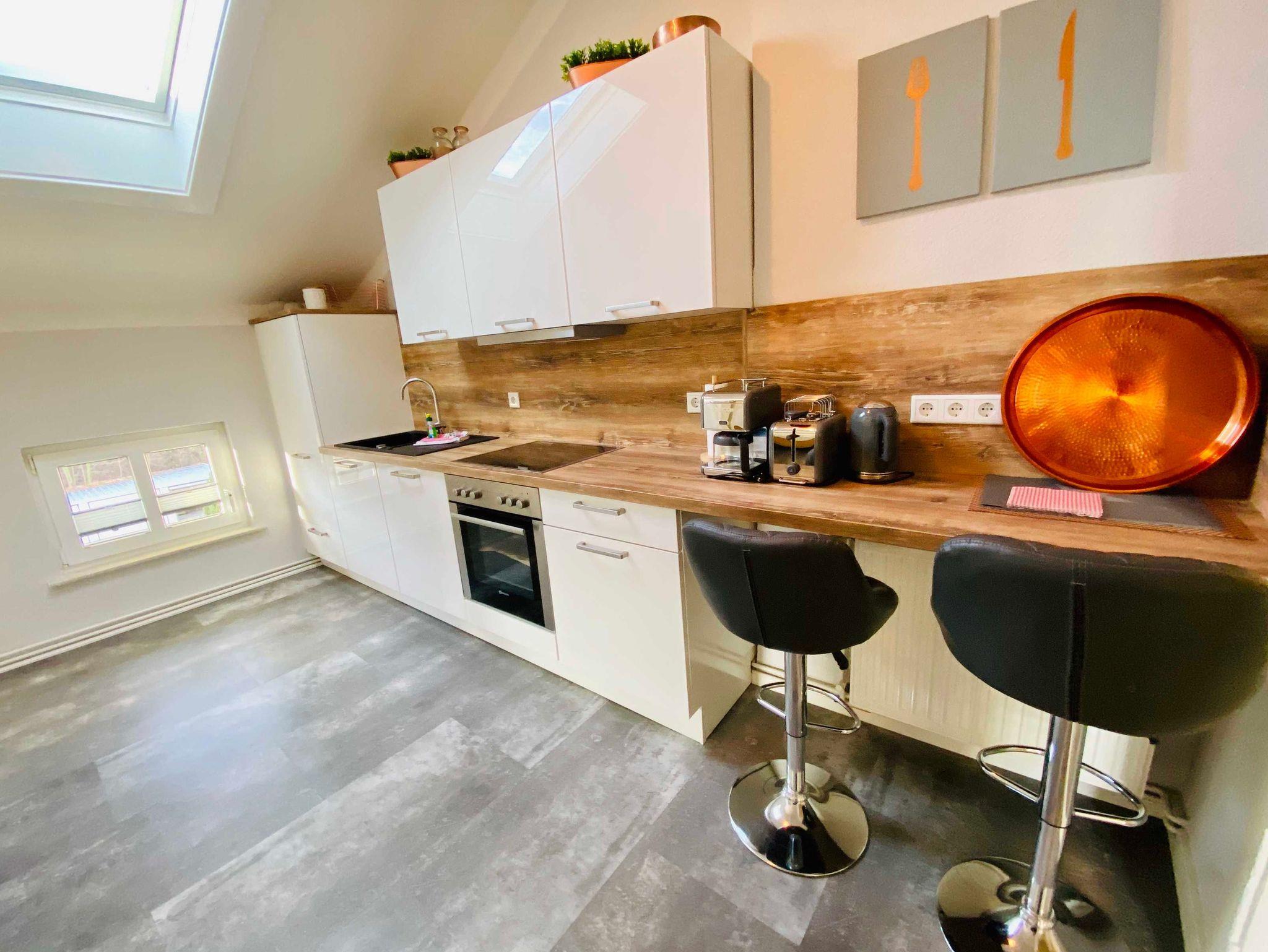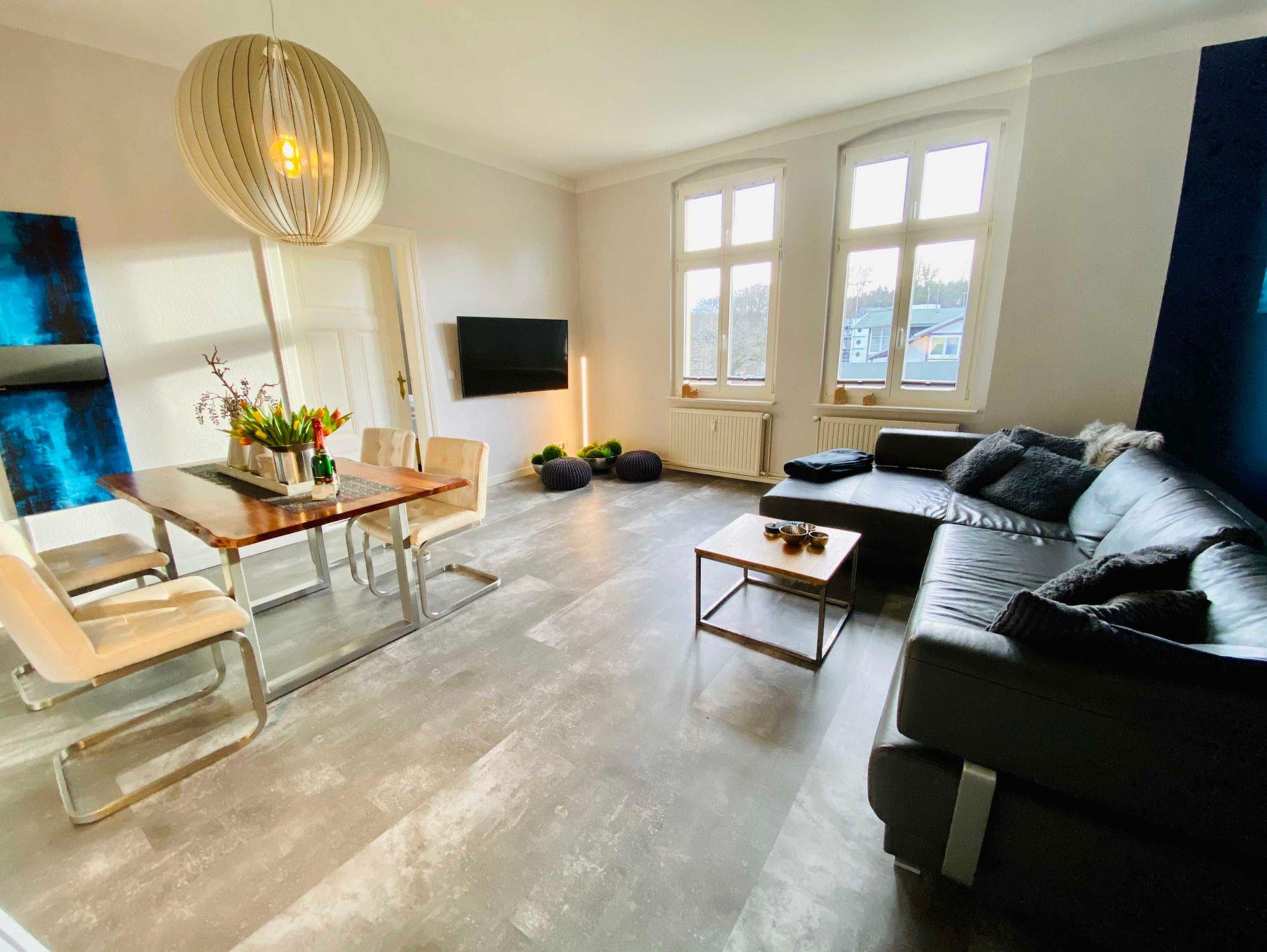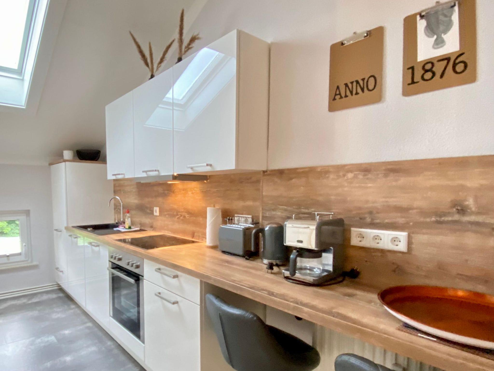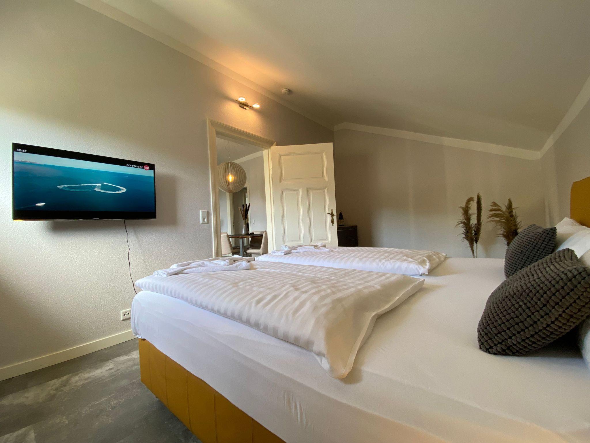 Die Ferienwohnung Anno 1876 befindet sich im 2. Obergeschoss der Villa und ist über das historische Treppenhaus zu erreichen. Sie besteht aus einem großen Wohnzimmer, das durch seine mutige Farbgestaltung und ausgesuchte Möblierung begeistert. Die zwei gleichwertigen Schlafzimmer sind jeweils mit großen Boxspringbetten in Komforthöhe und TV ausgestattet. Platz für die Kleidung finden die Gäste in einem extra Schrankzimmer. Die separate Küche bietet Gelegenheit, seine Mahlzeiten selbst zuzubereiten und lässt keine Wünsche offen. Zur Ferienwohnung gehört ein Bad ebenfalls im modernen Design mit Regendusche. Genießen Sie die schönste Zeit des Jahres in dieser extravaganten Ferienwohnung Anno 1876- Sie werden es lieben.