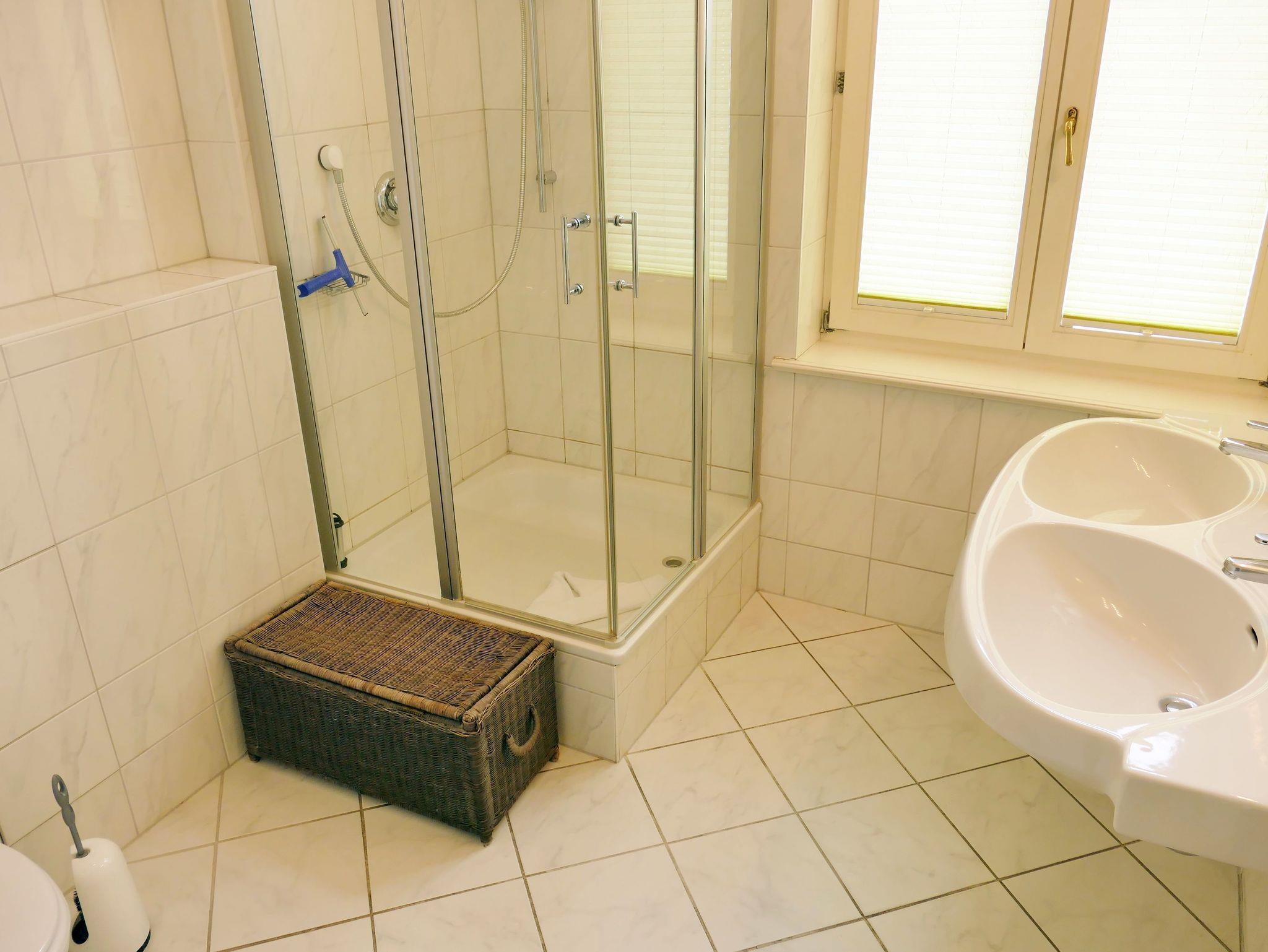 Im Badezimmer befinden sich neben der Toilette eine Dusche sowie ein Doppelwaschtisch mit Spiegel. Ein Gäste-WC ergänzt die sanitäre Ausstattung.