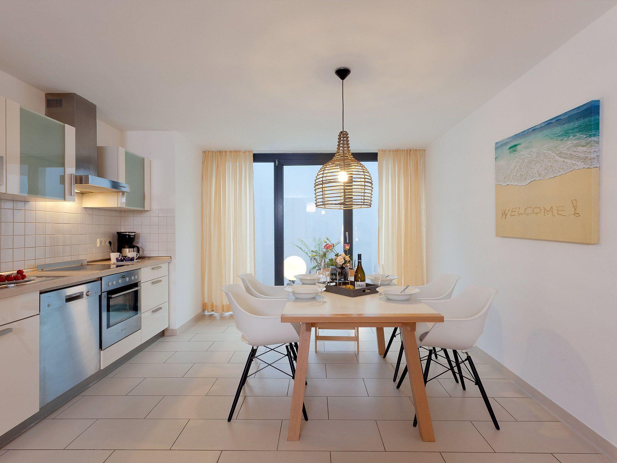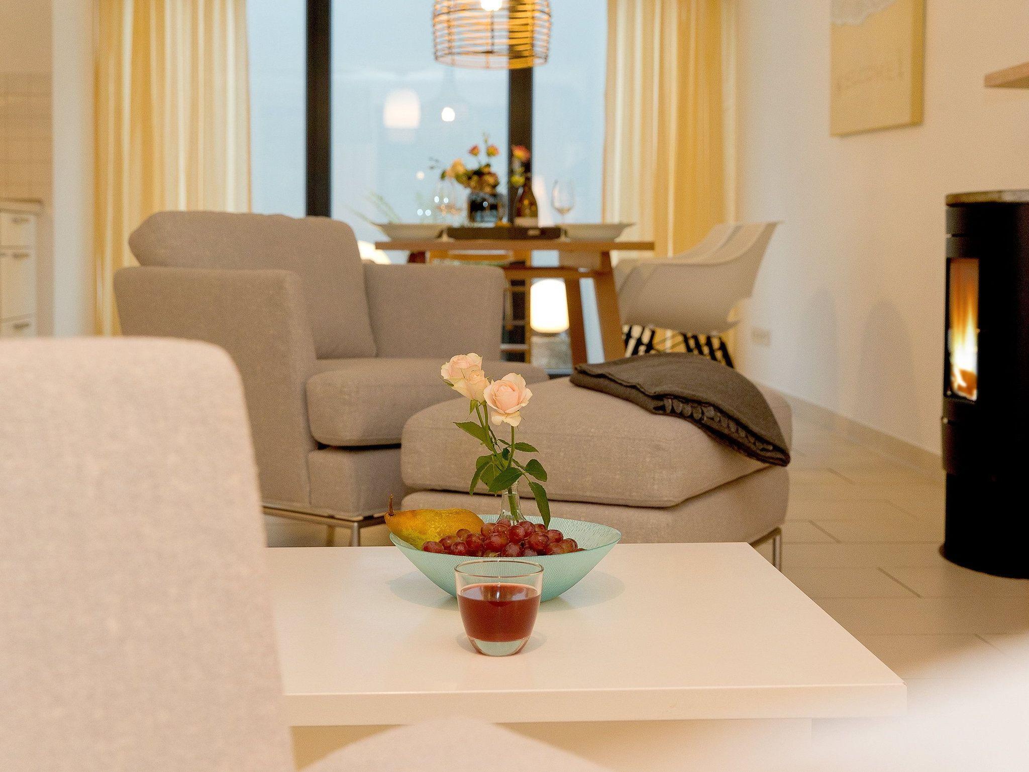 Der stilvolle Wohnbereich verfügt über ein komfortables Ecksofa und einen Sessel. Die hochwertige Ausstattung mit Bio-Ethanol-Kamin und Flat-TV sorgt nicht nur in der ungemütlichen Jahreszeit für behagliche Stunden nach einem erholsamen Strandspaziergang. Im Erdgeschoss befindet sich zudem die moderne Einbauküche, die für die Zubereitung Ihrer Lieblingsspeisen rundum ausgestattet ist (inkl. Ceranfeld, Backofen, Kühlschrank mit Gefrierfach, Geschirrspüler, Wasserkocher, Toaster und Kaffeemaschine). An dem großzügigem Essplatz kann die ganze Familie in geselliger Runde die zubereiteten Speisen genießen. Vom Wohnzimmer erreichen Sie Ihre private Südterrasse, die zum Sonnenbaden oder zur abendlichen Spielrunde mit Blick ins Grüne einlädt. Das Gäste-WC ist mit einer Waschmaschine ausgestattet und rundet den Komofort dieser Etage ideal ab.