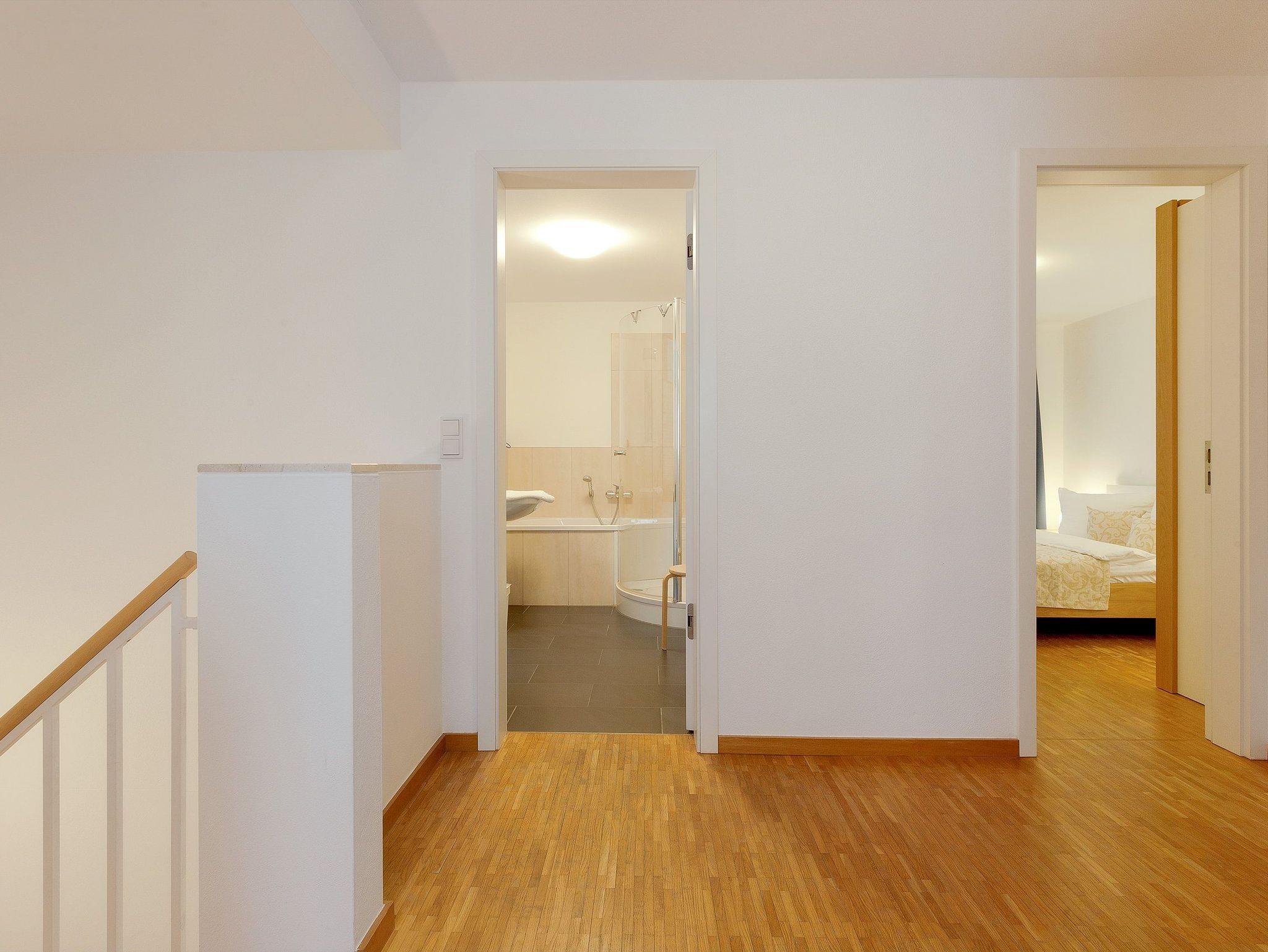 Über eine Treppe gelangen Sie in die obere Etage der Wohnung. Von der Galerie haben Sie Zugang zu den beiden Schlafzimmern, dem Badezimmer und dem Highlight dieser Etage - Ihrer persönlichen Sauna. Das erste Schlafzimmer ist freundlich eingerichetet und mit einem bequemen Doppelbett (180 x 200cm / zwei getrennte Matratzen) und verdunkelnden Gardinen ausgestattet. Für zwei weitere Urlaubsgäste stehen im zweiten Schlafzimmer zwei Einzelbetten (je 90x200cm) für eine erholsame Nachtruhe und einen guten Start in den neuen Urlaubstag bereit. Ein kleiner Balkon schließt sich diesem Zimmer an.
