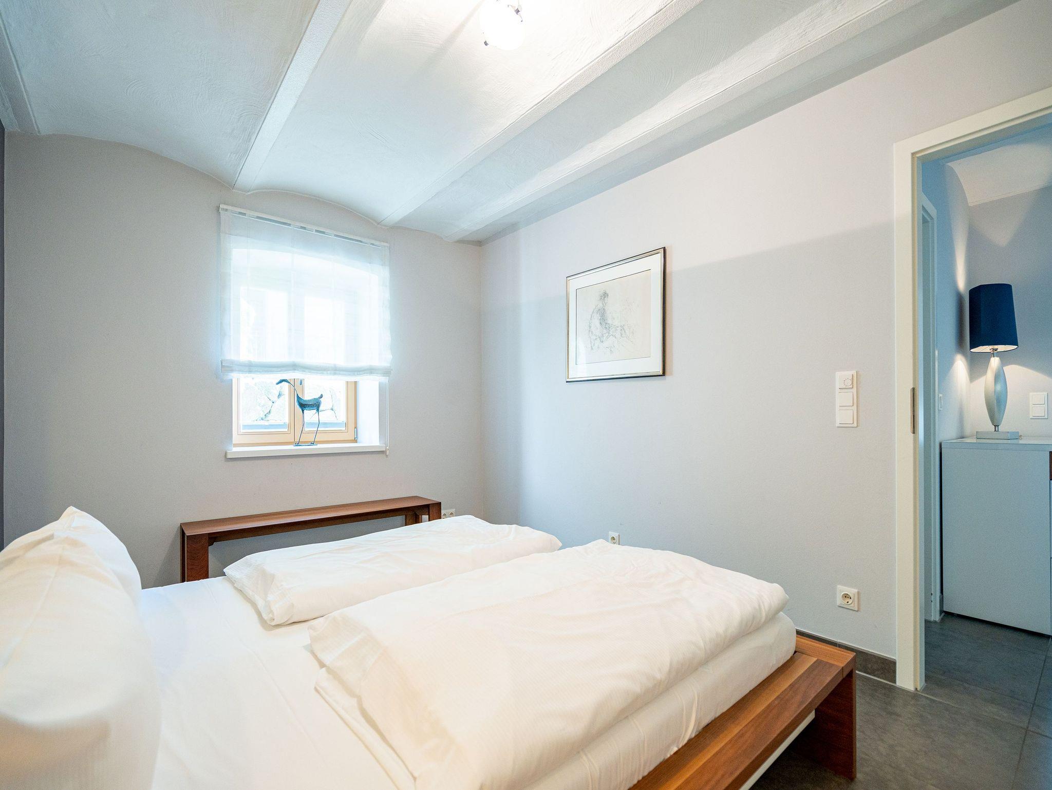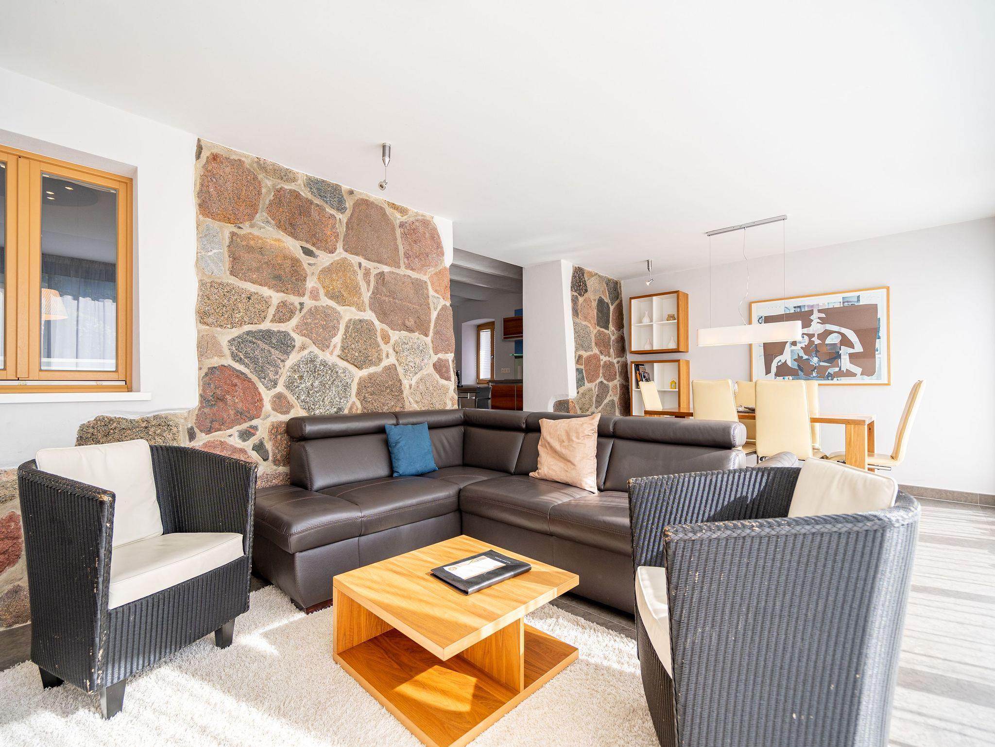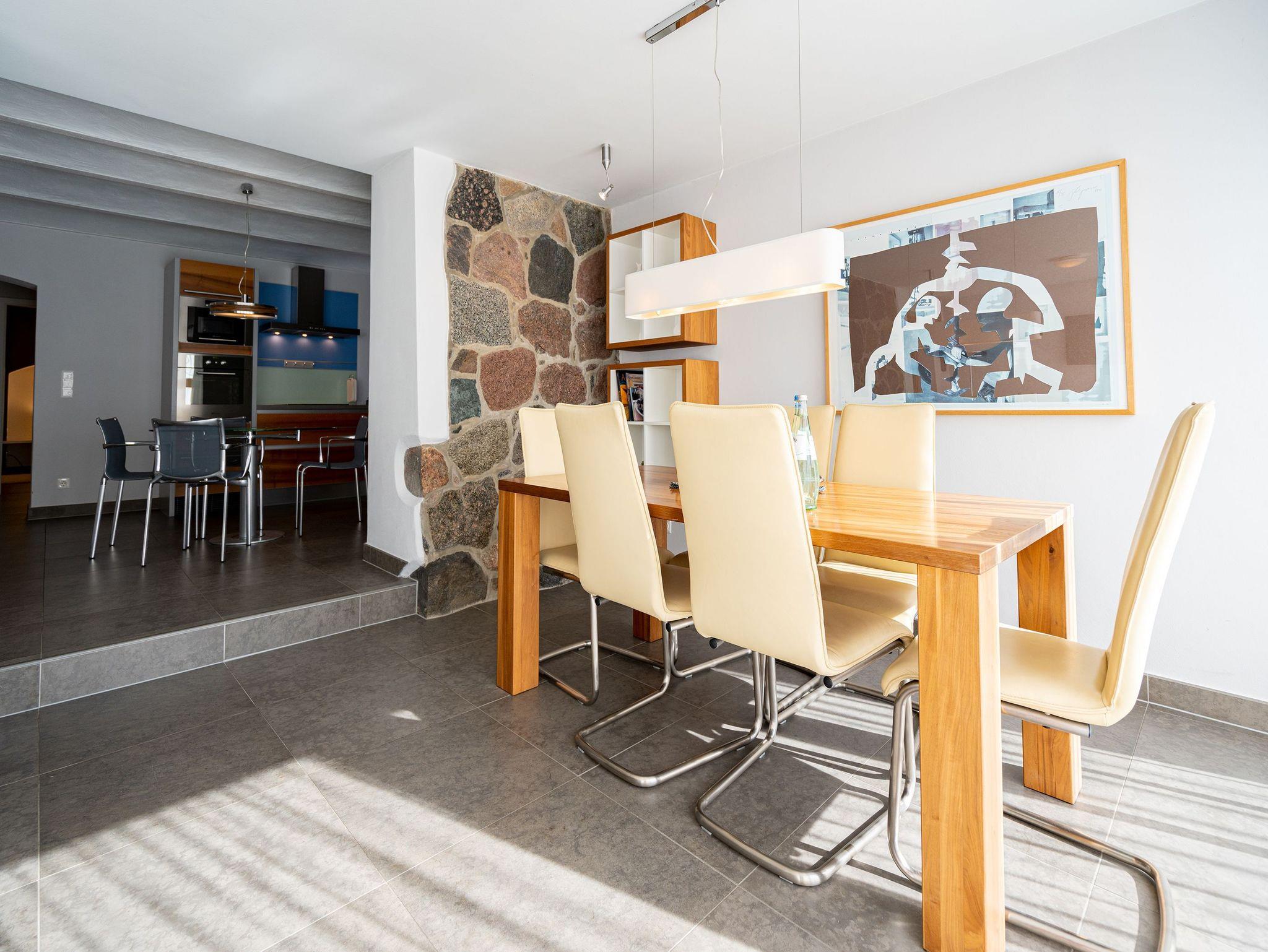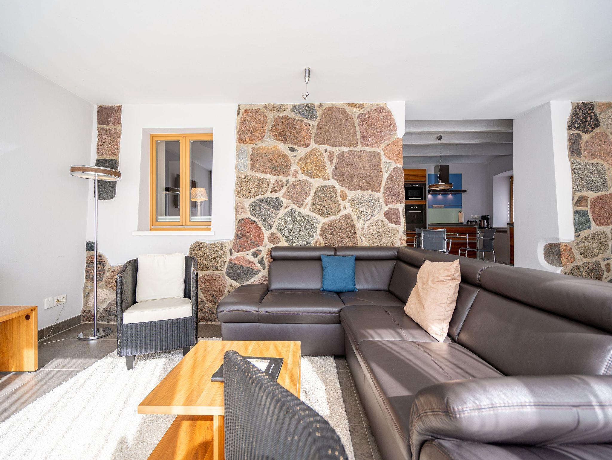 Stylisch durch und durch! DIE STYLISCHE: Graue Feinsteinböden, stilvolle Feldsteinmauer und dazu moderne Möbel, die den Räumen Finesse und Leichtigkeit verleihen. Eine moderne 3-Raum-Ferienwohnung (86 qm) mit zwei Schlafzimmern im Souterrain, perfekt für den Urlaub für 4 Personen und ein Kleinkind (Babyreisebett und Hochstuhl zu buchbar). Der großzügige Wohnbereich mit bequemer Sitzgruppe lädt zum Relaxen ein und die große Ostterrasse ist eine perfekte Verlängerung des Wohnraums. Sicher Ihr Lieblingsplatz im Sommer. Eine moderne, offene Küche lässt keine Wünsche offen. Daneben bietet die Wohnung ein Bad mit Dusche, hier duscht man mit echten Swarovskisteinen. Für Ihren Komfort ist das Appartement mit dem 1. Satz Handtücher ausgestattet und liebevoll bezogen.