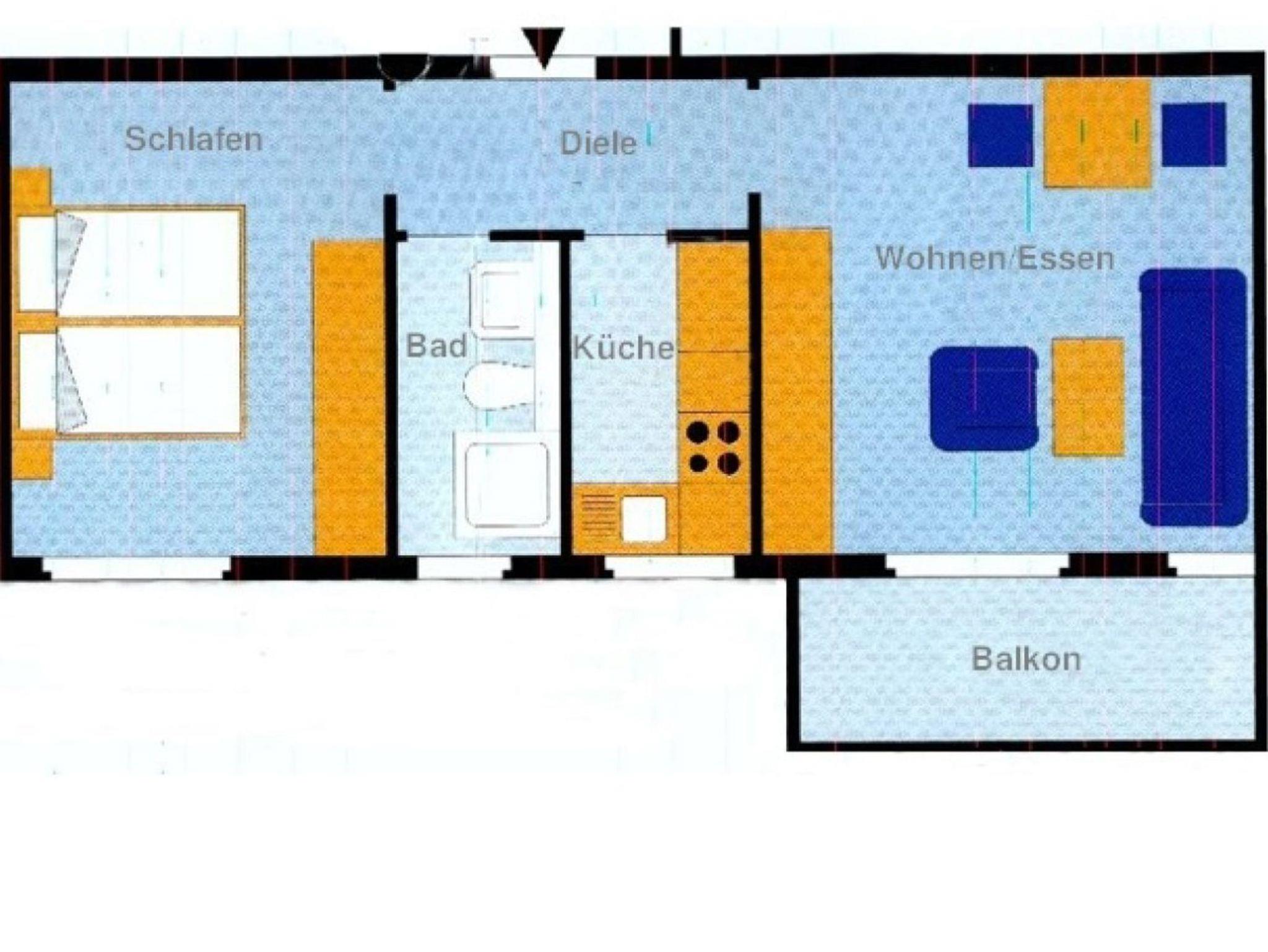 Die für 2 Personen eingerichtete Ferienwohnung liegt im zweiten Stock eines größeren Wohnobjektes. Sie besteht aus einem Wohnzimmer mit Balkon in südwestlicher Ausrichtung, einem Schlafzimmer, einer separaten Küche und einem Bad. Ein Aufzug ist vorhanden, ebenso ein Parkplatz unmittelbar am Eingangsbereich.