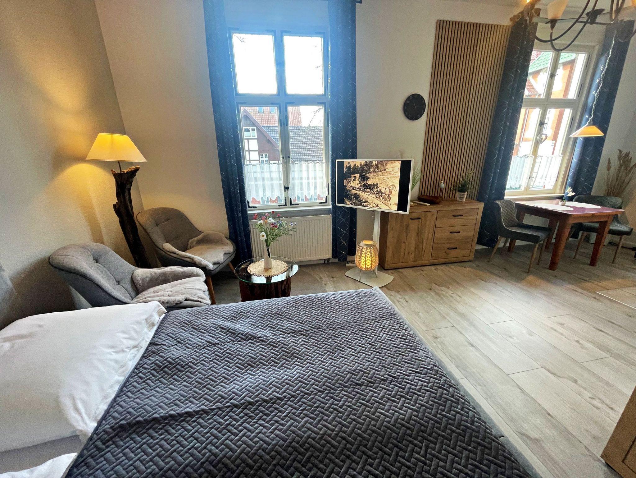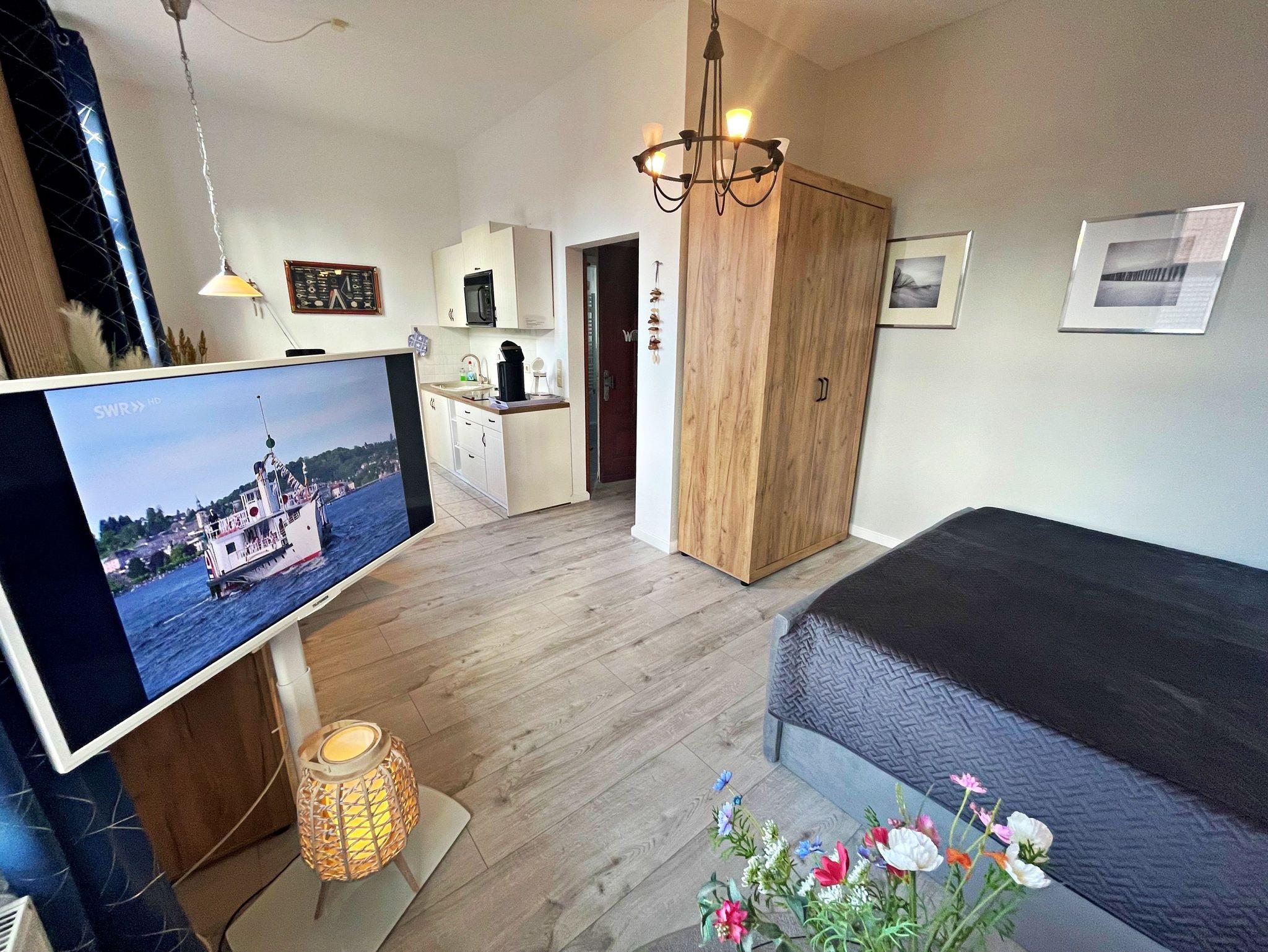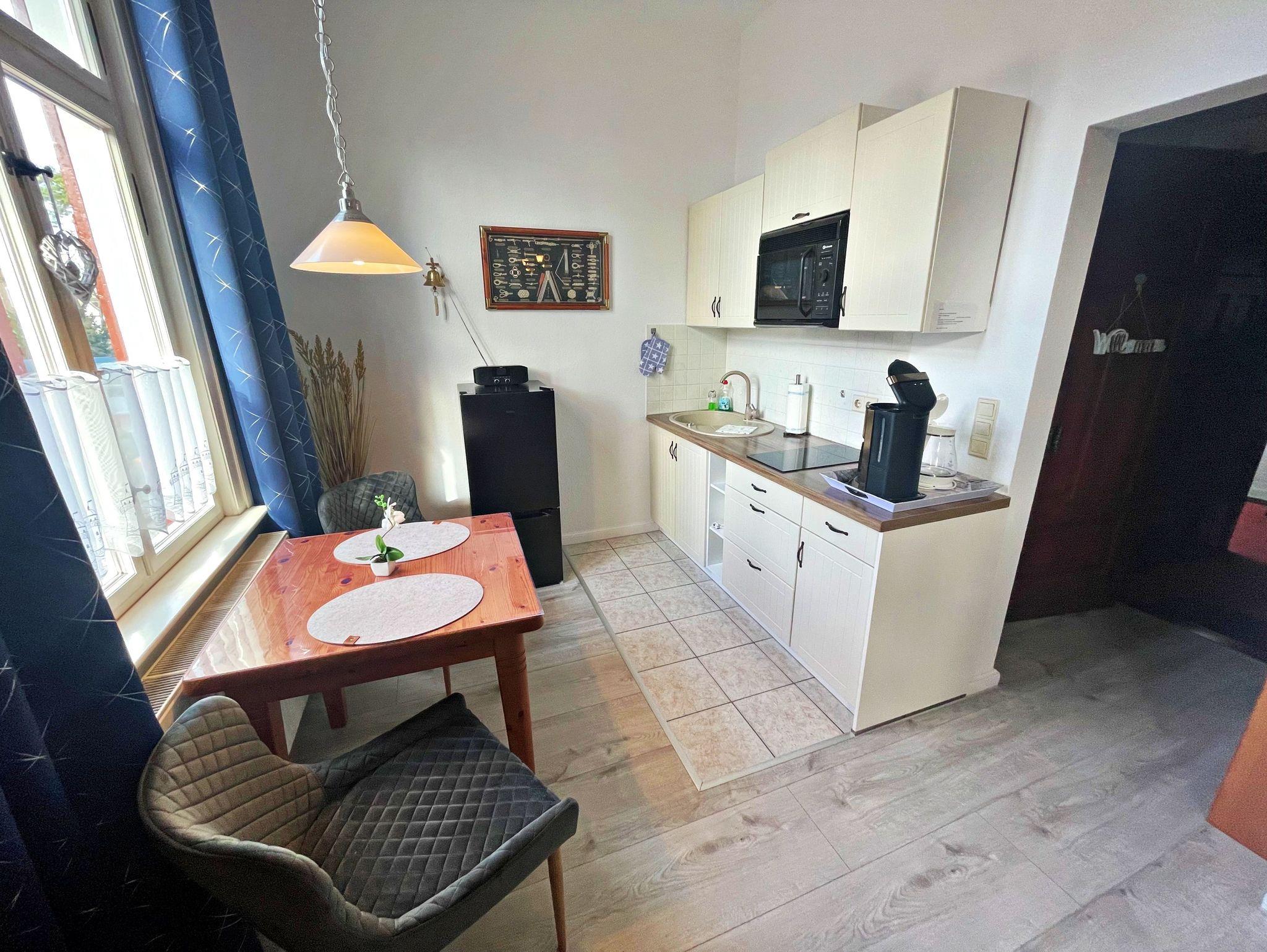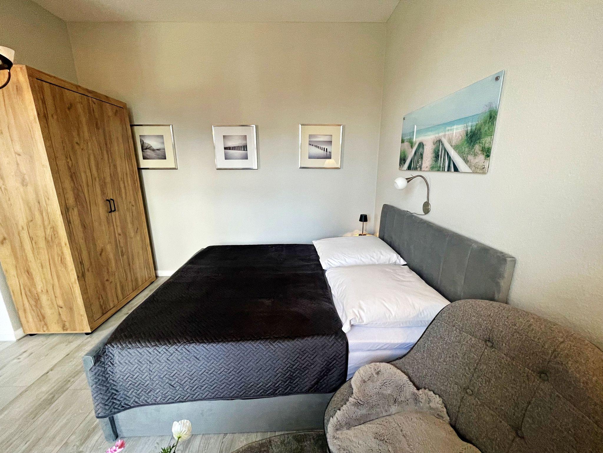 Diese charmante Unterkunft im Obergeschoss auf der rechten Seite bietet auf 34 m² ausreichend Platz für bis zu 2 Personen, um einen entspannten und erholsamen Urlaub zu genießen. Der kombinierte Wohn- und Schlafbereich ist gemütlich eingerichtet und verfügt über ein komfortables Doppelbett (1,60 x 2,00 m), Flachbild-TV sowie einen einladenden Essbereich mit 2 Stühlen. Die praktische Küchenzeile ist mit einem 2-Platten-Herd, Kühlschrank, Mikrowelle, Wasserkocher, Toaster und Kaffeemaschine ausgestattet, sodass Sie sich ganz wie zu Hause fühlen können. Das Badezimmer ist mit einer Dusche und WC ausgestattet und bietet Ihnen alles, was Sie für Ihren Aufenthalt benötigen. Genießen Sie den kleinen Balkon mit Meerblick, der über den Hausflur erreichbar ist - der perfekte Ort, um den Tag ausklingen zu lassen. Für Ihr Fahrzeug steht ein Pkw-Stellplatz auf dem umzäunten Grundstück zur Verfügung. Zudem können Sie gegen Entgelt eine Waschmaschine sowie einen Wäschetrockner im Objekt nutzen. WLAN-Zugang ist für ein Gerät kostenfrei, für jedes weitere Gerät werden 10 € pro Woche berechnet.