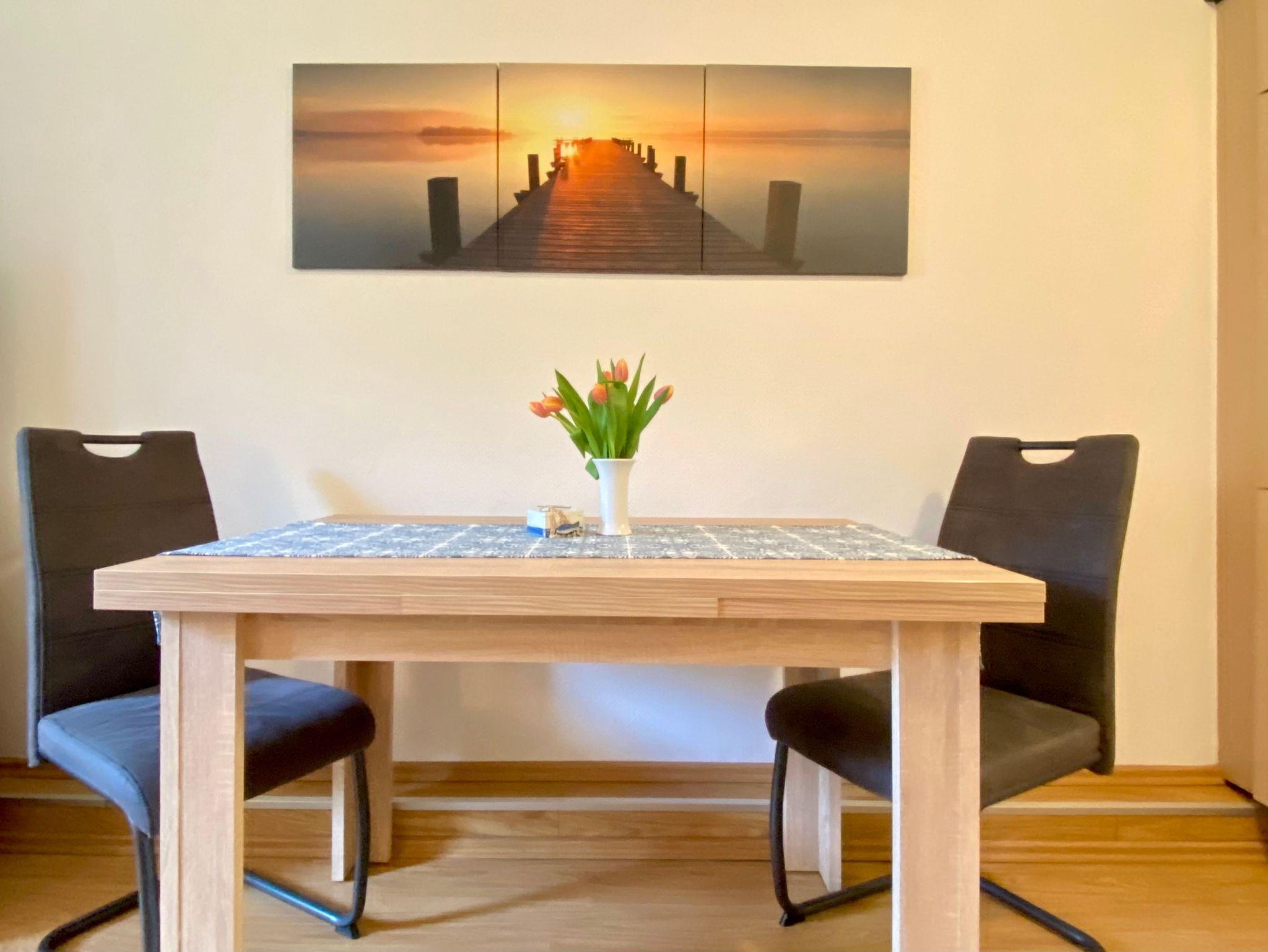 Die kleine 2-Raumferienwohnung verfügt über eine überdachte Terrasse mit Möbeln, ein Bad mit Dusche, ein Schlafzimmer mit Doppelbett in Komforthöhe und CD-Player, einen kombinierten Wohn-Essraum mit kleiner Küchenzeile (Geschirrspüler, 2-Plattenherd, Mikrowelle). Im Wohnzimmer befindet sich ein TV und ein DVD-Player mit DVDs für den Regentag im Urlaub. Stellplatz für den PKW und Fahrradschuppen sind vorhanden. Internet inklusive