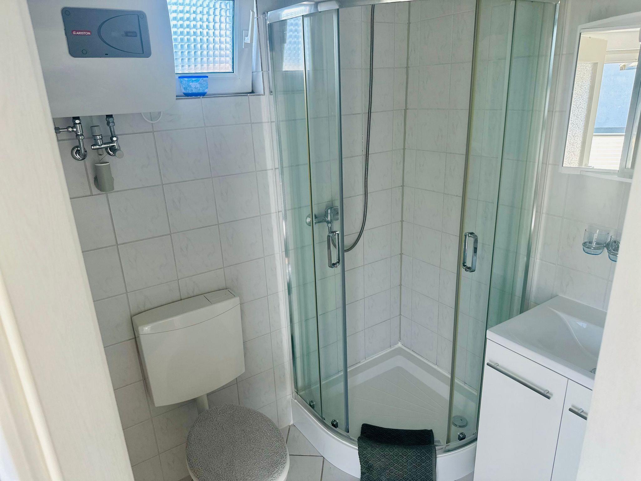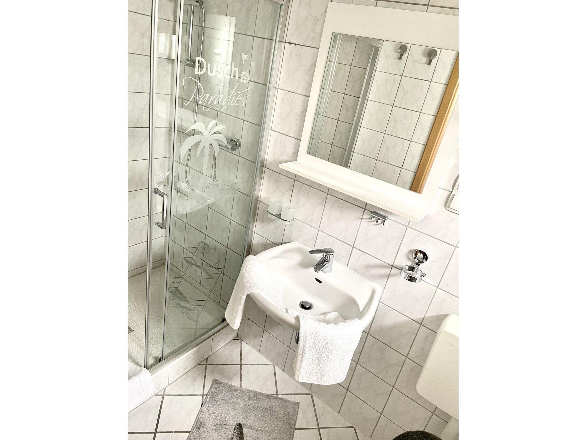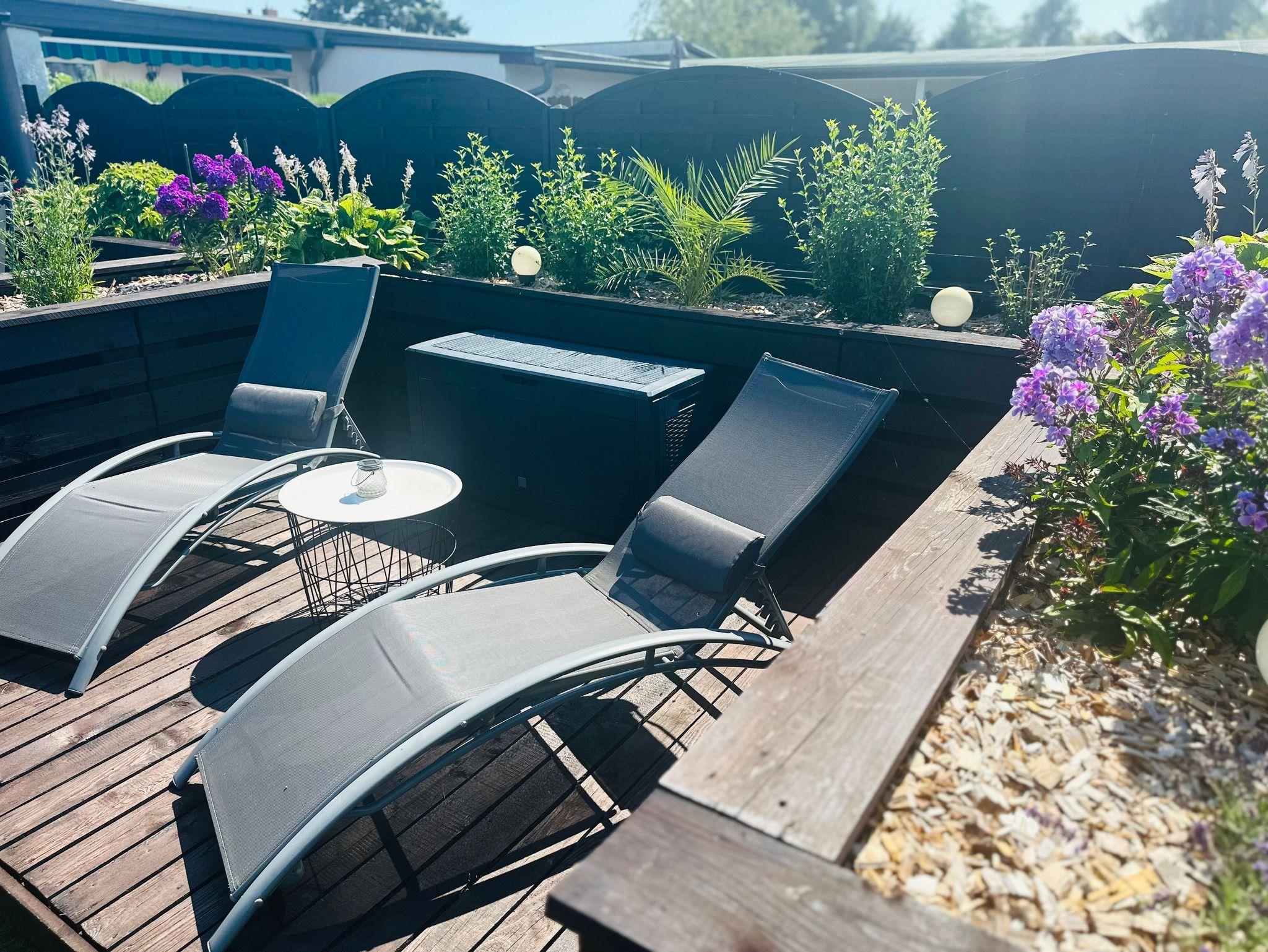 Das Badezimmer ist ausgestattet mit Dusche und WC. Das separate Schlafzimmer verfügt über ein Boxbett und Kleiderschrank. Zur Wohnung gehört eine Terrasse mit Tisch, Sitzgarnitur und Sonnenschirm zur Alleinnutzung.