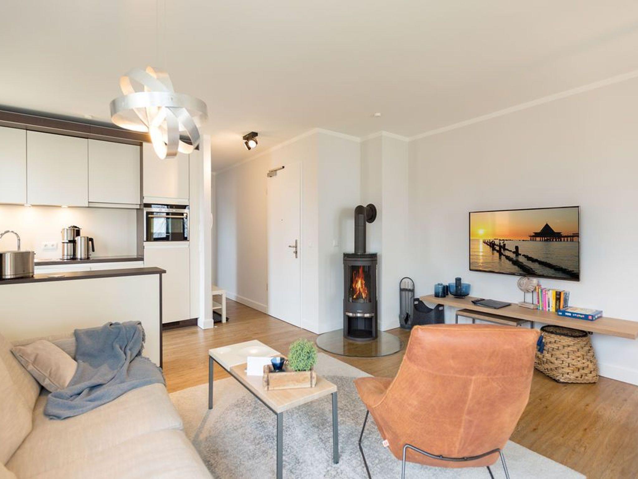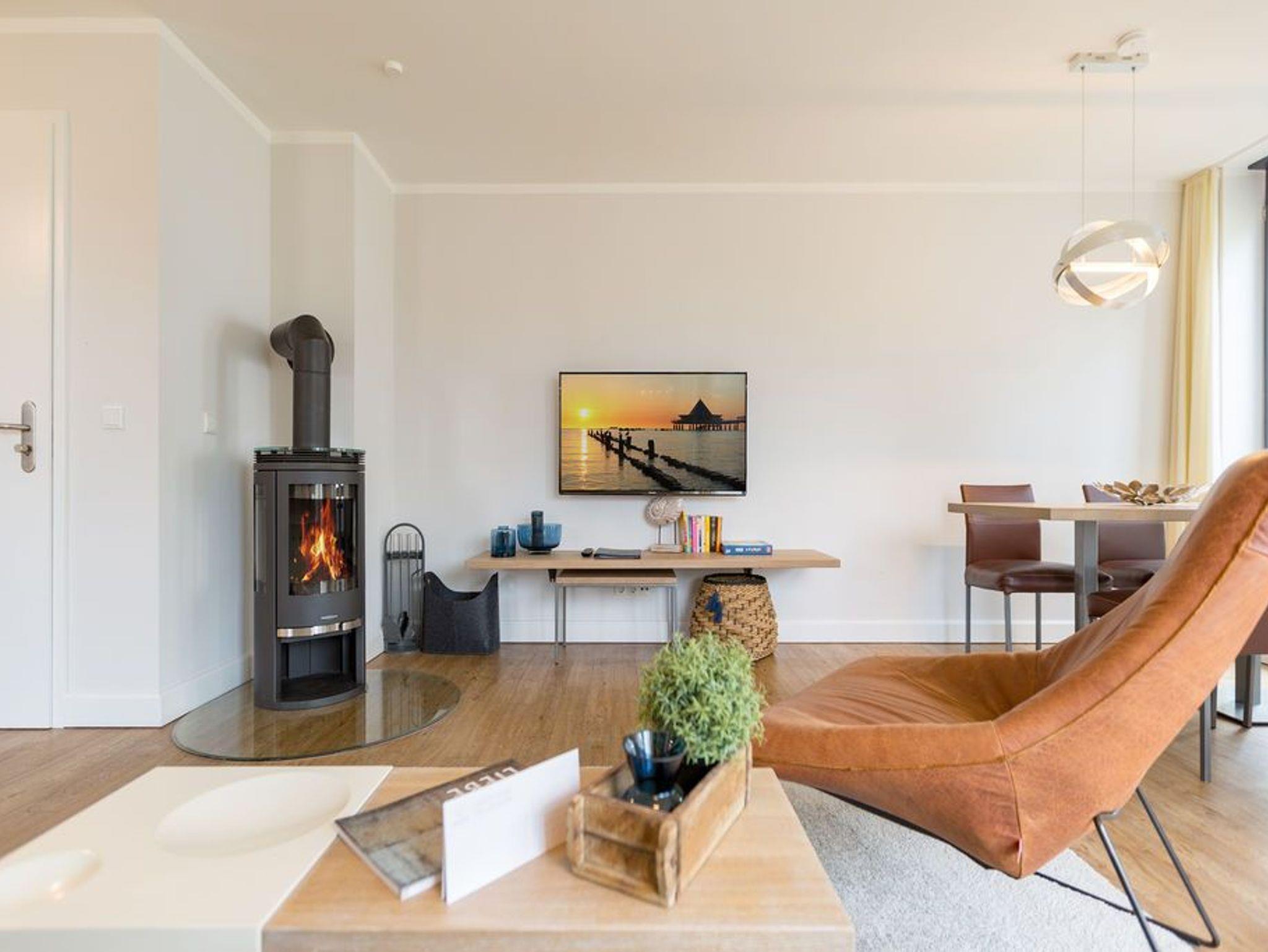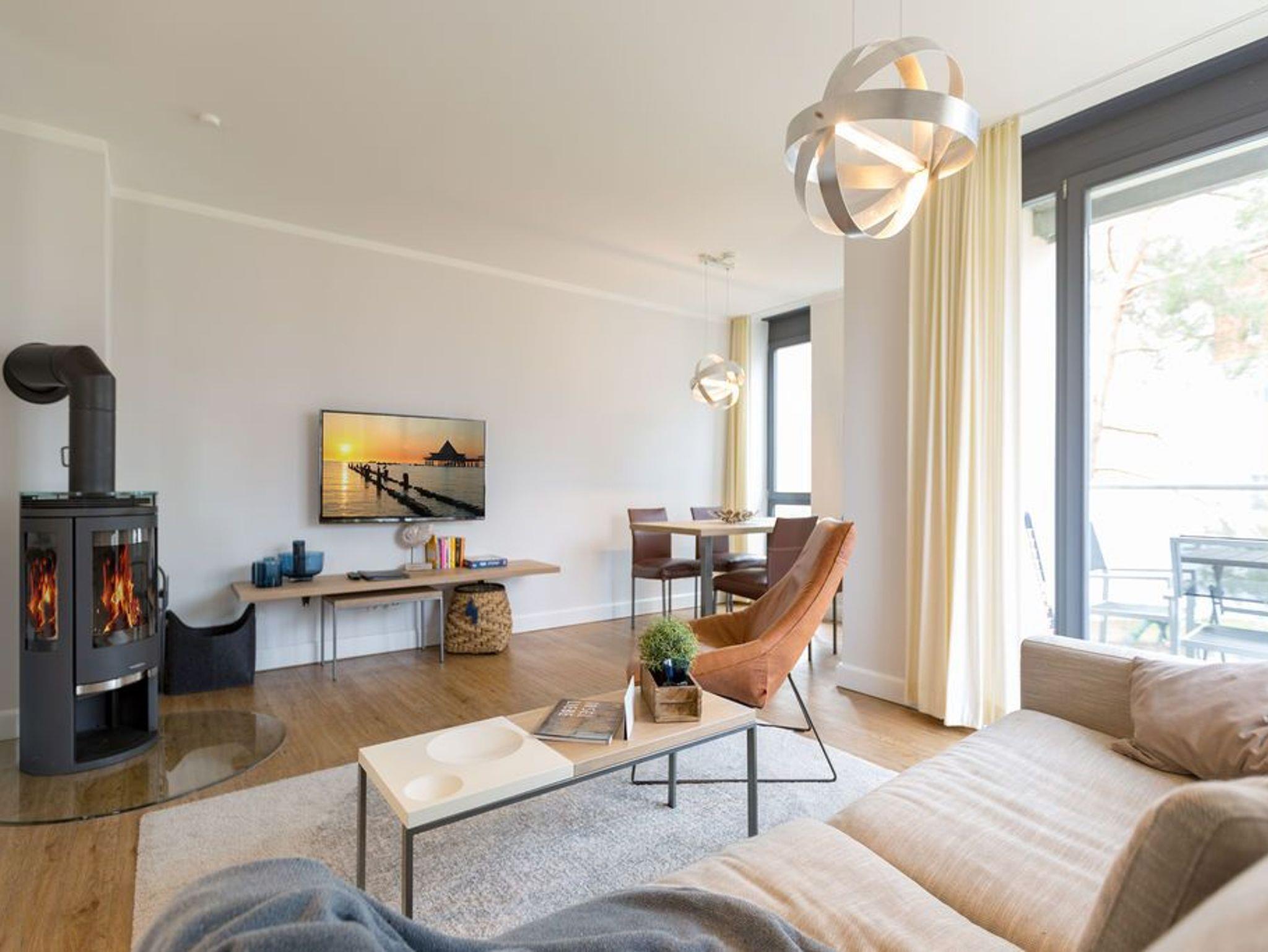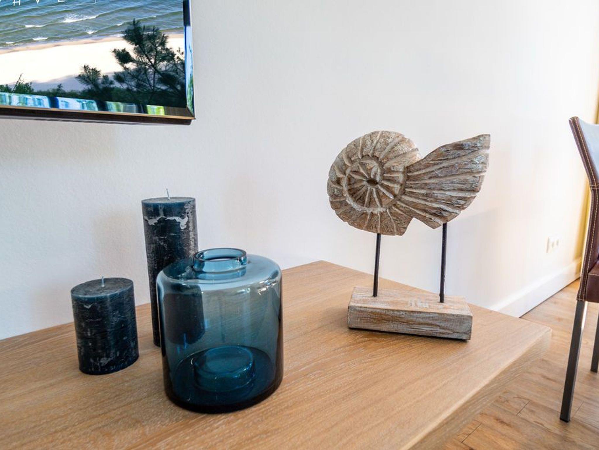 Maritime Farben, maritimes Flair ? im Appartement Nummer 3 im ersten Obergeschoss der Villa Maxim können Sie die Ostsee und den Strand förmlich spüren. Denn das Ambiente ist eigens auf die Farben Blau und Sand abgestimmt. Naturmaterialien geben der Wohnung einen echten Wohlfühlcharakter. Bis zu vier Personen und ein Kleinkind (im Kinderreisebett) haben auf den 70 Quadratmetern viel Platz. Das Appartement verfügt über zwei schöne Schlafzimmer mit bequemen Boxspringdoppelbetten (1,80 m x 2,00 m und 1,60 m x 2,00 m). Hier werden Sie schlafen wie auf Wolken. Das größere der beiden Schlafräume besitzt sogar einen eigenen kleinen Balkon an der Hausseite. Die Schränke bieten ausreichend Stauraum. Sollte der Schlaf doch einmal auf sich warten lassen oder Sie einen Tag im Bett verbringen wollen, sorgt der Flat-TV in jedem Zimmer für Unterhaltung. Doch nun zum eigentlichen Highlight der Wohnung: dem geräumigen Wohn-Esszimmer. Hier finden Sie alles, was Sie zum Ausspannen brauchen. Eine gemütliche Sofaecke mit Flat-TV und sogar einen Kaminofen, der Ihnen an kühlen Tagen und Abenden wohlige Wärme spendet. Allein dem Flammenspiel zuzuschauen, ist schon Erholung. Am Esstisch befinden sich vier bequeme Leder-Stühle. Lassen Sie sich hier oder am Tisch auf dem sonnigen Süd-Balkon zum Essen oder gemeinsamen Plauschen nieder. So beginnt der Urlaubstag schon beim Frühstücken relaxed. Zum Zubereiten und Kochen jeglicher Gerichte finden Sie alles in der offenen Wohnküche. Hochwertige Geräte wie Kühlschrank mit Gefriermöglichkeit, Herd, Backofen, Mikrowelle oder Kaffeemaschine erleichtern die Arbeit. Auch edles Geschirr befindet sich in den Schränken. Das geräumige Badezimmer ist mit einer ebenerdigen Dusche, einem Waschtisch und einem WC ausgestattet. Sie brauchen auch im Urlaub einen Internetanschluss? Kein Problem. In der Wohnung steht Ihnen kostenfrei WLAN zur Verfügung. Ein zusätzliches Guddi ist die kleine Wellness-Oase mit zwei Saunen, einem Relax Raum und Duschen im Erdgeschoss der Villa, die Sie gern unentgeltlich mitbenutzen können. Für Ihren Pkw gibt es einen Außenstellplatz. Bei Anreise liegen Handtücher für Sie bereit und die Betten sind natürlich schon bezogen.