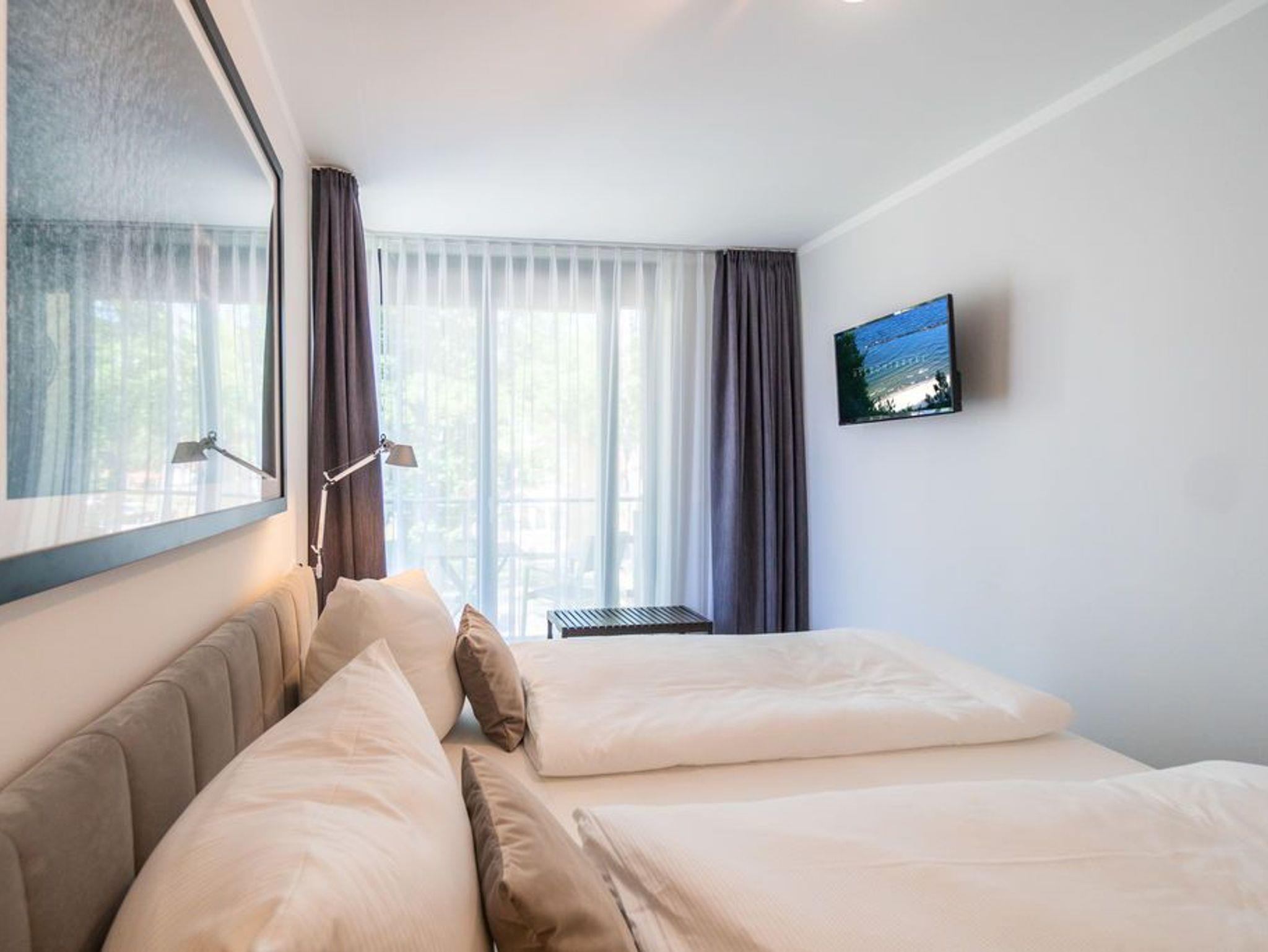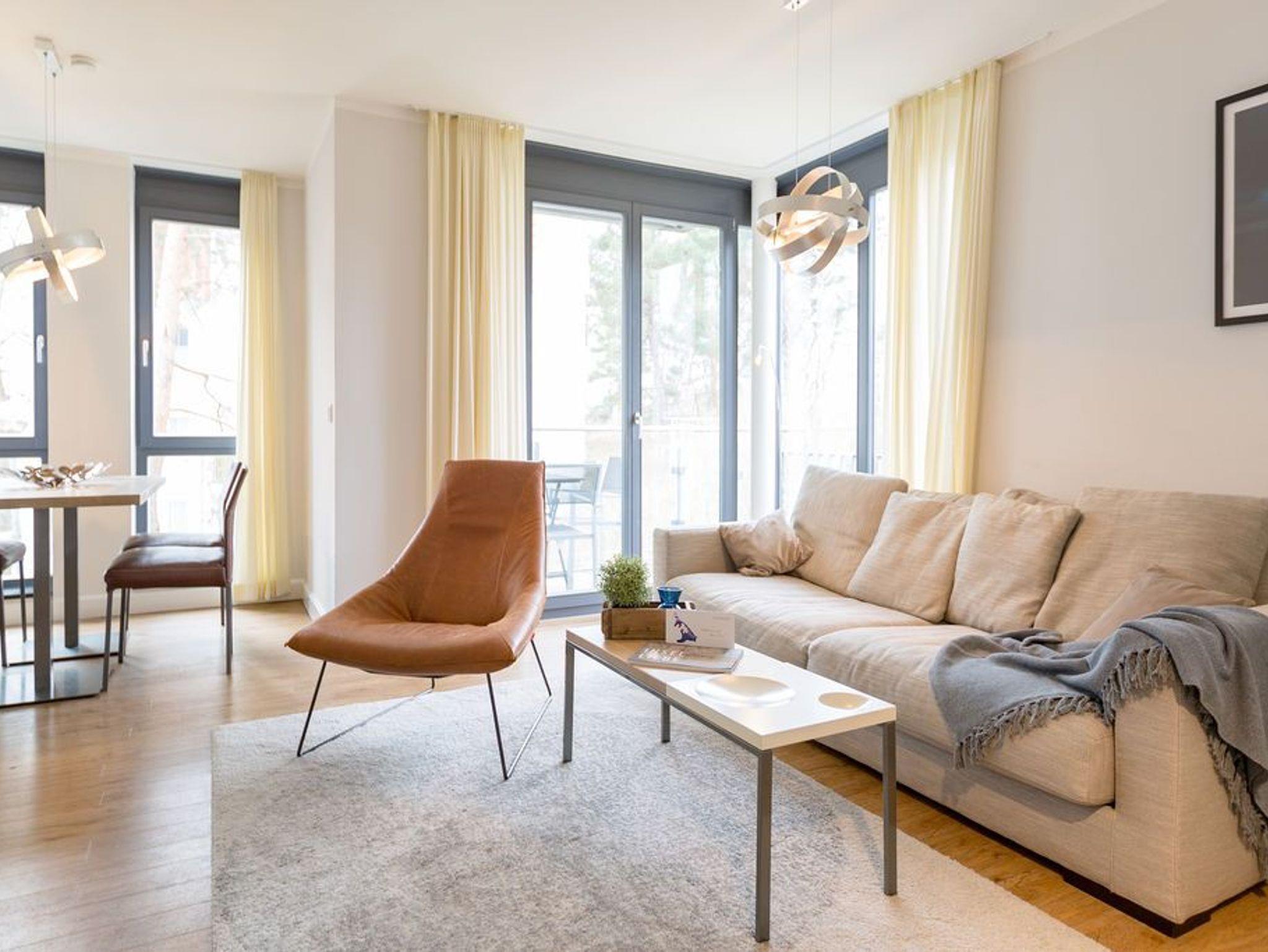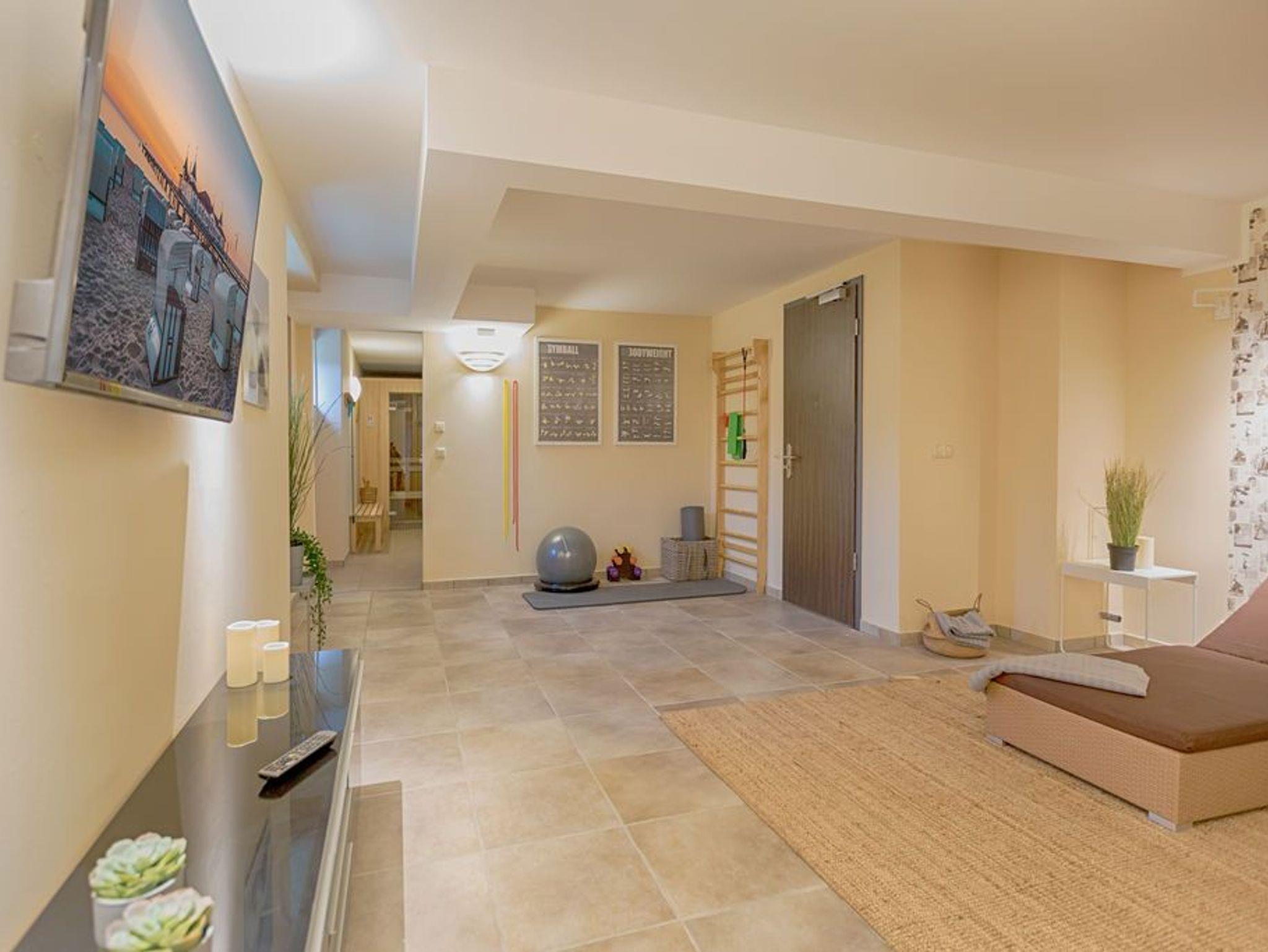 Maritime Farben, maritimes Flair ? im Appartement Nummer 3 im ersten Obergeschoss der Villa Maxim können Sie die Ostsee und den Strand förmlich spüren. Denn das Ambiente ist eigens auf die Farben Blau und Sand abgestimmt. Naturmaterialien geben der Wohnung einen echten Wohlfühlcharakter. Bis zu vier Personen und ein Kleinkind (im Kinderreisebett) haben auf den 70 Quadratmetern viel Platz. Das Appartement verfügt über zwei schöne Schlafzimmer mit bequemen Boxspringdoppelbetten (1,80 m x 2,00 m und 1,60 m x 2,00 m). Hier werden Sie schlafen wie auf Wolken. Das größere der beiden Schlafräume besitzt sogar einen eigenen kleinen Balkon an der Hausseite. Die Schränke bieten ausreichend Stauraum. Sollte der Schlaf doch einmal auf sich warten lassen oder Sie einen Tag im Bett verbringen wollen, sorgt der Flat-TV in jedem Zimmer für Unterhaltung. Doch nun zum eigentlichen Highlight der Wohnung: dem geräumigen Wohn-Esszimmer. Hier finden Sie alles, was Sie zum Ausspannen brauchen. Eine gemütliche Sofaecke mit Flat-TV und sogar einen Kaminofen, der Ihnen an kühlen Tagen und Abenden wohlige Wärme spendet. Allein dem Flammenspiel zuzuschauen, ist schon Erholung. Am Esstisch befinden sich vier bequeme Leder-Stühle. Lassen Sie sich hier oder am Tisch auf dem sonnigen Süd-Balkon zum Essen oder gemeinsamen Plauschen nieder. So beginnt der Urlaubstag schon beim Frühstücken relaxed. Zum Zubereiten und Kochen jeglicher Gerichte finden Sie alles in der offenen Wohnküche. Hochwertige Geräte wie Kühlschrank mit Gefriermöglichkeit, Herd, Backofen, Mikrowelle oder Kaffeemaschine erleichtern die Arbeit. Auch edles Geschirr befindet sich in den Schränken. Das geräumige Badezimmer ist mit einer ebenerdigen Dusche, einem Waschtisch und einem WC ausgestattet. Sie brauchen auch im Urlaub einen Internetanschluss? Kein Problem. In der Wohnung steht Ihnen kostenfrei WLAN zur Verfügung. Ein zusätzliches Guddi ist die kleine Wellness-Oase mit zwei Saunen, einem Relax Raum und Duschen im Erdgeschoss der Villa, die Sie gern unentgeltlich mitbenutzen können. Für Ihren Pkw gibt es einen Außenstellplatz. Bei Anreise liegen Handtücher für Sie bereit und die Betten sind natürlich schon bezogen.