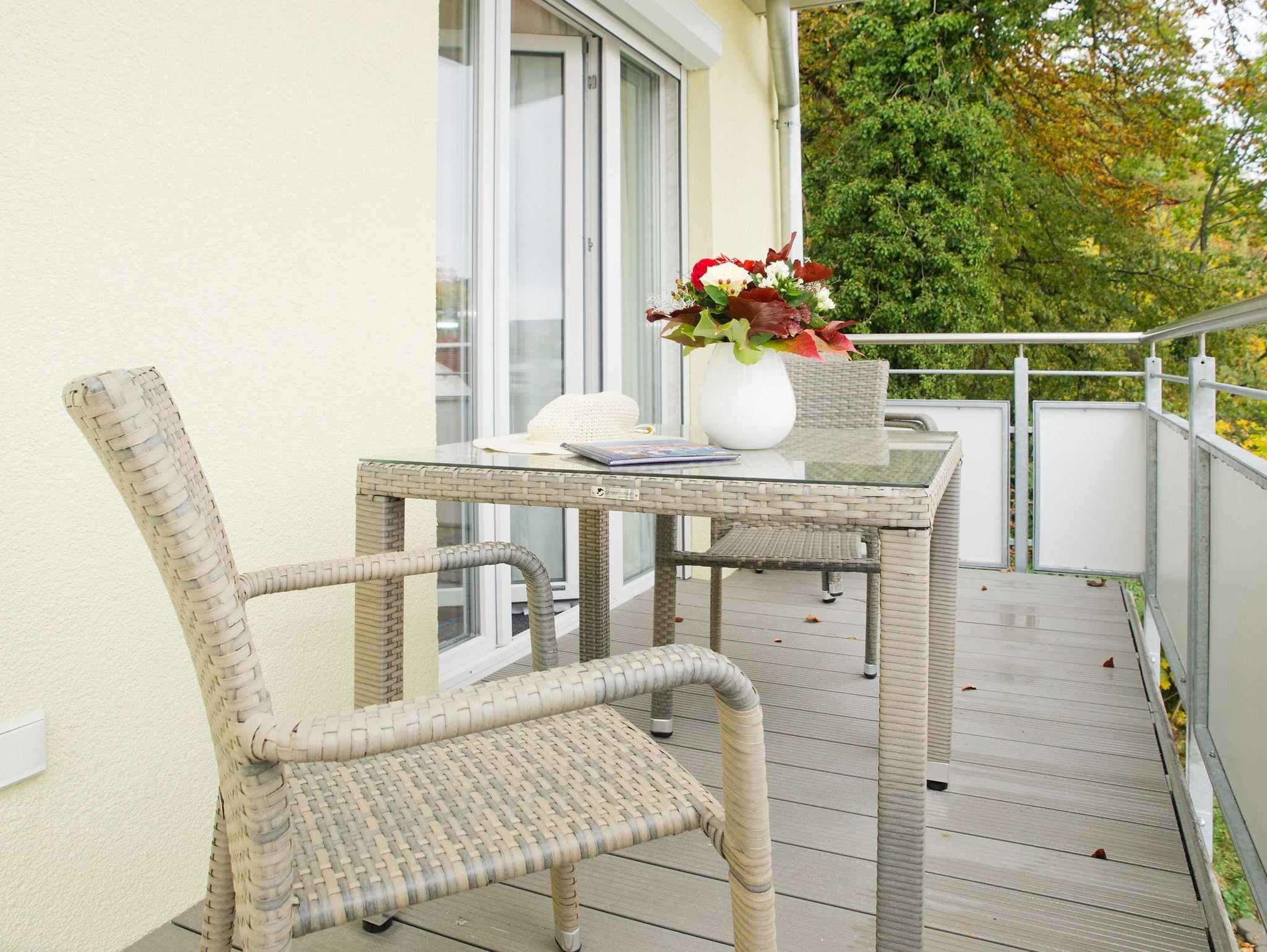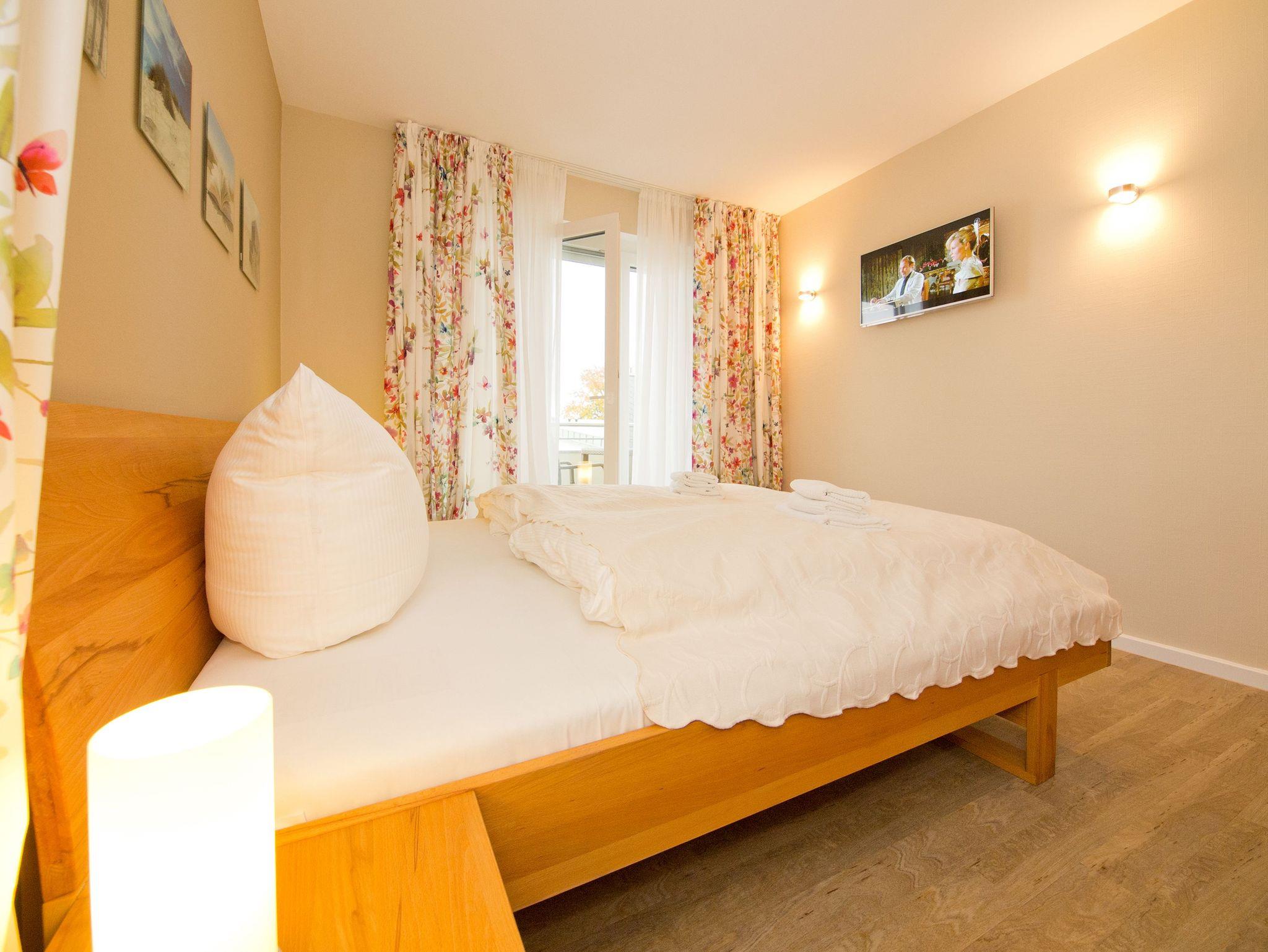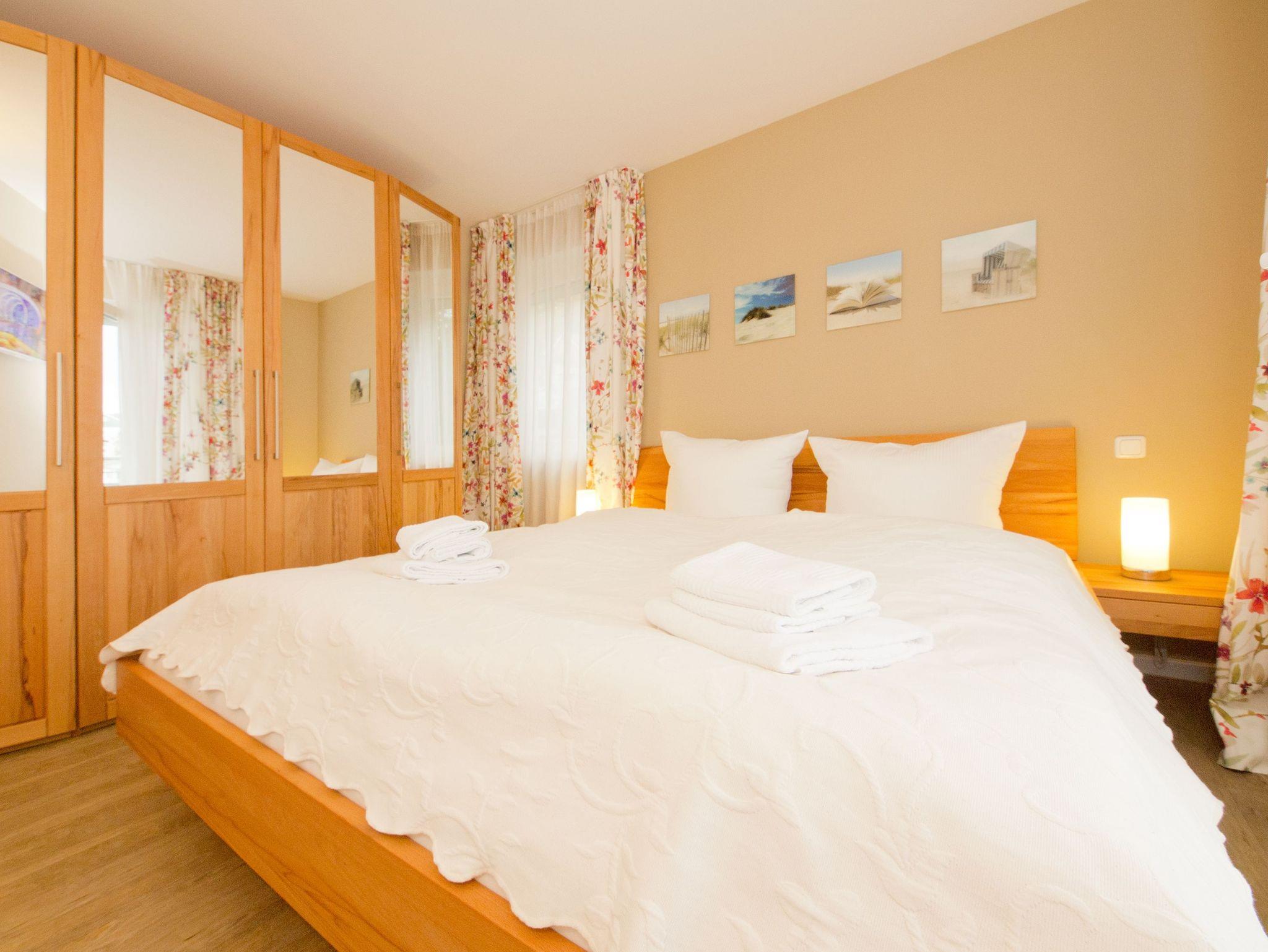 Kuschelig, gemütlich und einfach zum Wohlfühlen ist dieses 54 Quadratmeter große Urlaubsreich für zwei Personen. Das 2-Zimmer-Appartement hat alles zu bieten, was man sich für eine entspannte Auszeit nur wünschen kann. Nicht nur, dass das geräumige Wohnzimmer mit komfortablen Relax-Zonen aufwartet. Eine 40 Quadratmeter große Terrasse wird zum Sonnendeck und ein weiterer Balkon vor dem Schlafzimmer sorgt schon direkt nach dem Aufwachen für den besten ersten Gang, den man im Urlaub machen kann. Denn mit frischer Ostseeluft in der Nase startet der Tag doch perfekt. Das Wohnzimmer ist so großzügig geschnitten, dass es auch einem schönen Esstisch Platz bietet. Prasselnd verlockt das Flammenspiel im Kaminofen dazu, auf dem Sofa oder dem Sessel zu träumen. Schlechtes Wetter oder kühle Abende werden so zu Kuschelauszeiten. Die Küche ? offen und mit allem ausgestattet ? schließt sich direkt an. Ob Kühlschrank, Spülmaschine, Toaster, Kaffeemaschine: Hier fehlt es an nichts. Auch nicht an schönem Geschirr. Das Schlafzimmer bietet für erholsame Nachtstunden ein bequemes Doppelbett und einen Flat-TV. Ein großer Spiegelschrank hält viele Ablageflächen für die Urlaubsgarderobe bereit. Das Badezimmer ist modern und schick. Es verfügt über eine breite und ebenerdige Dusche, WC und einen Waschtisch. Handtücher liegen bereit und auch die Betten sind natürlich bei Anreise schon bezogen. So dass Sie sich um nichts mehr sorgen müssen. Das WLAN ist kostenfrei und in der Tiefgarage befindet sich für Ihr Auto ein Stellplatz.