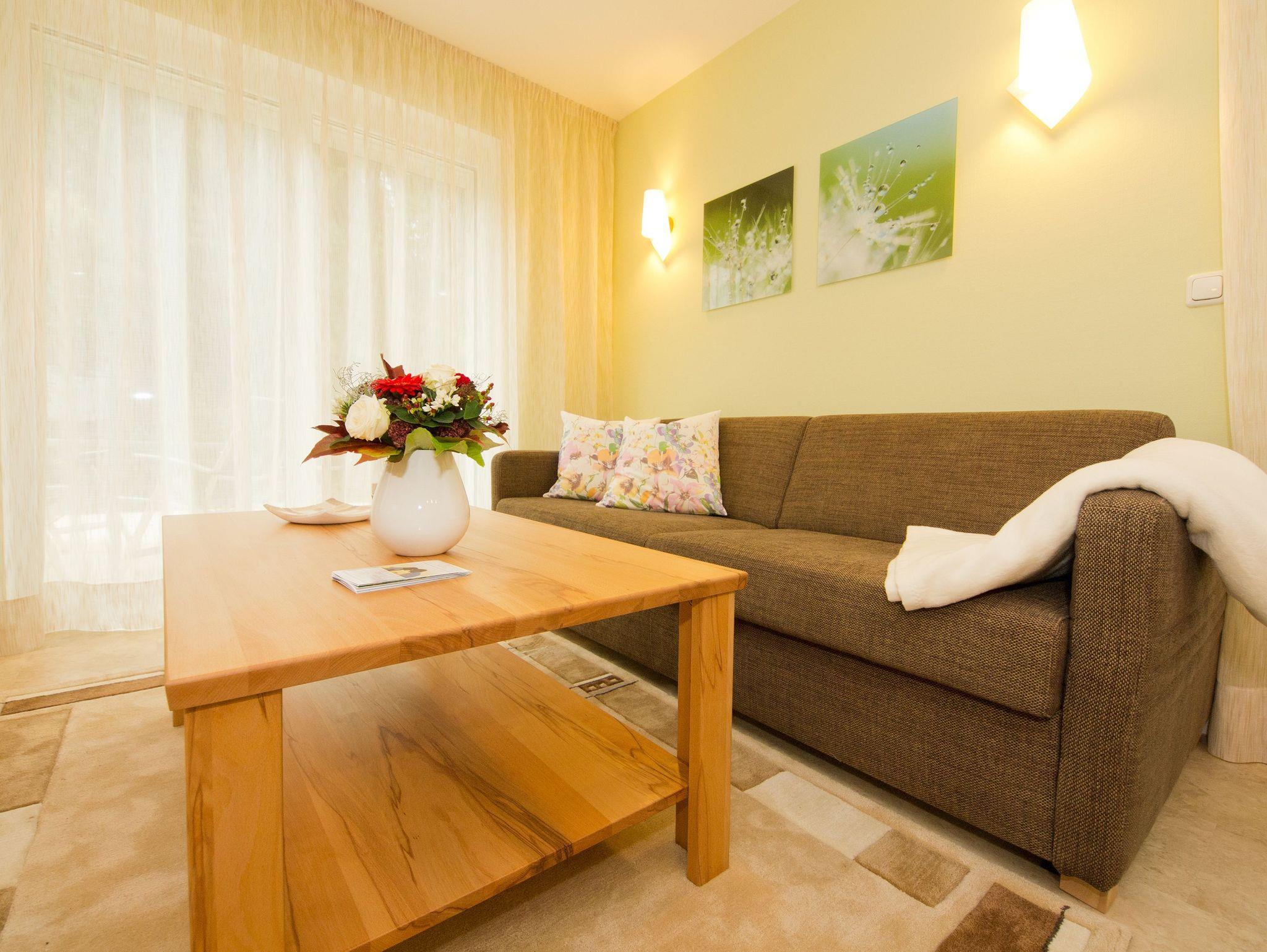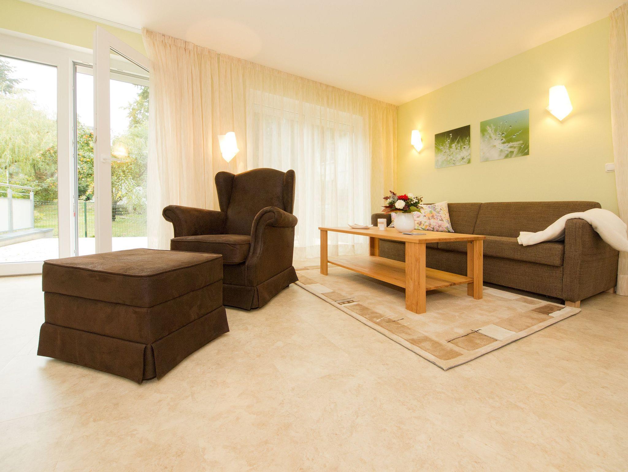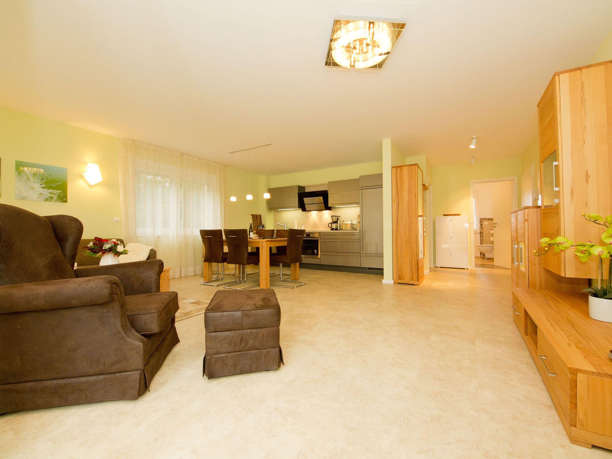 Kuschelig, gemütlich und einfach zum Wohlfühlen ist dieses 54 Quadratmeter große Urlaubsreich für zwei Personen. Das 2-Zimmer-Appartement hat alles zu bieten, was man sich für eine entspannte Auszeit nur wünschen kann. Nicht nur, dass das geräumige Wohnzimmer mit komfortablen Relax-Zonen aufwartet. Eine 40 Quadratmeter große Terrasse wird zum Sonnendeck und ein weiterer Balkon vor dem Schlafzimmer sorgt schon direkt nach dem Aufwachen für den besten ersten Gang, den man im Urlaub machen kann. Denn mit frischer Ostseeluft in der Nase startet der Tag doch perfekt. Das Wohnzimmer ist so großzügig geschnitten, dass es auch einem schönen Esstisch Platz bietet. Prasselnd verlockt das Flammenspiel im Kaminofen dazu, auf dem Sofa oder dem Sessel zu träumen. Schlechtes Wetter oder kühle Abende werden so zu Kuschelauszeiten. Die Küche ? offen und mit allem ausgestattet ? schließt sich direkt an. Ob Kühlschrank, Spülmaschine, Toaster, Kaffeemaschine: Hier fehlt es an nichts. Auch nicht an schönem Geschirr. Das Schlafzimmer bietet für erholsame Nachtstunden ein bequemes Doppelbett und einen Flat-TV. Ein großer Spiegelschrank hält viele Ablageflächen für die Urlaubsgarderobe bereit. Das Badezimmer ist modern und schick. Es verfügt über eine breite und ebenerdige Dusche, WC und einen Waschtisch. Handtücher liegen bereit und auch die Betten sind natürlich bei Anreise schon bezogen. So dass Sie sich um nichts mehr sorgen müssen. Das WLAN ist kostenfrei und in der Tiefgarage befindet sich für Ihr Auto ein Stellplatz.