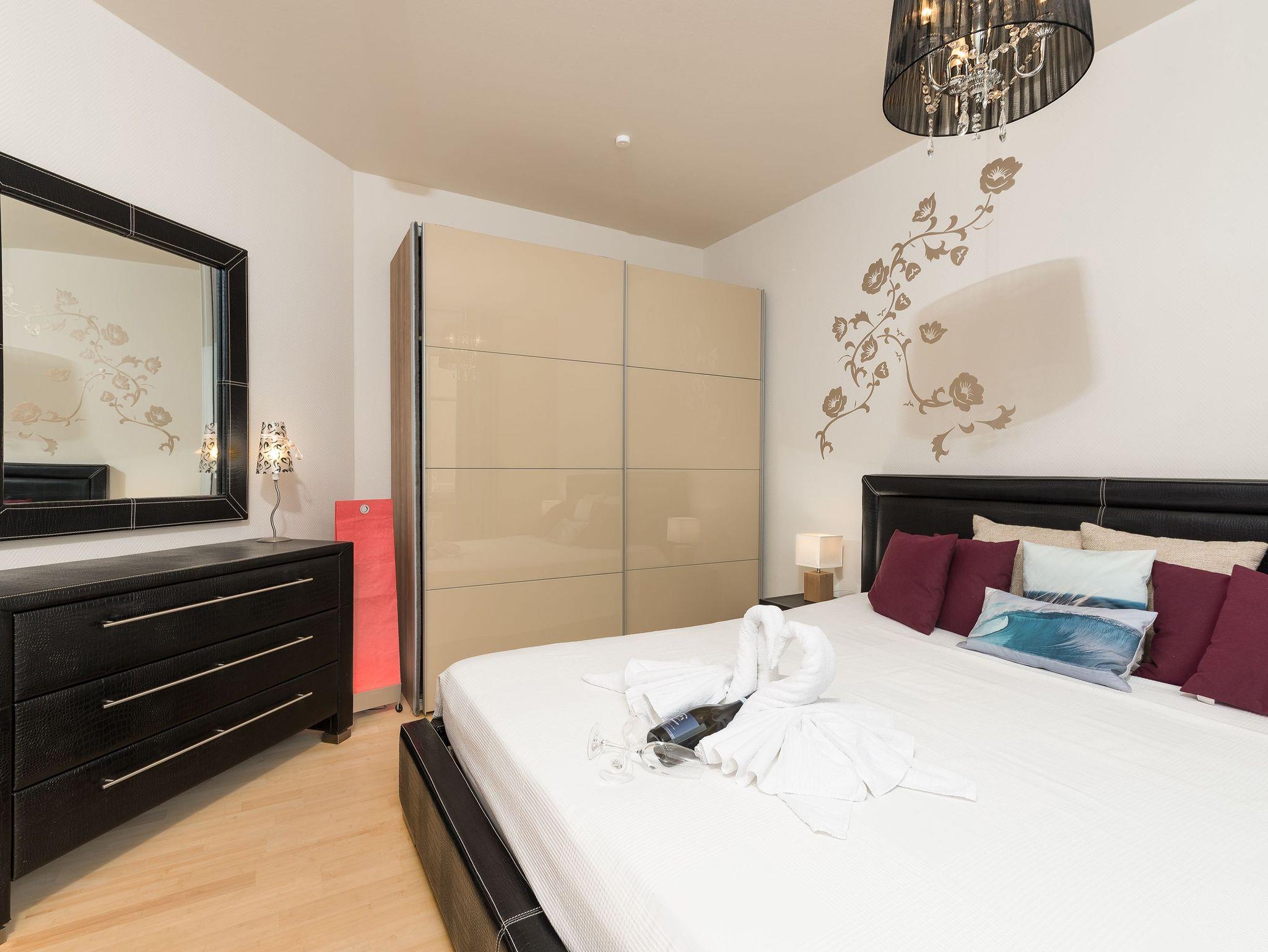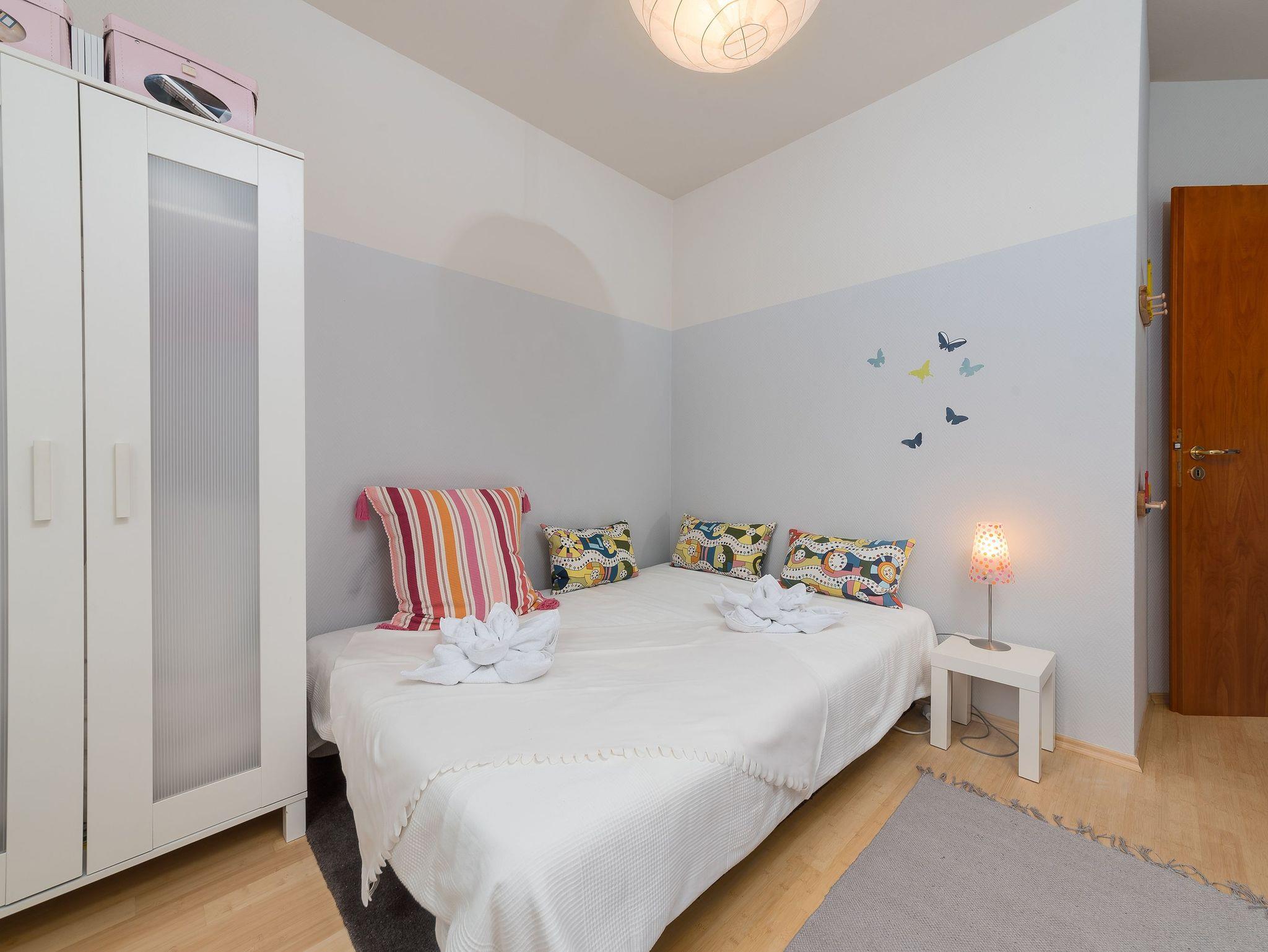 Die Terrassenwohnung im Erdgeschoss ist perfekt für bis zu 4 Personen konzipiert und vereint Komfort mit liebevoller Einrichtung. Das Herzstück bildet der großzügige Wohn- und Essbereich mit einem Flat-TV, ideal für gemütliche Abende. Das Haupt-Schlafzimmer ist mit einem bequemen Doppelbett ausgestattet, während das zweite Schlafzimmer nicht nur ein Doppelbett (1,40 m x 2,00 m), sondern auch eine praktische Schlafcouch (1,40 m) bietet, die zusätzlichen Schlafplatz verspricht. Ergänzt wird das Raumangebot durch ein Badezimmer mit Badewanne, ein separates Gäste-WC und eine voll ausgestattete Küchenzeile mit Spülmaschine.