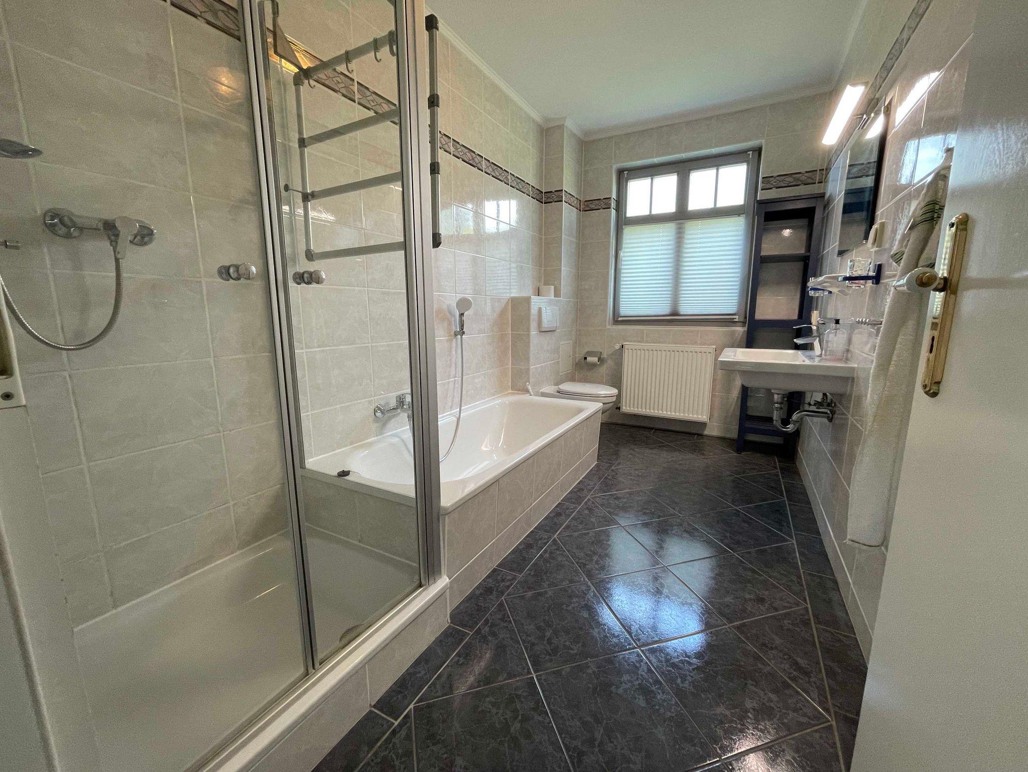 Das großzügig, modern und komfortabel eingerichtete 3-Raum-Appartement im Erdgeschoß mit kompletter, separater Küche (Cerankochfeld, Geschirrspüler, hochwertiges Geschirr, Mikrowelle,Backofen etc.) ist für 4 Personen (Doppelbett im 1. Schlafraum & großes Etagenbett im 2.Schlafraum) sowie für eine weitere Personen (Doppelschlafcouch im Wohnraum) vorgesehen. Im Bad befinden