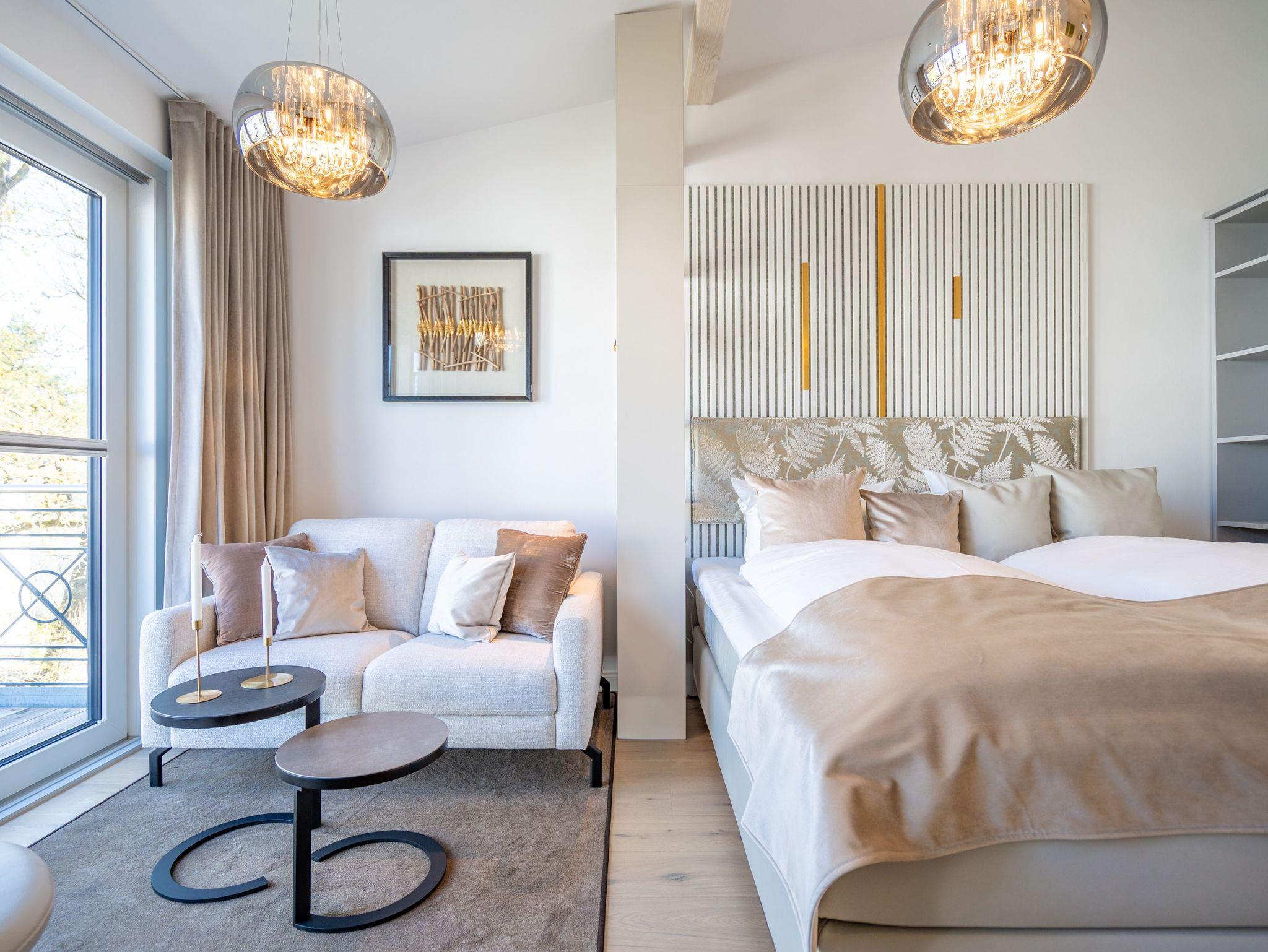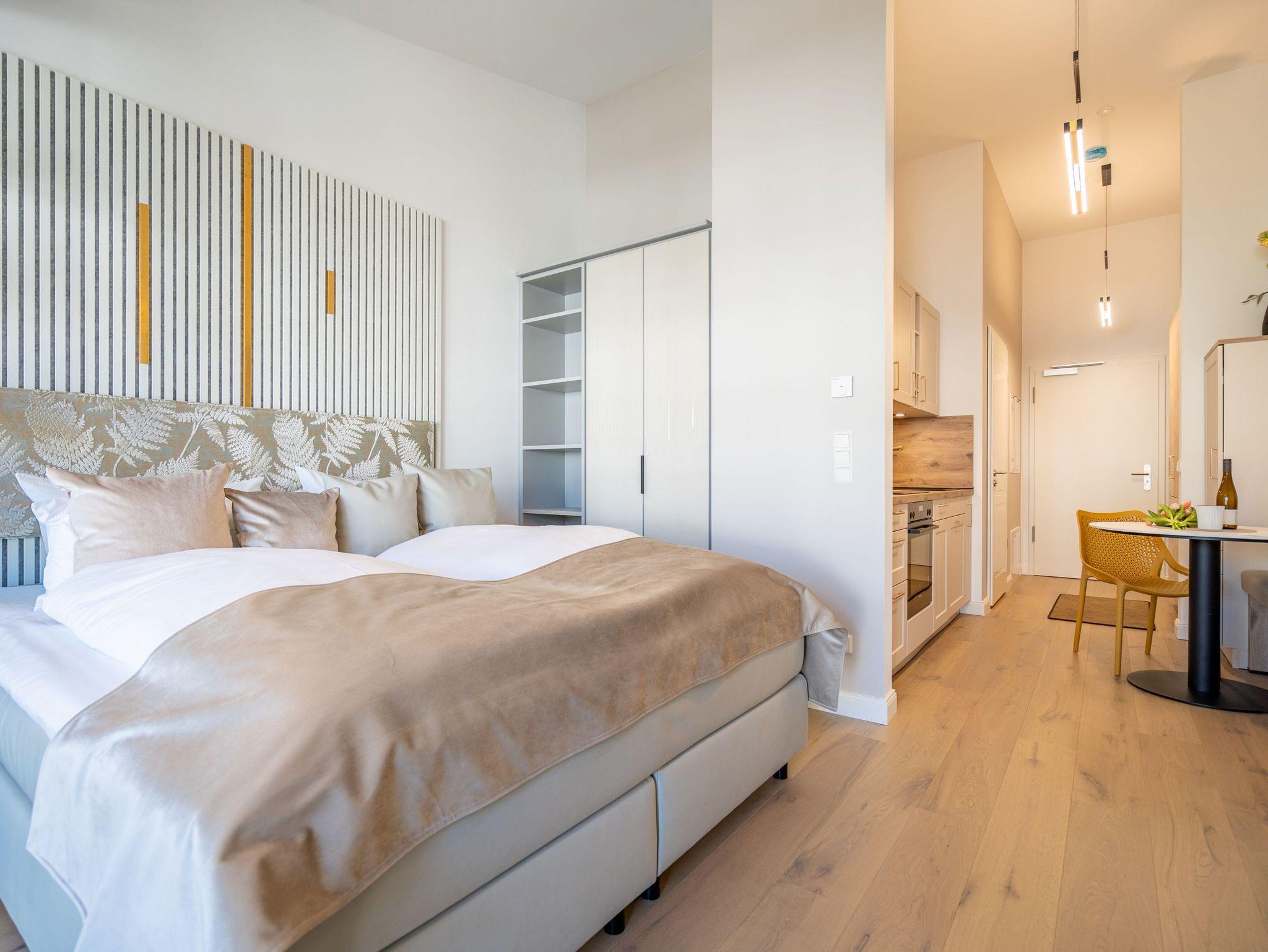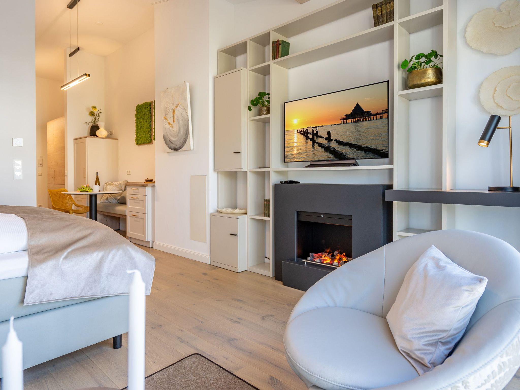 In diesem charmanten 1-Raum-Appartement im Dachgeschoss erwartet Sie auf rund 36?m² ein stilvoll gestalteter Rückzugsort für zwei Personen ? ideal für eine Auszeit zu zweit. Der offene Wohn- und Schlafbereich überzeugt mit einer gemütlichen Sitzgruppe, einem komfortablen Boxspringbett (1,80?m x 2,00?m), einem geräumigen Kleiderschrank sowie einem Elektro-Kamin mit Fernbedienung, der stimmungsvolle Wohlfühlmomente garantiert. Für Ihre Unterhaltung sorgt ein Flat-TV mit integriertem Radio. Die moderne Küchenzeile ist voll ausgestattet ? mit Backofen, Spülmaschine und Kühlschrank mit Gefrierfach ? und bietet alles für genussvolle Kochmomente. Der Essplatz für zwei Personen lädt zum gemeinsamen Frühstück oder Dinner ein. Vom Wohnbereich gelangen Sie direkt auf den überdachten Nord-Ost-Balkon (ca. 5,8?m²), wo Gartenmöbel zum entspannten Verweilen im Freien einladen. Ein echtes Highlight ist das innenliegende Badezimmer mit Dusche, WC, Waschtisch und eigener Finnischer Sauna ? für private Wellnessstunden zu jeder Jahreszeit. Zur weiteren Ausstattung gehören kostenfreies WLAN, ein PKW-Stellplatz in der Tiefgarage sowie ein eigener Abstellraum für Fahrräder ? perfekt für aktive Urlaubstage in der Umgebung.
