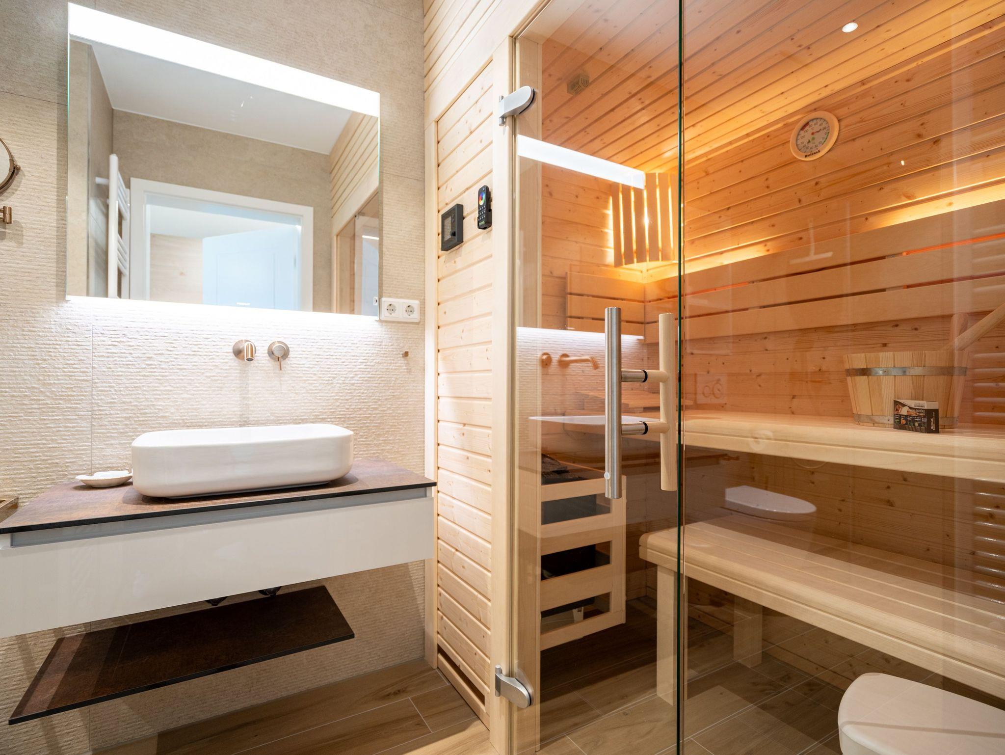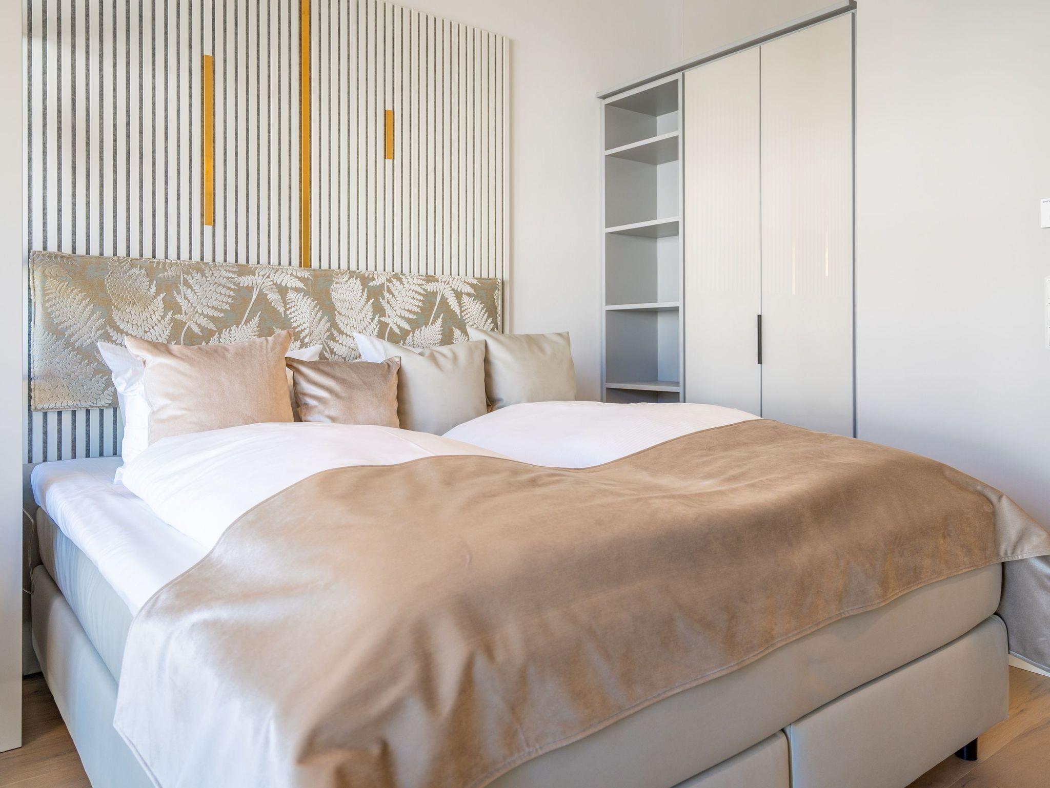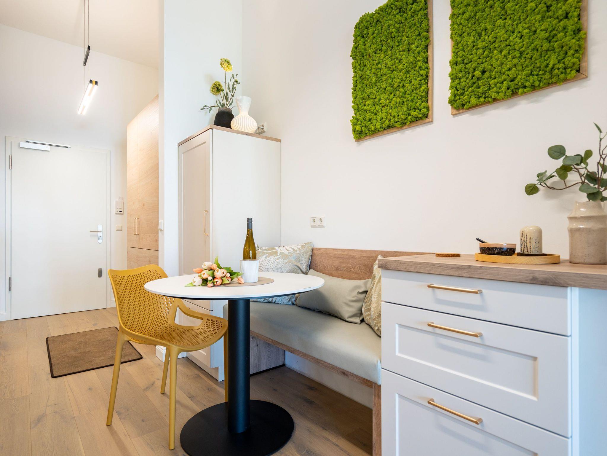 In diesem charmanten 1-Raum-Appartement im Dachgeschoss erwartet Sie auf rund 36?m² ein stilvoll gestalteter Rückzugsort für zwei Personen ? ideal für eine Auszeit zu zweit. Der offene Wohn- und Schlafbereich überzeugt mit einer gemütlichen Sitzgruppe, einem komfortablen Boxspringbett (1,80?m x 2,00?m), einem geräumigen Kleiderschrank sowie einem Elektro-Kamin mit Fernbedienung, der stimmungsvolle Wohlfühlmomente garantiert. Für Ihre Unterhaltung sorgt ein Flat-TV mit integriertem Radio. Die moderne Küchenzeile ist voll ausgestattet ? mit Backofen, Spülmaschine und Kühlschrank mit Gefrierfach ? und bietet alles für genussvolle Kochmomente. Der Essplatz für zwei Personen lädt zum gemeinsamen Frühstück oder Dinner ein. Vom Wohnbereich gelangen Sie direkt auf den überdachten Nord-Ost-Balkon (ca. 5,8?m²), wo Gartenmöbel zum entspannten Verweilen im Freien einladen. Ein echtes Highlight ist das innenliegende Badezimmer mit Dusche, WC, Waschtisch und eigener Finnischer Sauna ? für private Wellnessstunden zu jeder Jahreszeit. Zur weiteren Ausstattung gehören kostenfreies WLAN, ein PKW-Stellplatz in der Tiefgarage sowie ein eigener Abstellraum für Fahrräder ? perfekt für aktive Urlaubstage in der Umgebung.