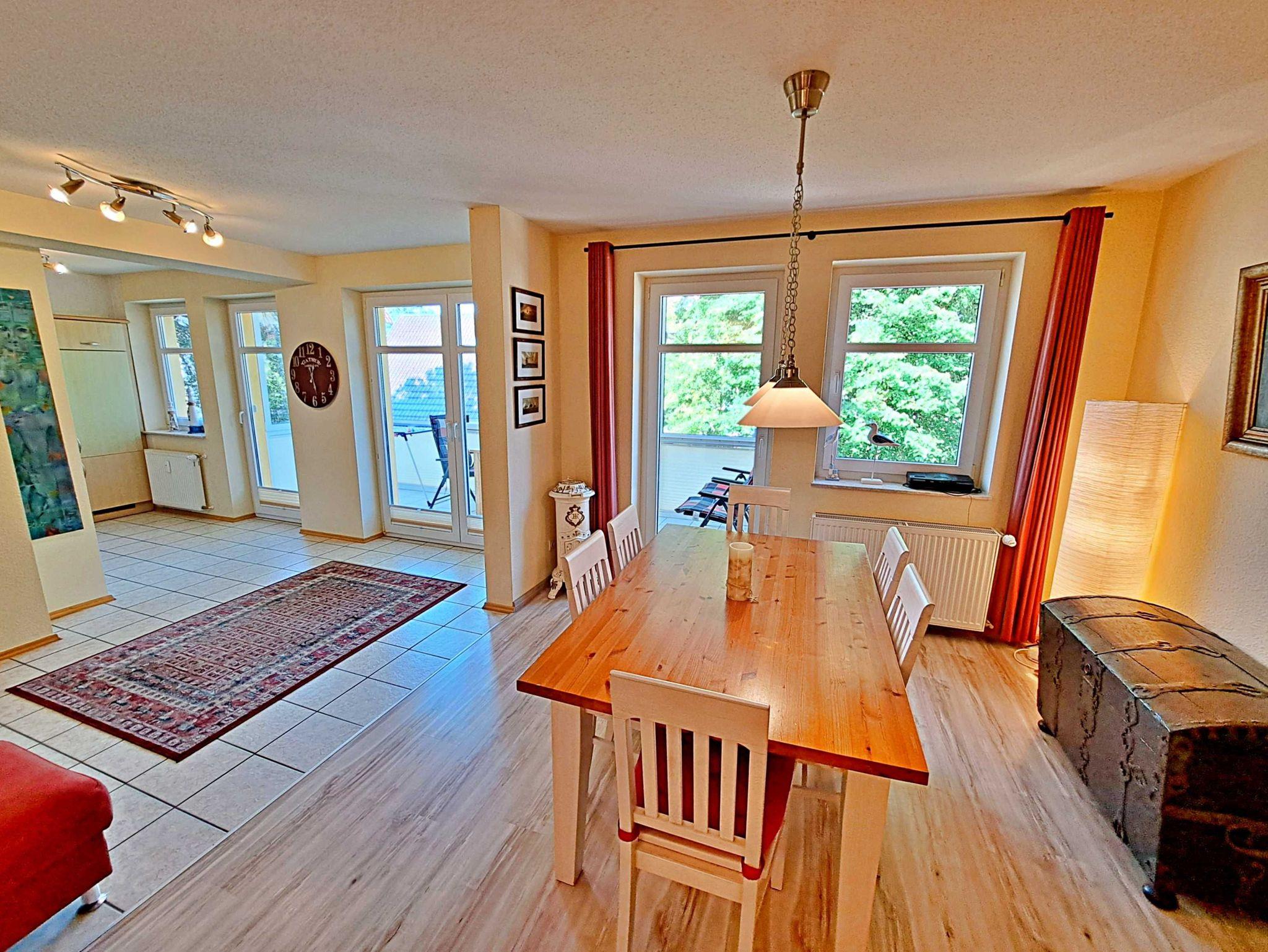 Charmant, freundlich und komfortabel - Diese einladende 3-Raum-Ferienwohnung im Haus Karavelle erstreckt sich über zwei Etagen im 2. Obergeschoss und bietet Ihnen alles, was Sie für einen entspannten Aufenthalt benötigen. Beim Betreten der Wohnung gelangen Sie in die großzügige Diele, die Sie in den hellen Wohnbereich mit einer modernen Küchenzeile und einem Esstisch für bis zu sechs Personen führt. Die Küche ist bestens ausgestattet mit einem 4-Plattenherd, Backofen, Spülmaschine, Kühlschrank, Mikrowelle und Geschirr - hier können Sie Ihre kulinarischen Fähigkeiten entfalten! Im gemütlichen Wohnzimmer erwartet Sie eine bequeme Eckcouch, ein Flat-TV und ein CD-Player - ideal für entspannte Abende. Der angrenzende Wintergarten lädt dazu ein, das Frühstück in aller Ruhe zu genießen oder den Tag bei einem Glas Wein ausklingen zu lassen, während Sie die eingeschränkte Sicht auf das Meer bewundern. Das Badezimmer ist mit einer großzügigen Dusche und WC ausgestattet. Im Obergeschoss finden Sie zwei separate Schlafzimmer: eines mit einem Doppelbett und einem zweiten TV sowie ein weiteres Schlafzimmer mit einem Doppel- und einem Einzelbett. Ein Gäste-WC, das von beiden Schlafzimmern zugänglich ist, sorgt für zusätzlichen Komfort. Auf Anfrage wird gerne ein Kinderreisebett und einen Hochstuhl kostenfrei zur Verfügung gestellt. Ein Pkw-Stellplatz auf dem umzäunten Grundstück steht Ihnen ebenfalls zur Verfügung. Für Ihre Wäsche können Sie gegen Entgelt eine Waschmaschine und einen Wäschetrockner im Objekt nutzen. Die Erstausstattung Bettwäsche und Handtücher kann bei der Buchung der Ferienwohnung für nur 17,50 € pro Person hinzugebucht werden. WLAN-Zugang ist für ein Gerät kostenfrei, für jedes weitere Gerät werden 10 € pro Woche berechnet.