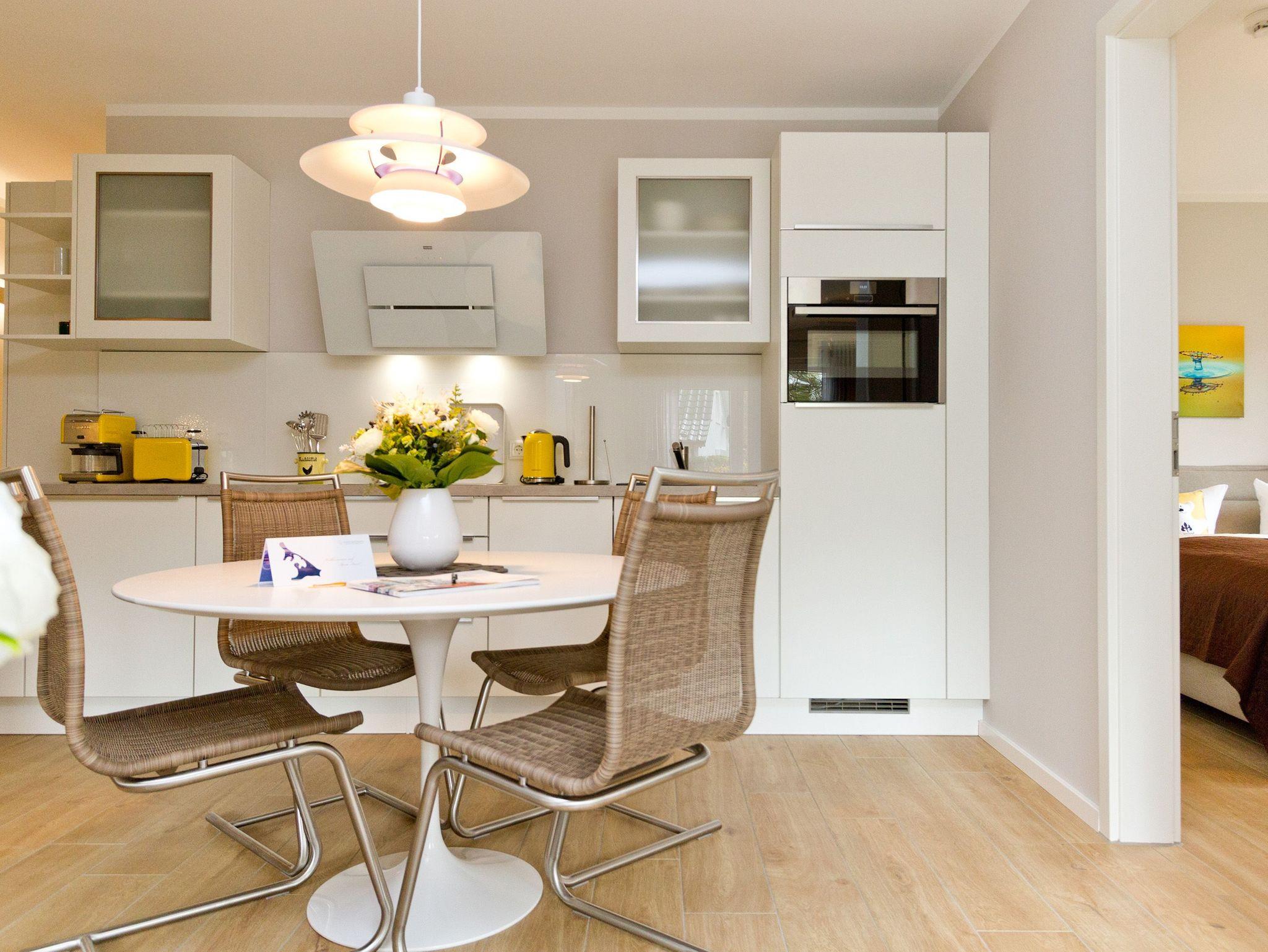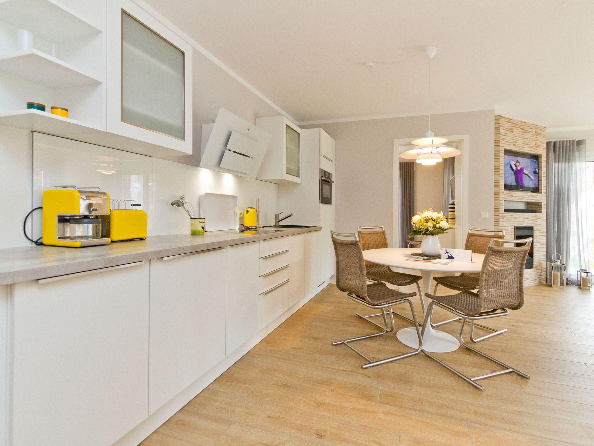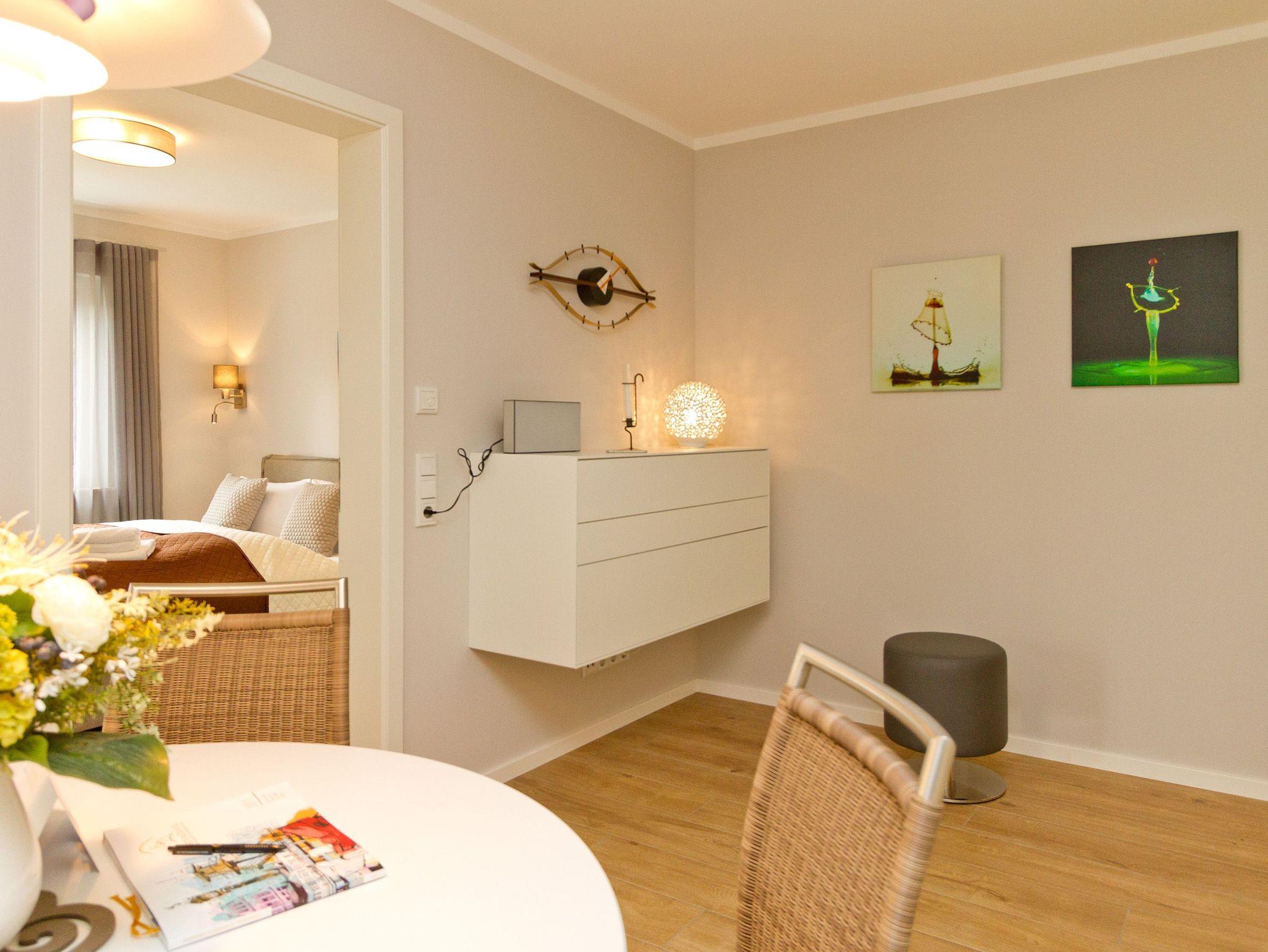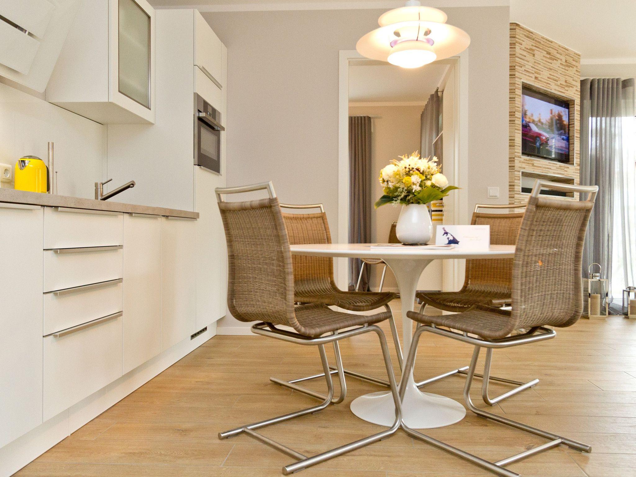 Seine dekorativen und anmutigen Stahlmöbelkonstruktionen gehören zu den Ikonen des Wohndesigns der 1960er Jahre. In dieser stylischen Ferienwohnung Nummer 5 im Erdgeschoss der Dünenresidenz steht nichts Geringeres als eine Warren Plattner-Sitzgruppe mit Armlehnsesseln und Couchtisch im Mittelpunkt des schönen und weiträumigen Wohnbereichs. In den 72 Quadratmetern können bis zu vier Personen nebst einem Kleinkind bis drei Jahre (im Kinderreisebett) mit Stil Urlauben. Und mit jeder Menge Wohlfühlkomfort. So sorgt ein Elektrokamin im Wohnzimmer für eine gemütliche und kuschelige Atmosphäre. Die Wohnung ist geprägt vom Retrolook, der sich auch in der offenen Wohnküche fortsetzt. Ob der große Tulip-Esstisch oder die retroanmutenden Küchengeräte wie Toaster, Kaffeemaschine oder Wasserkocher in diesem Feriendomizil tauchen sie ein in eine andere und absolut trendige Zeit. Herausgenommen aus dem Alltag können Sie sich hier eine ganz besondere Auszeit gönnen. Von der sonnigen Südost-Terrasse aus können Sie die Ostsee rauschen hören. Und nicht nur dort. Sanft legt sie sich auch in den beiden Schlafzimmern in die Träume. Lassen Sie sich fallen in die komfortablen Boxspringbetten (1,80 m x 2,00 m). In jedem Schlafzimmer wie auch im Wohnzimmer gibt es Flat-TVs. Ein ganz besonderes Highlight dieses Appartements ist die Panorama-Sauna im Bad. Waschtisch, Toilette und eine geräumige Dusche gehören genauso zur Ausstattung wie Bettwäsche und Handtücher, die für Sie bereit liegen. Die Wohnung hat einen Pkw-Stellplatz in der Tiefgarage (max. Einfahrtshöhe 1,85 m).
